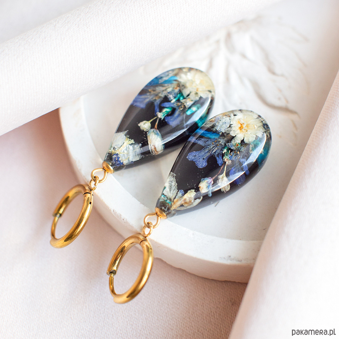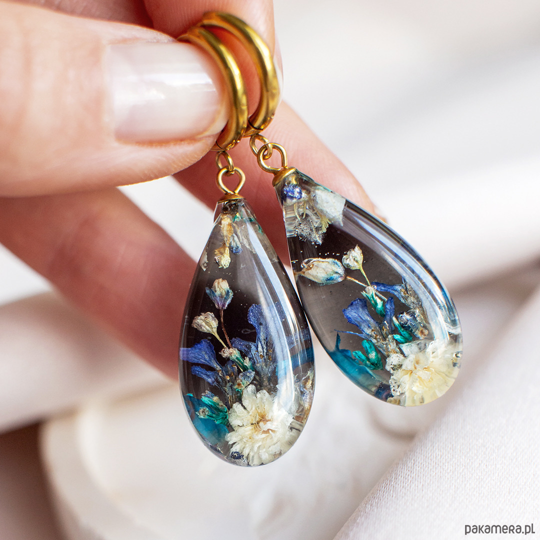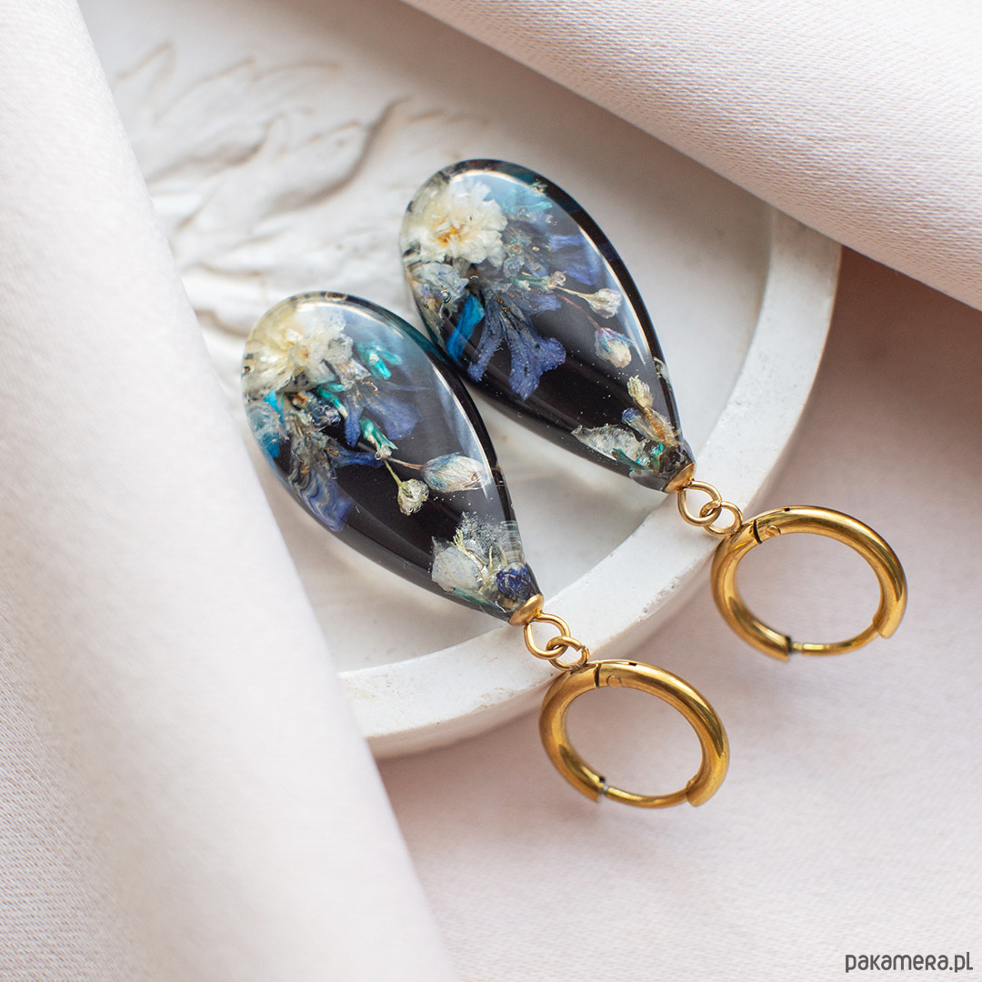 Kolczyki wykonany jest z żywicy epoksydowej z wykorzystaniem suszonych kwiatów. Metalowe elementy to stal nierdzewna szlachetna chirurgiczna.