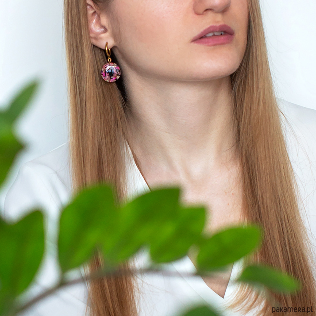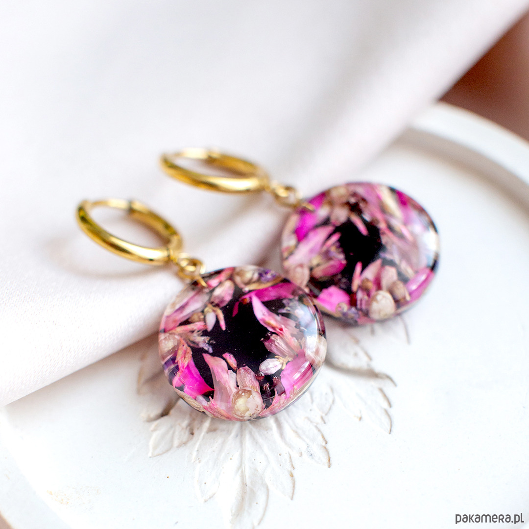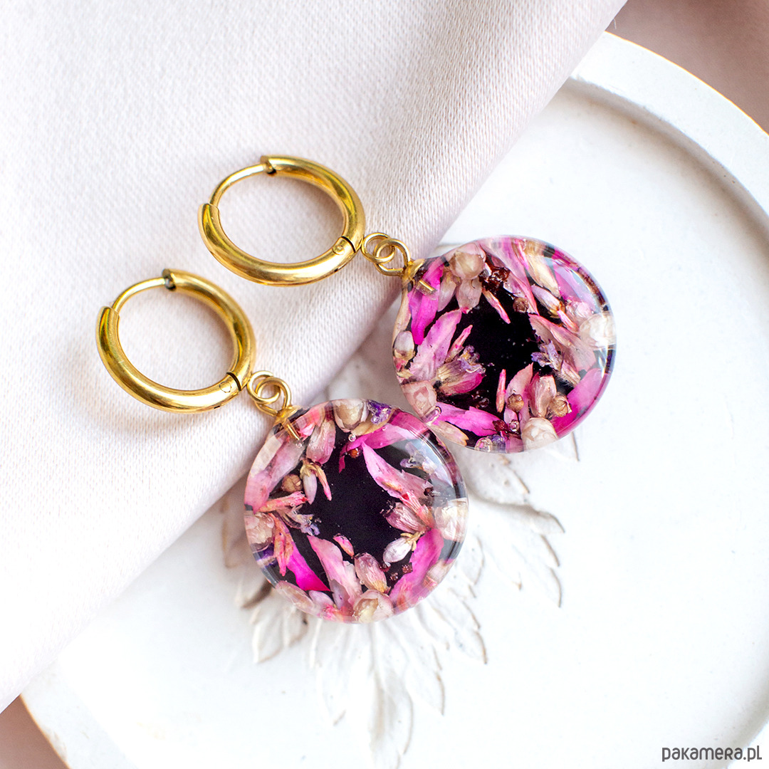 Kolczyki wykonany jest z żywicy epoksydowej z wykorzystaniem suszonych kwiatów. Metalowe elementy to stal nierdzewna szlachetna chirurgiczna.