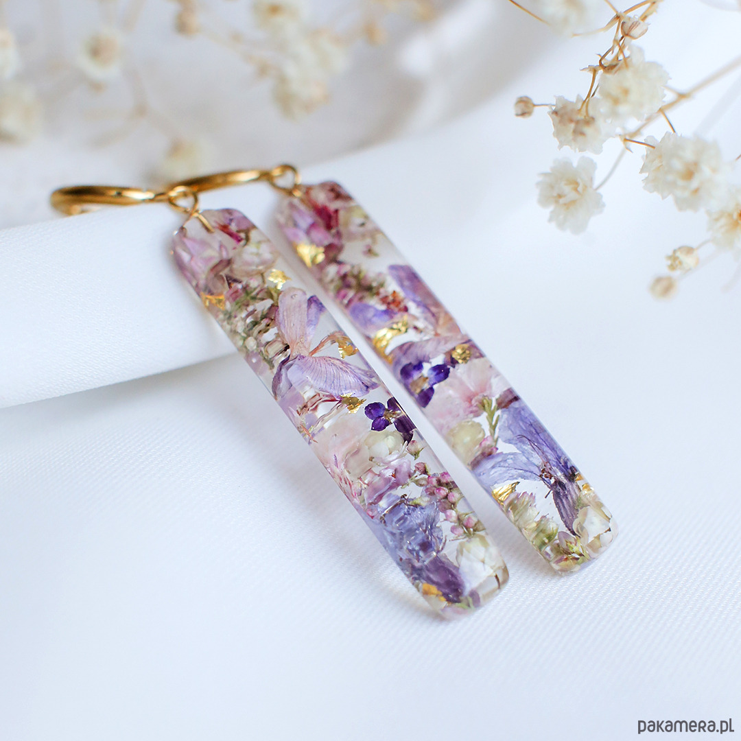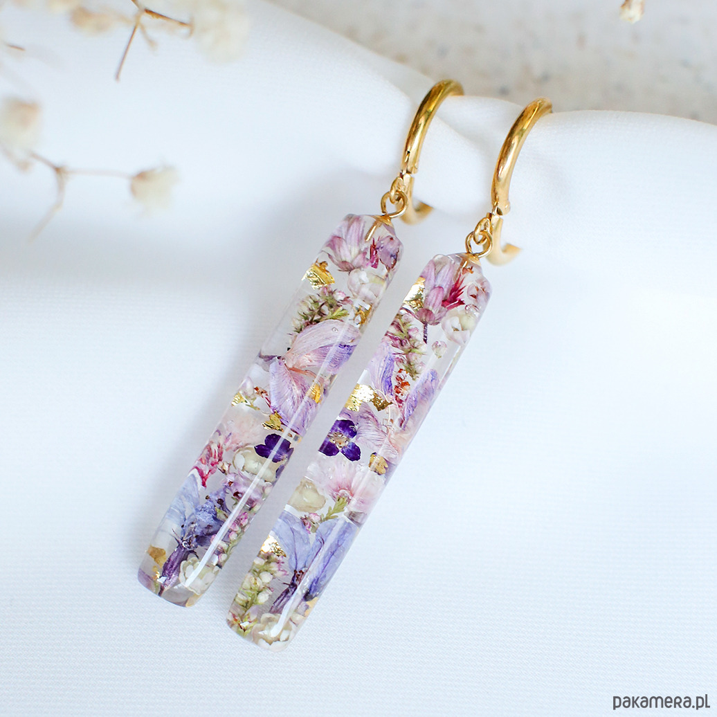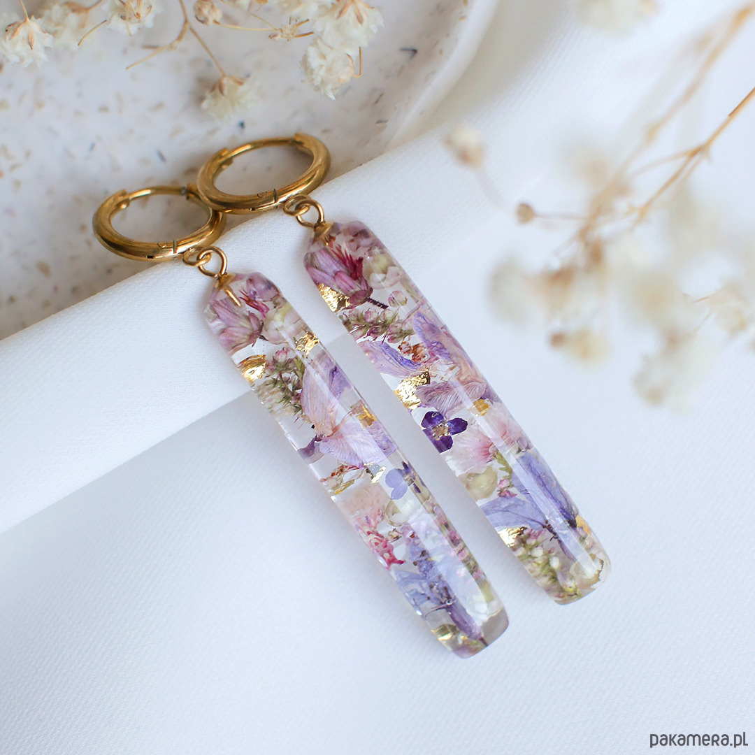 Kolczyki wykonany jest z żywicy epoksydowej z wykorzystaniem suszonych kwiatów. Metalowe elementy to stal nierdzewna szlachetna chirurgiczna.