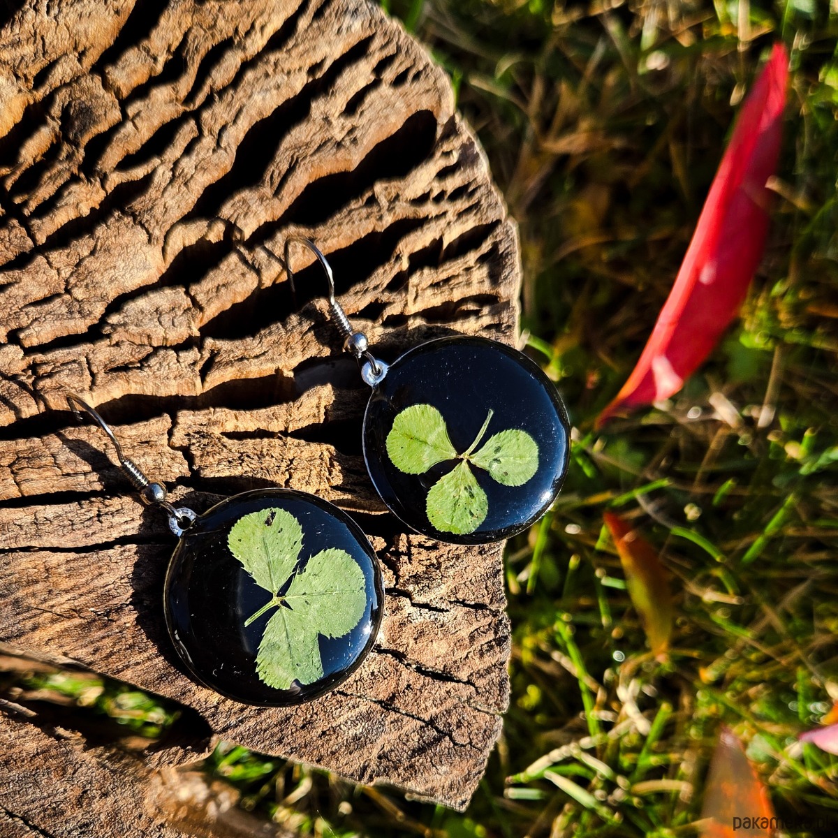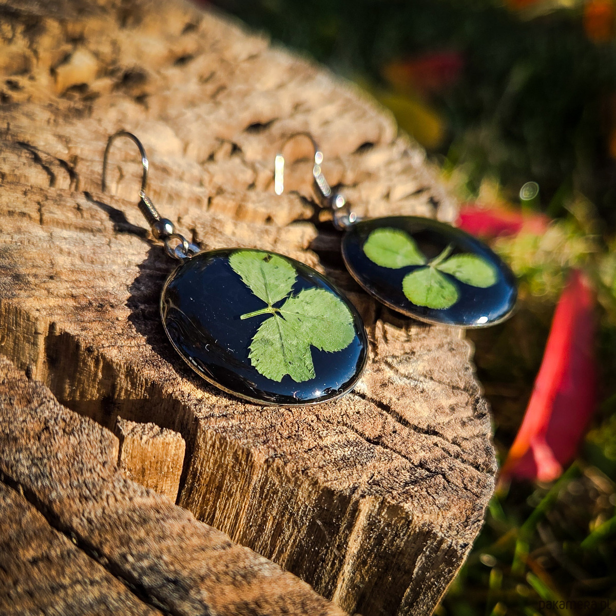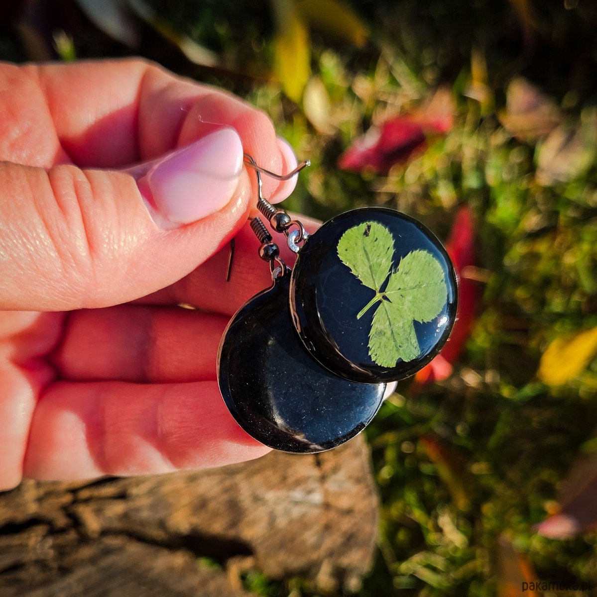 Kolczyki z koniczyną zatopioną w żywicy epoksydowej.