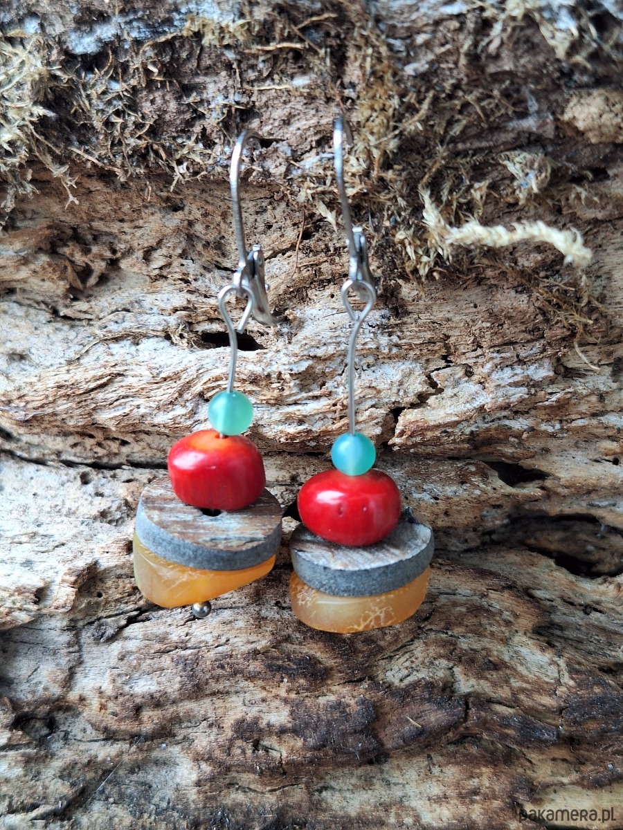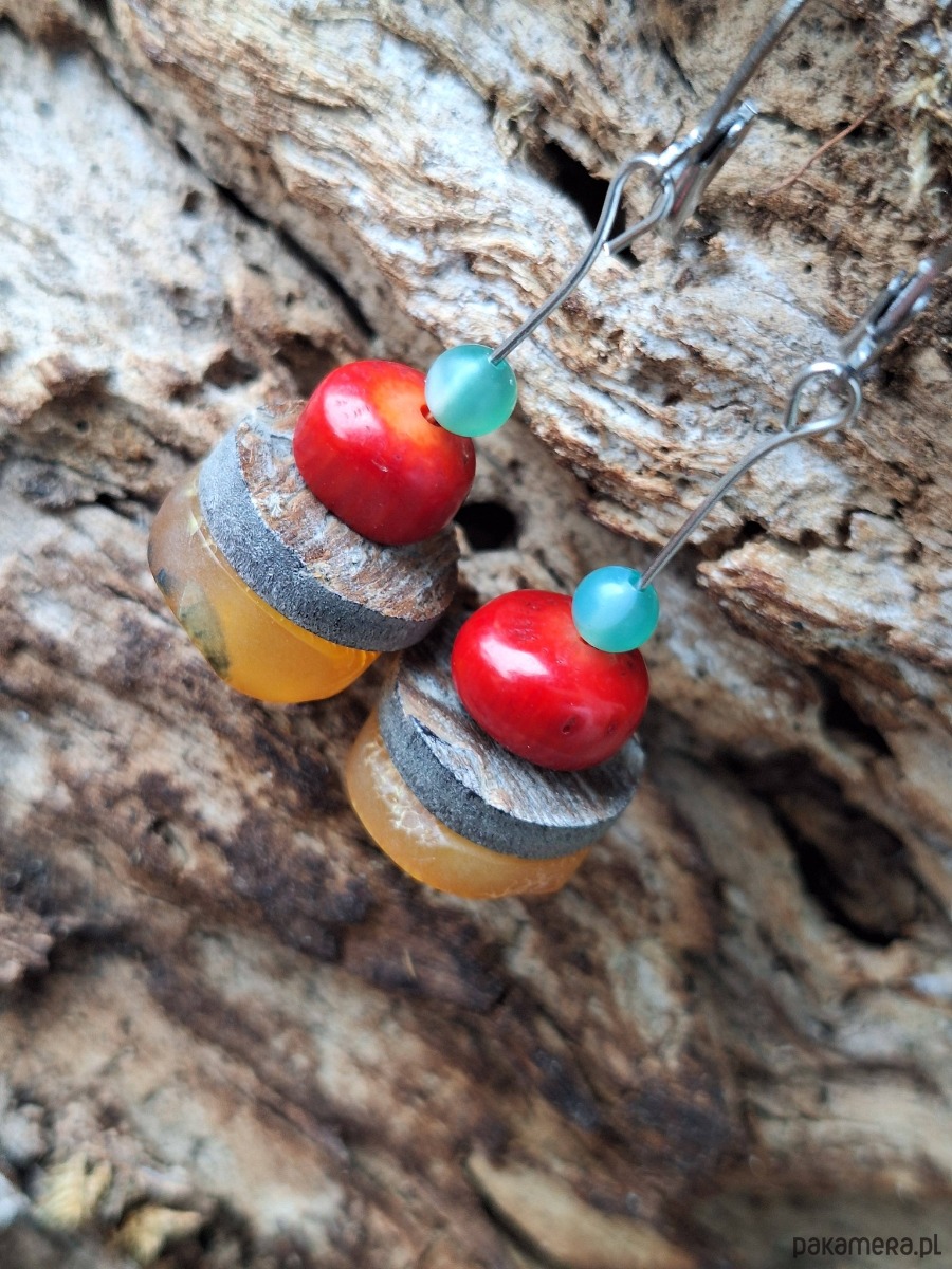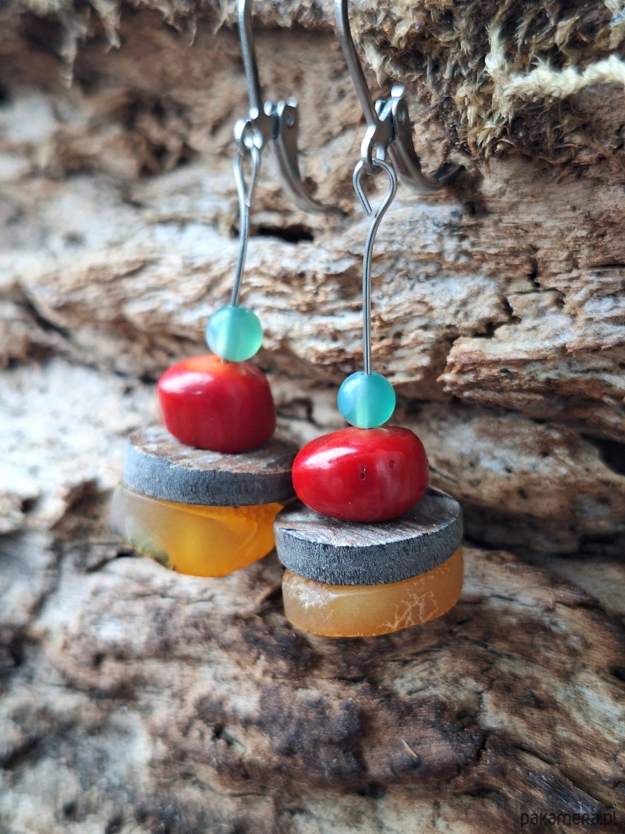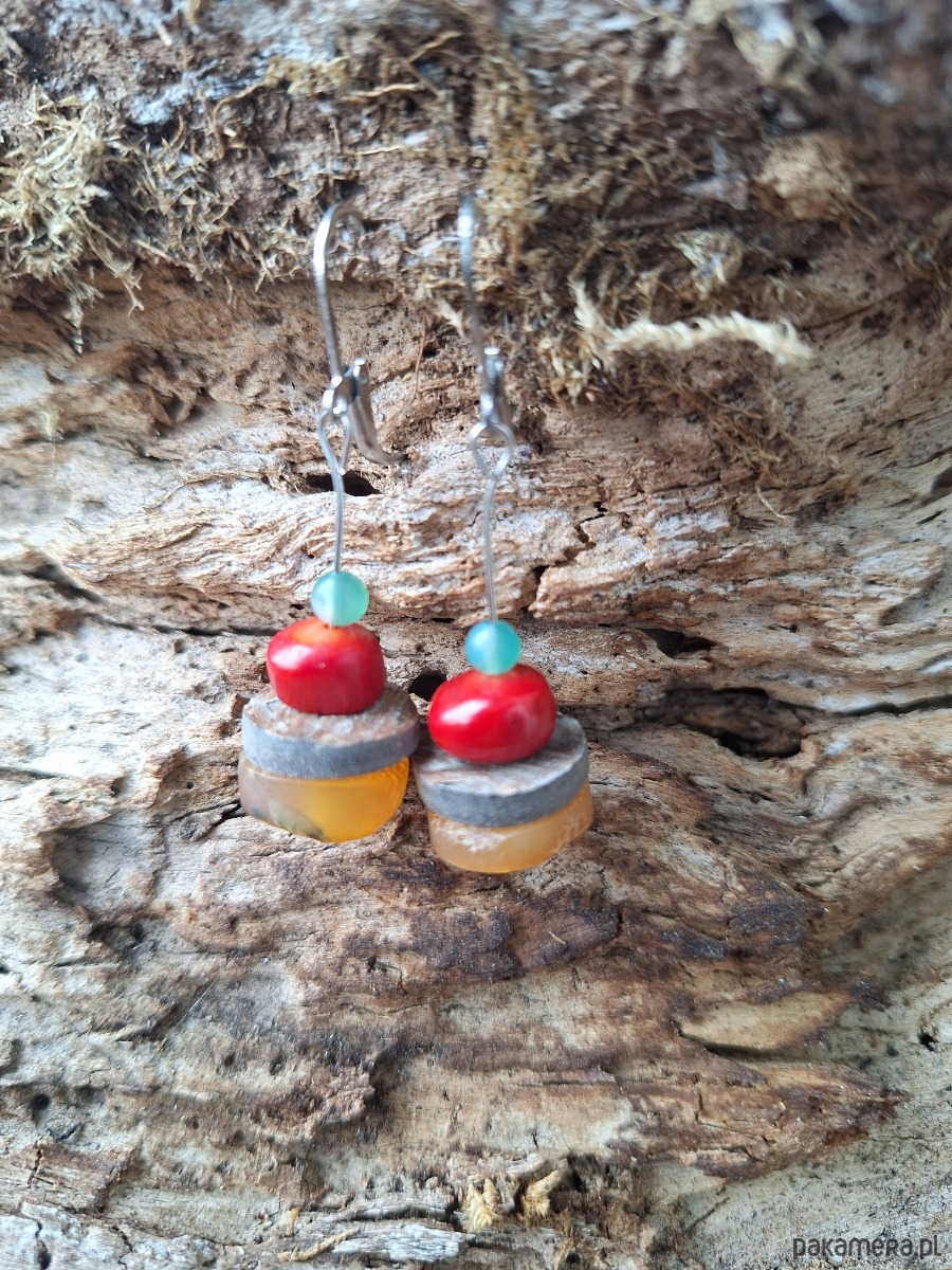 Kolczyki wykonane z naturalnego korala i bursztynu , muszli szarej i agatu