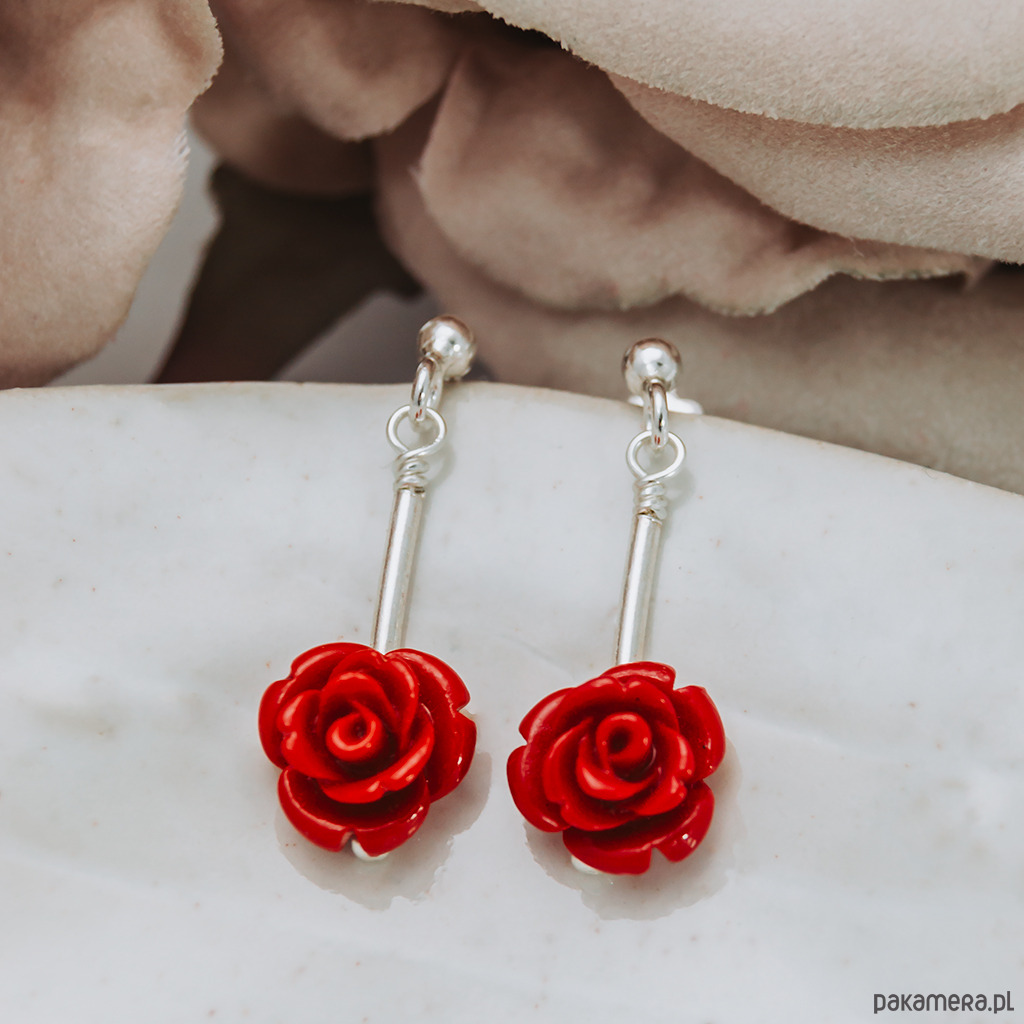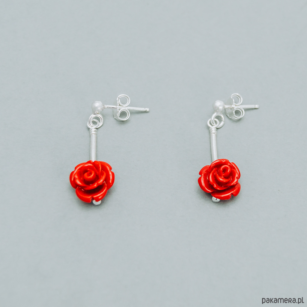 Kolczyki wykonane w naszej pracowni w Polsce. Te subtelne kolczyki wykonane zostały ze srebra z różyczką z korala w kolorze czerwonym. Wygodne bigle sztyfty dobrze trzymają się na uszach.