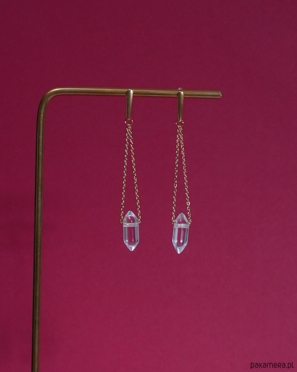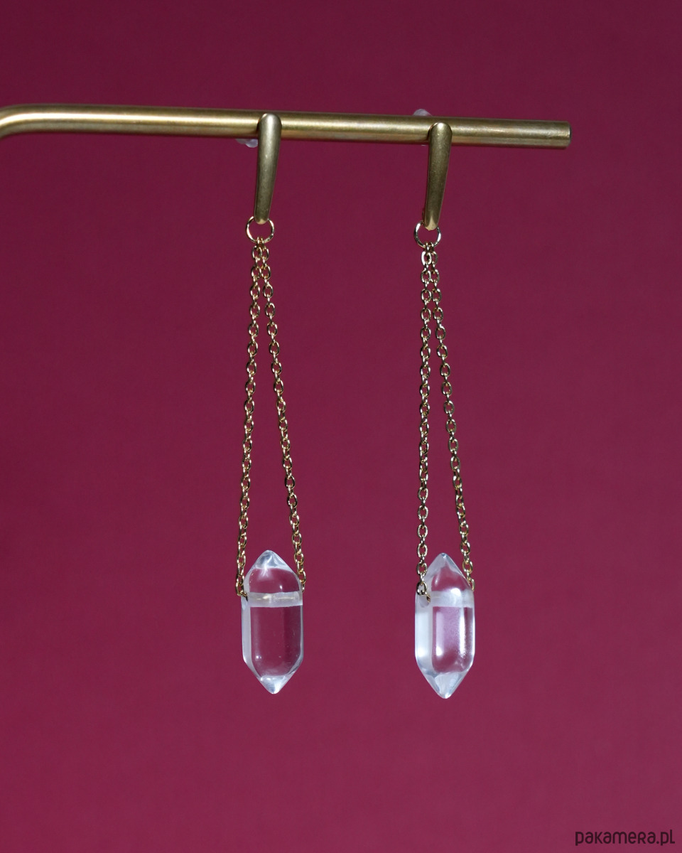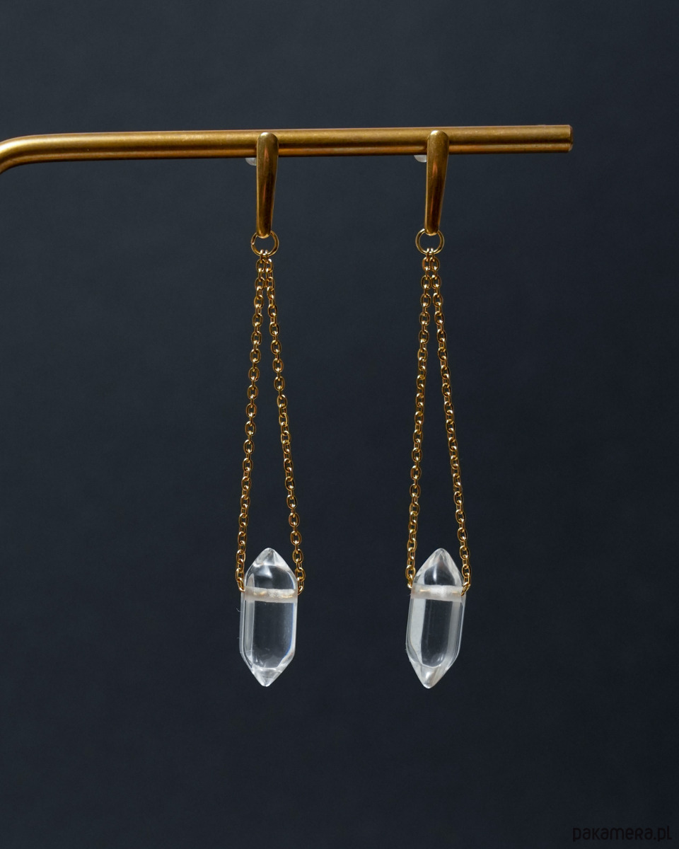 Delikatne i efektowne kolczyki z czystym KRYSZTAŁEM GÓRSKIM w kształcie grota, zawieszonym na delikatnym łańcuszku ze STALI SZLACHETNEJ. Ozdobne, podłużne sztyfty również wykonane są ze stali szlachetnej.