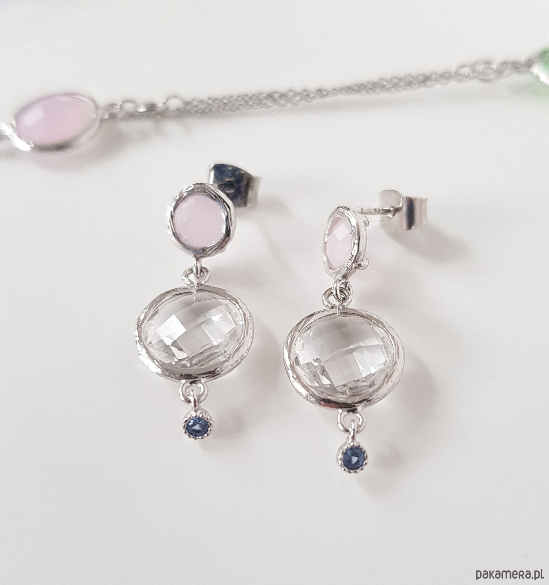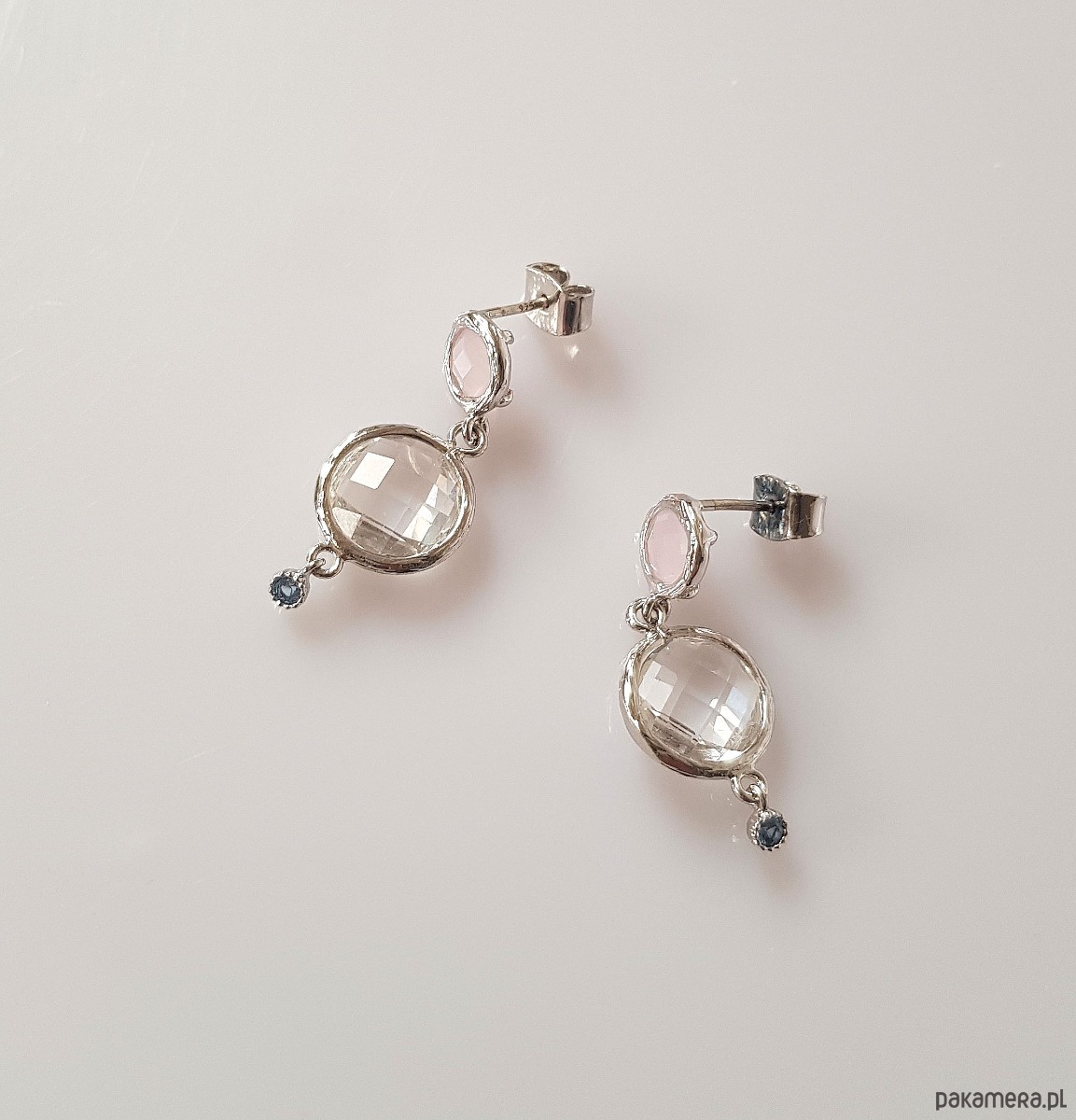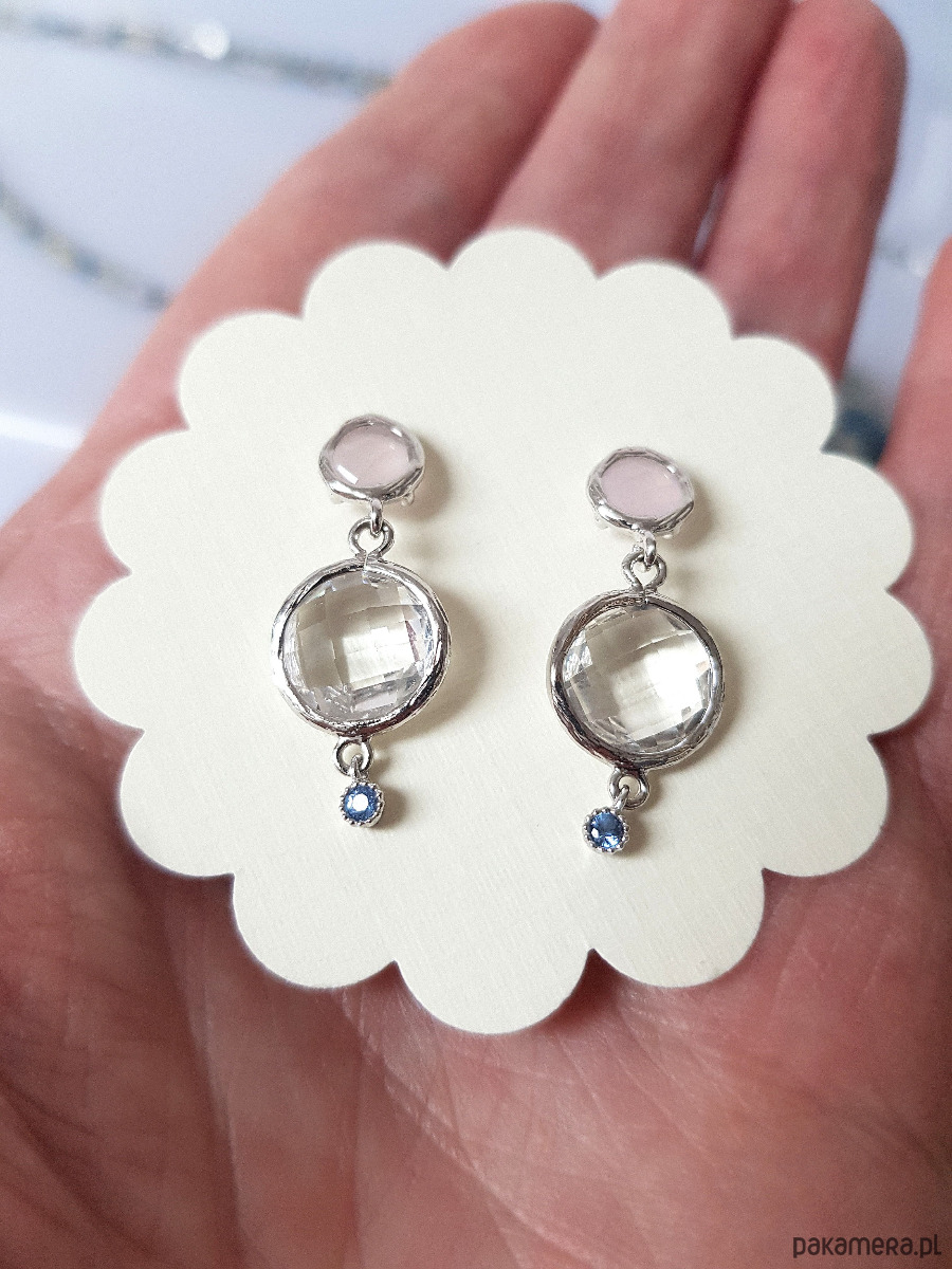 Wykonane z mosiądzu platerowanego rodem, nieprzejrzystego różowego kryształu, przejrzystego kryształu i malutkiej cyrkonii w jasno szafirowym kolorze. Sztyft do ucha ze srebra.