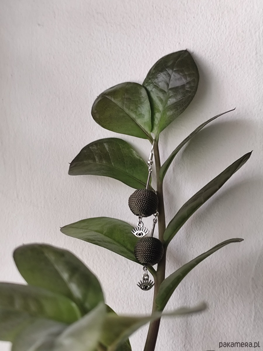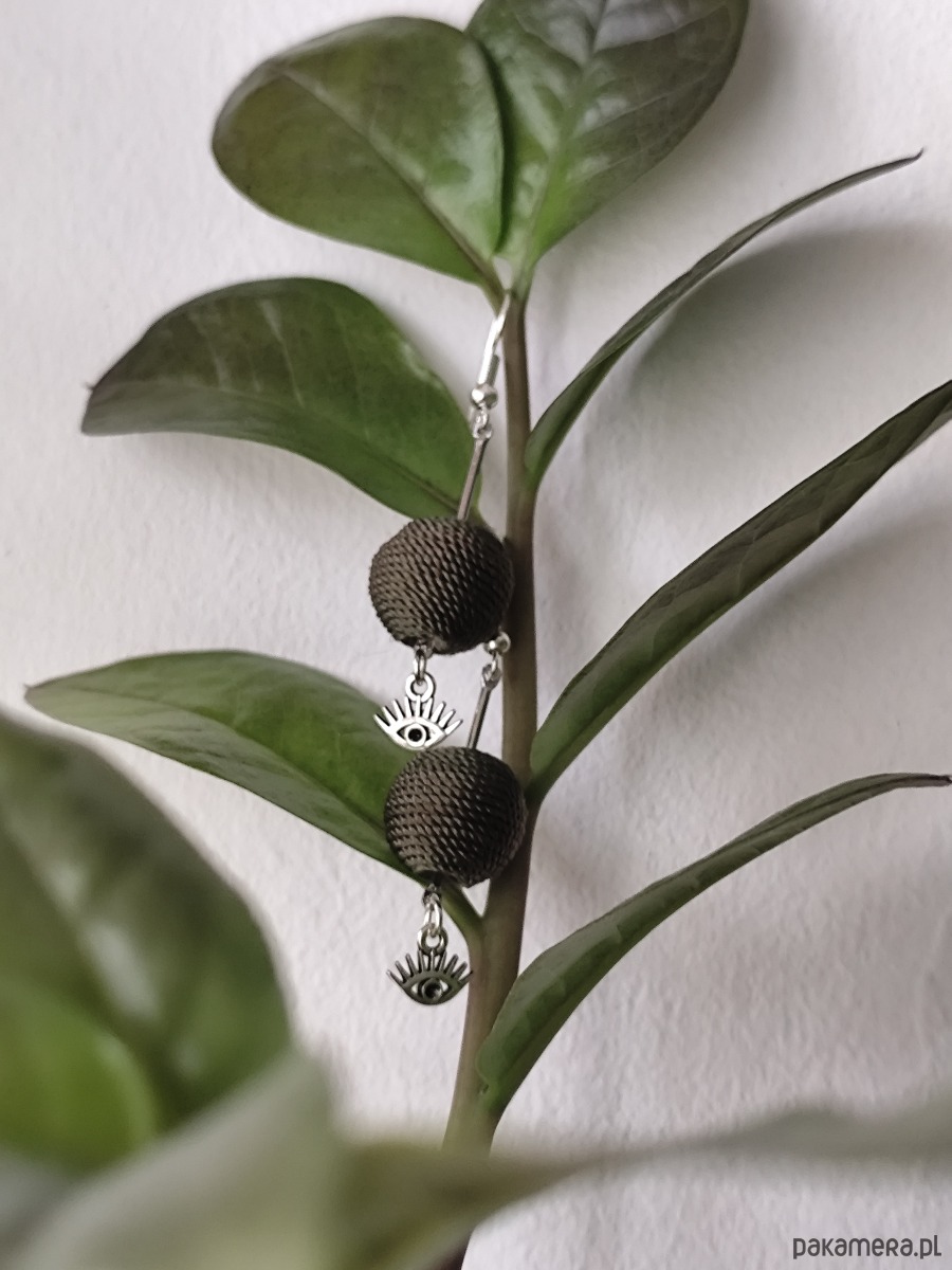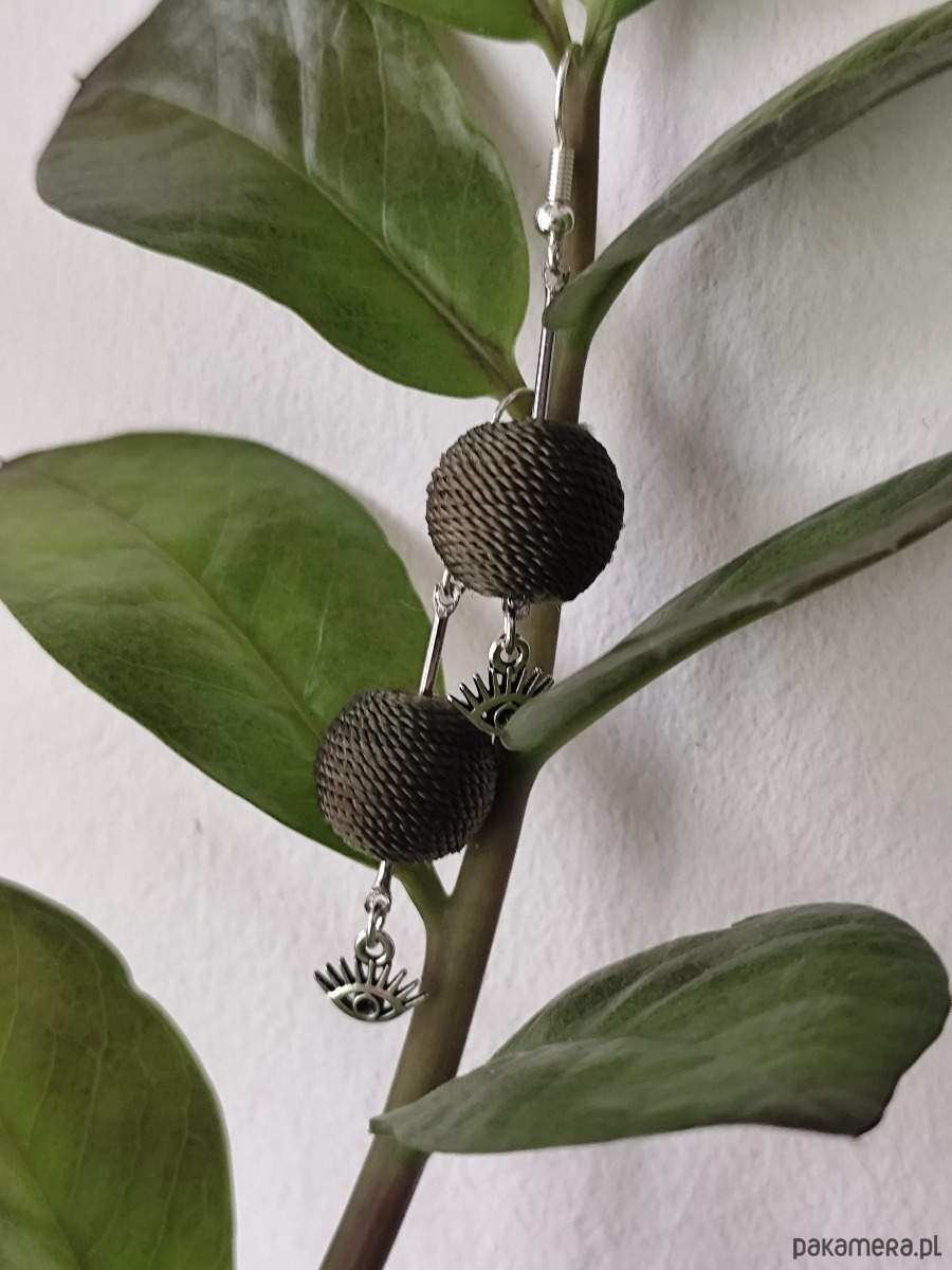 Efektowne, wiszące kolczyki w srebrnym kolorze z ozdobnym oczkiem i niezwykle uroczą kuleczką. Koralik w formie kuleczki wykonany ze sznurka w kolorach zieleni (ombre) 🌿