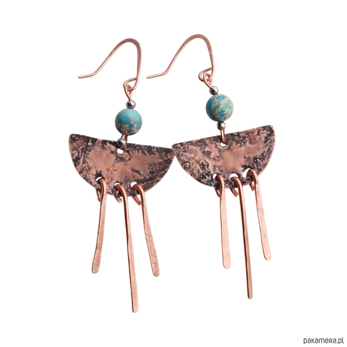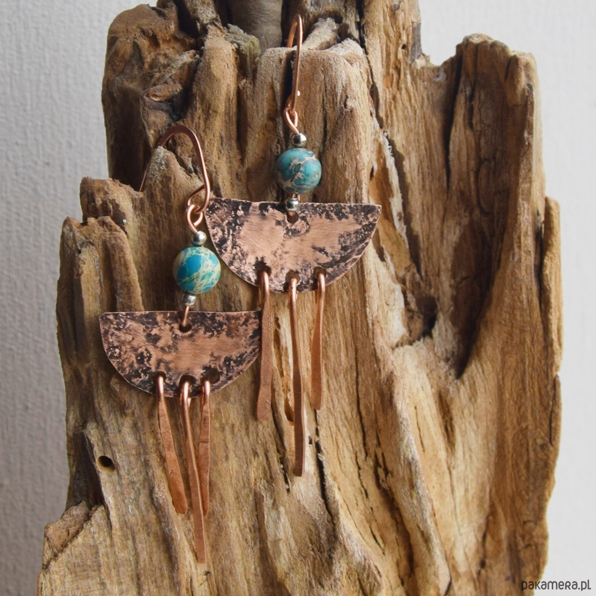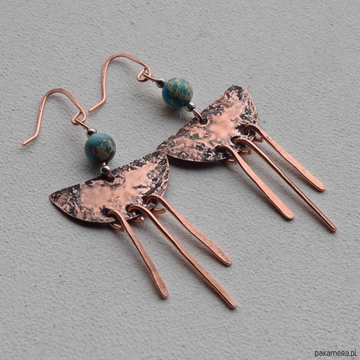 Kolczyki wykonane z kutej, oksydowanej miedzi, częściowo przecieranej papierem ściernym, o surowym charakterze stylizowanym na stary, "wykopaliskowy" metal, w połączeniu z jaspisem cesarskim. Bigle wykonane z czystej miedzi.