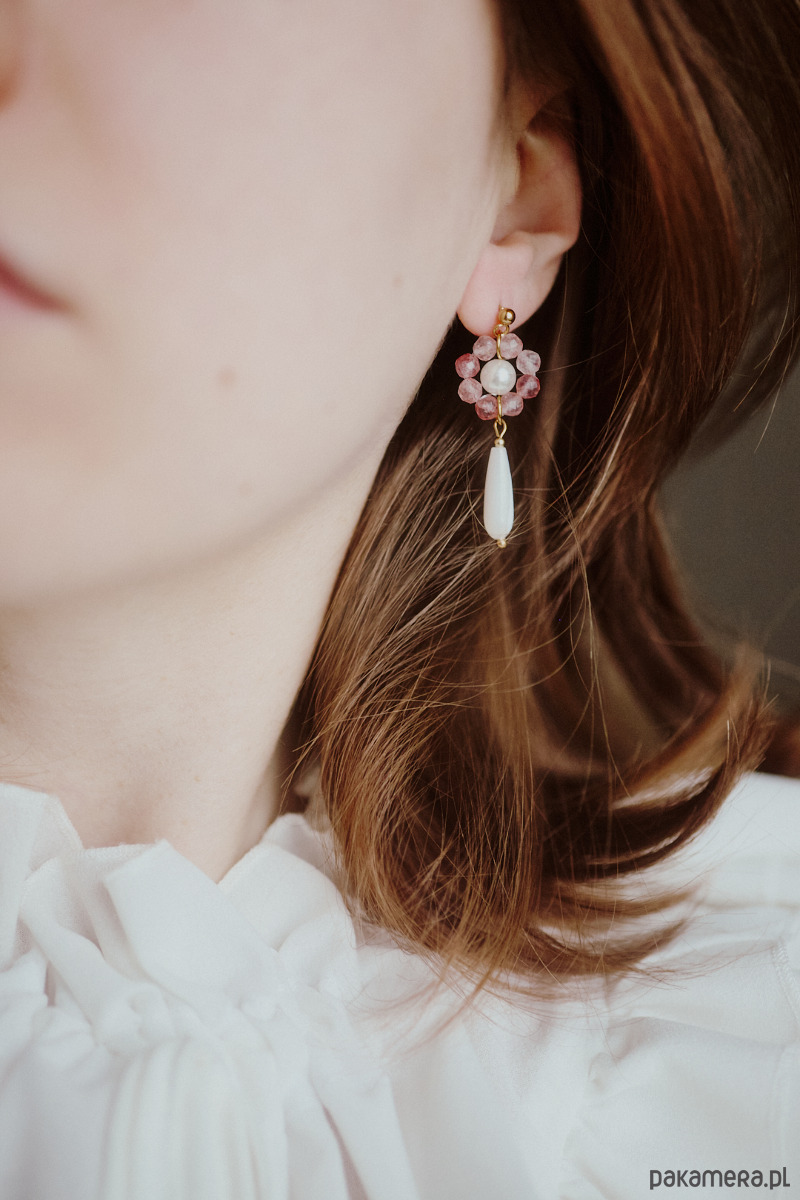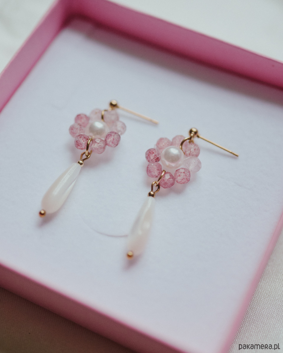Kolczyki w stylu koreańskim. Kwiaty z łezkami. Wykonane z kwarcu truskawkowego, masy perłowej i szkła.