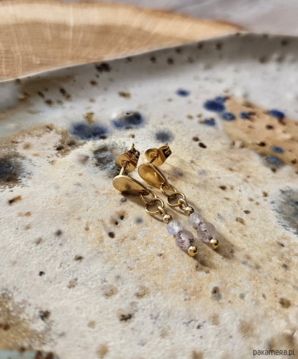Niezwykle delikatne i romantyczne kolczyki z dwoma minerałami: kwarcem truskawkowym w kształcie monetki i mniejszym, fasetowanym labradorytem. Łączą w sobie bardzo delikatny odcień pudrowego różu i szarości. Nie brakuje w nich lekkiego błysku (to zasługa labradorytu) i intrygujących wzorów, jakimi charakteryzuje się kwarc truskawkowy.