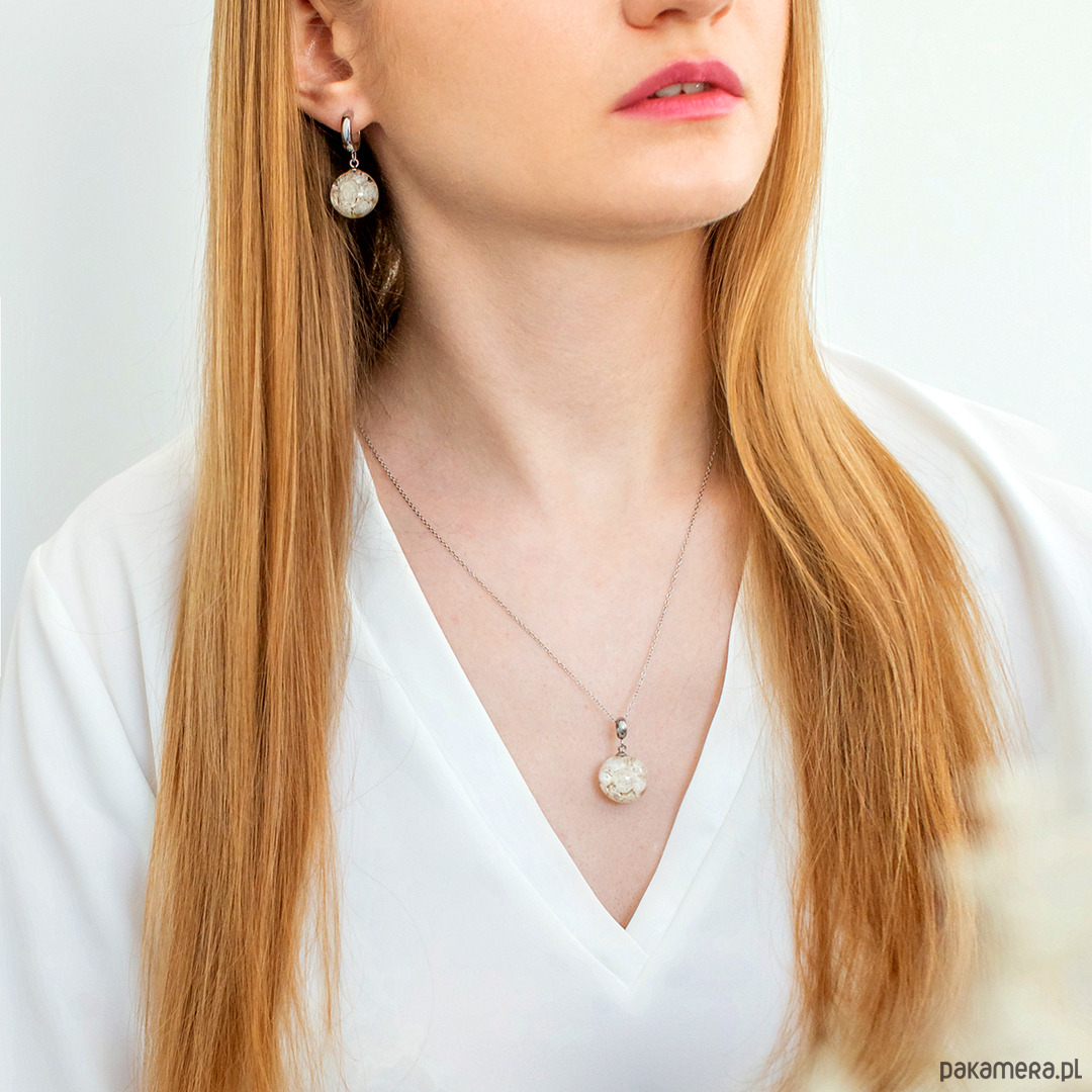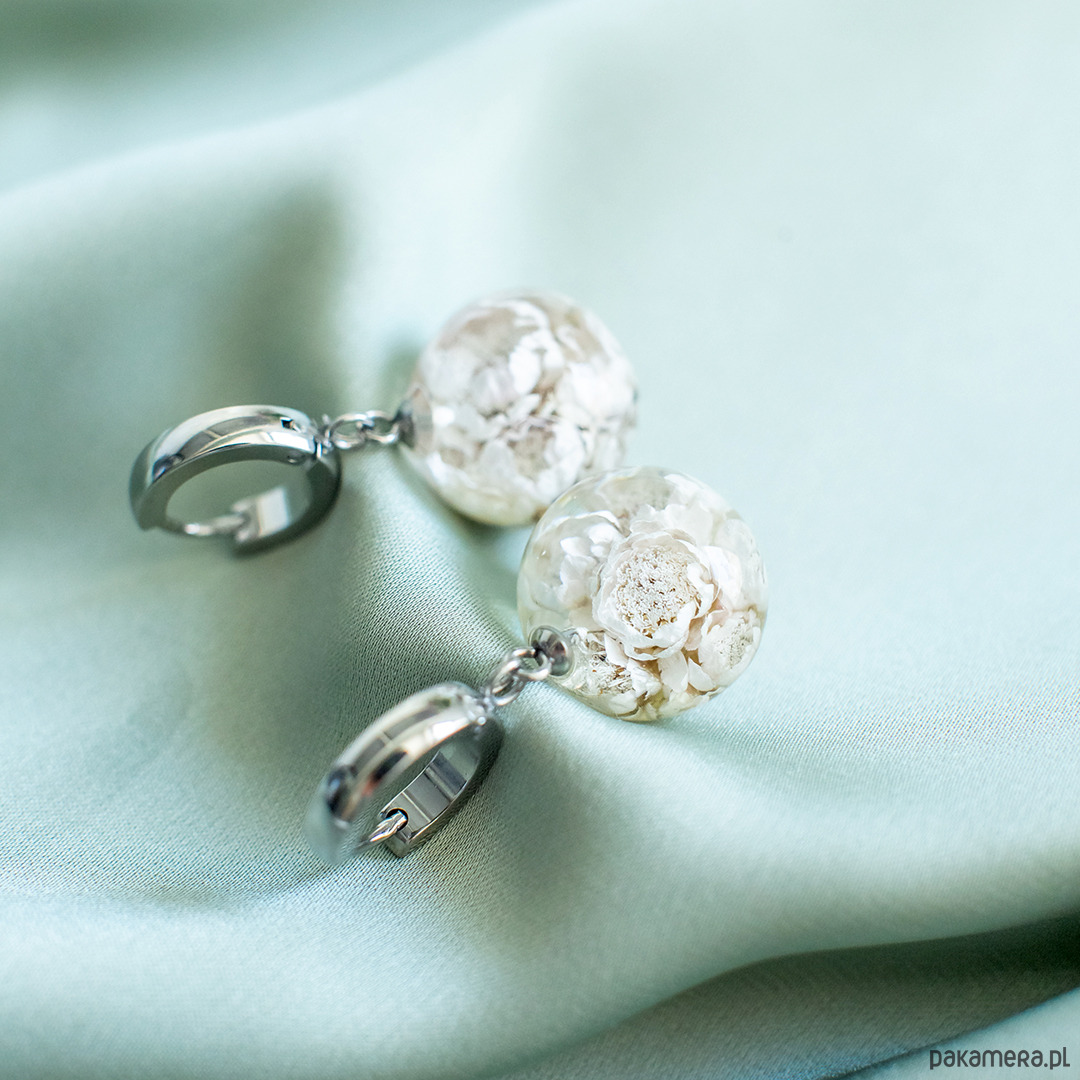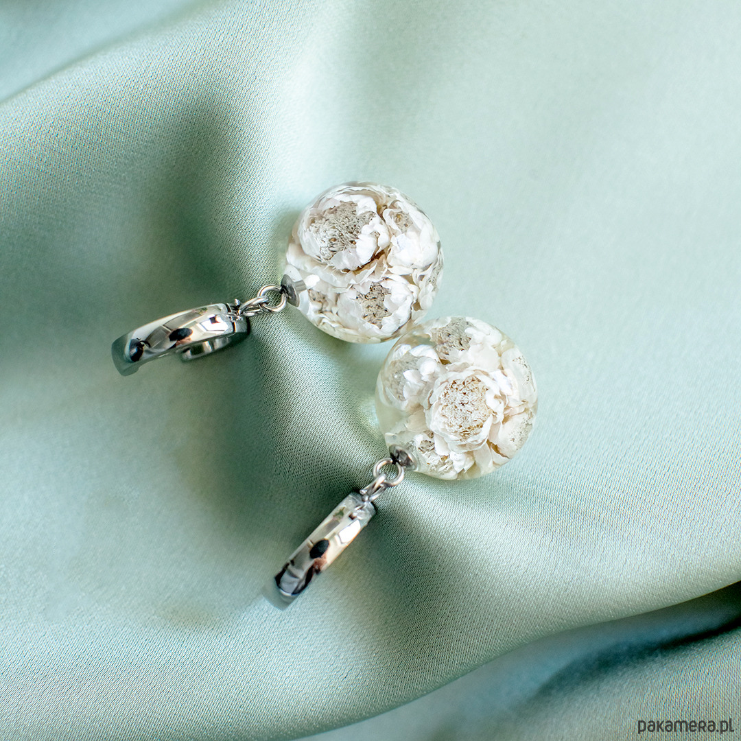 Kolczyki wykonany jest z żywicy epoksydowej z wykorzystaniem suszonych kwiatów. Metalowe elementy to stal nierdzewna szlachetna chirurgiczna.