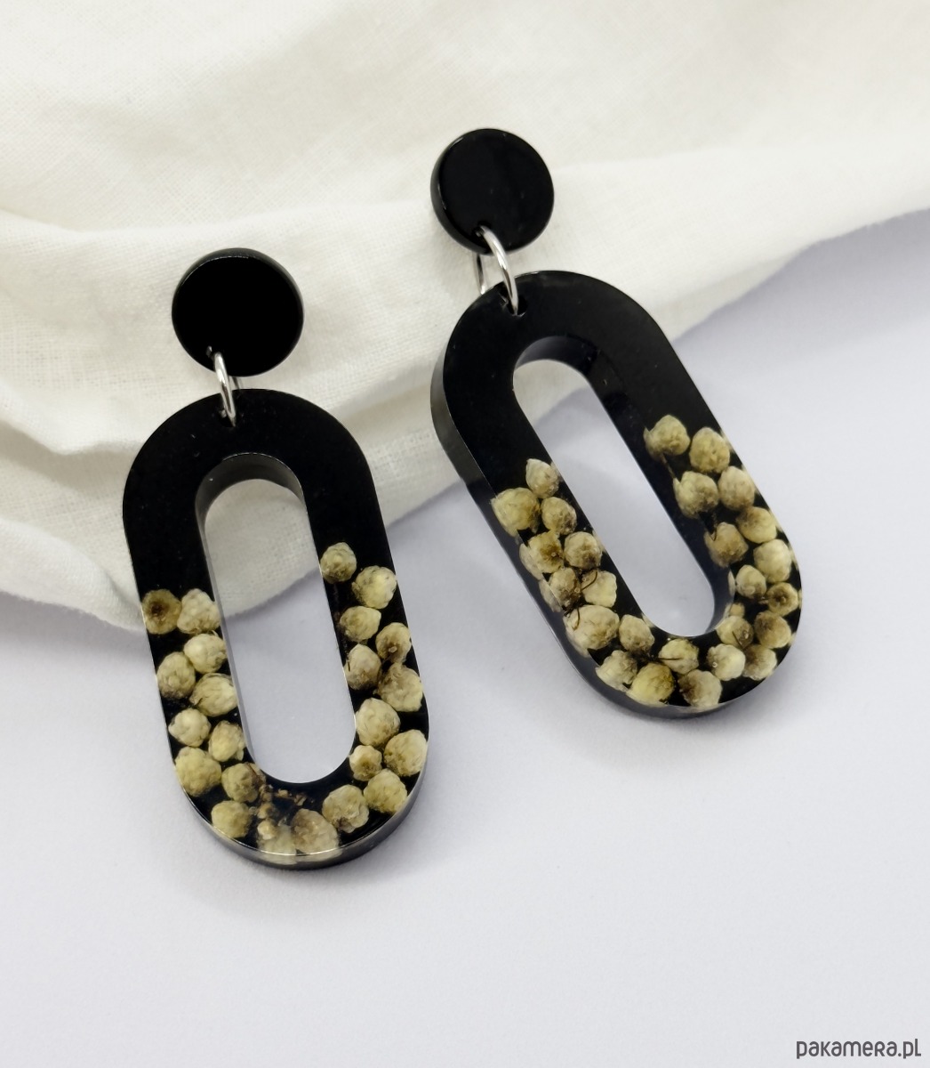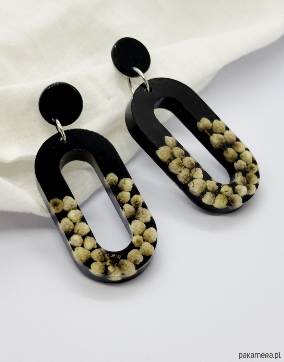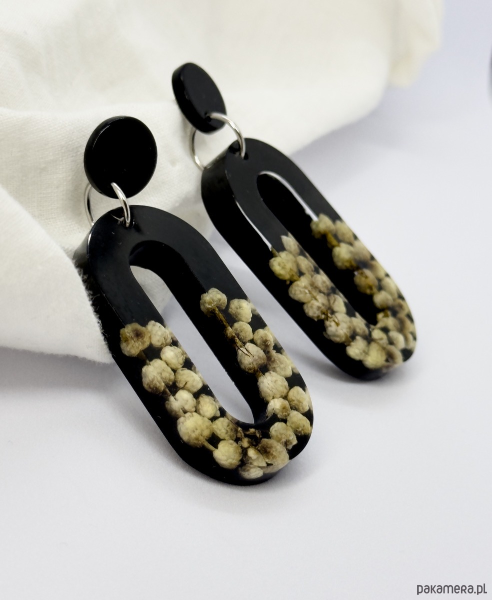 Kolczyki z kwiatami, duże czarne kolczyki, kolczyki z białymi kwiatami