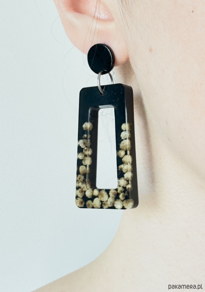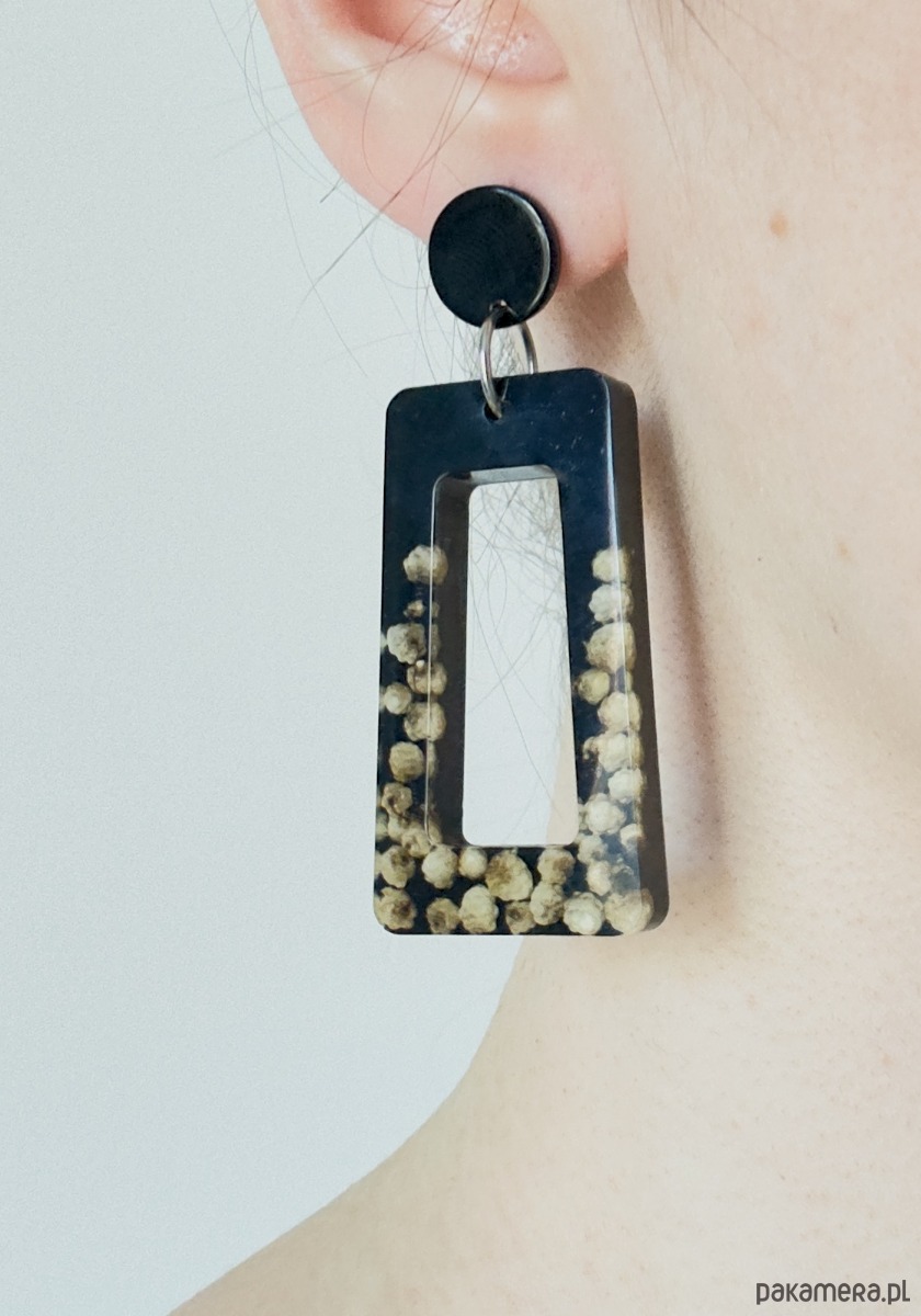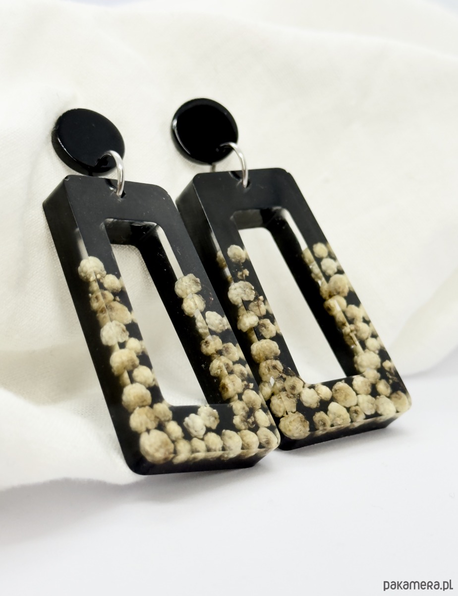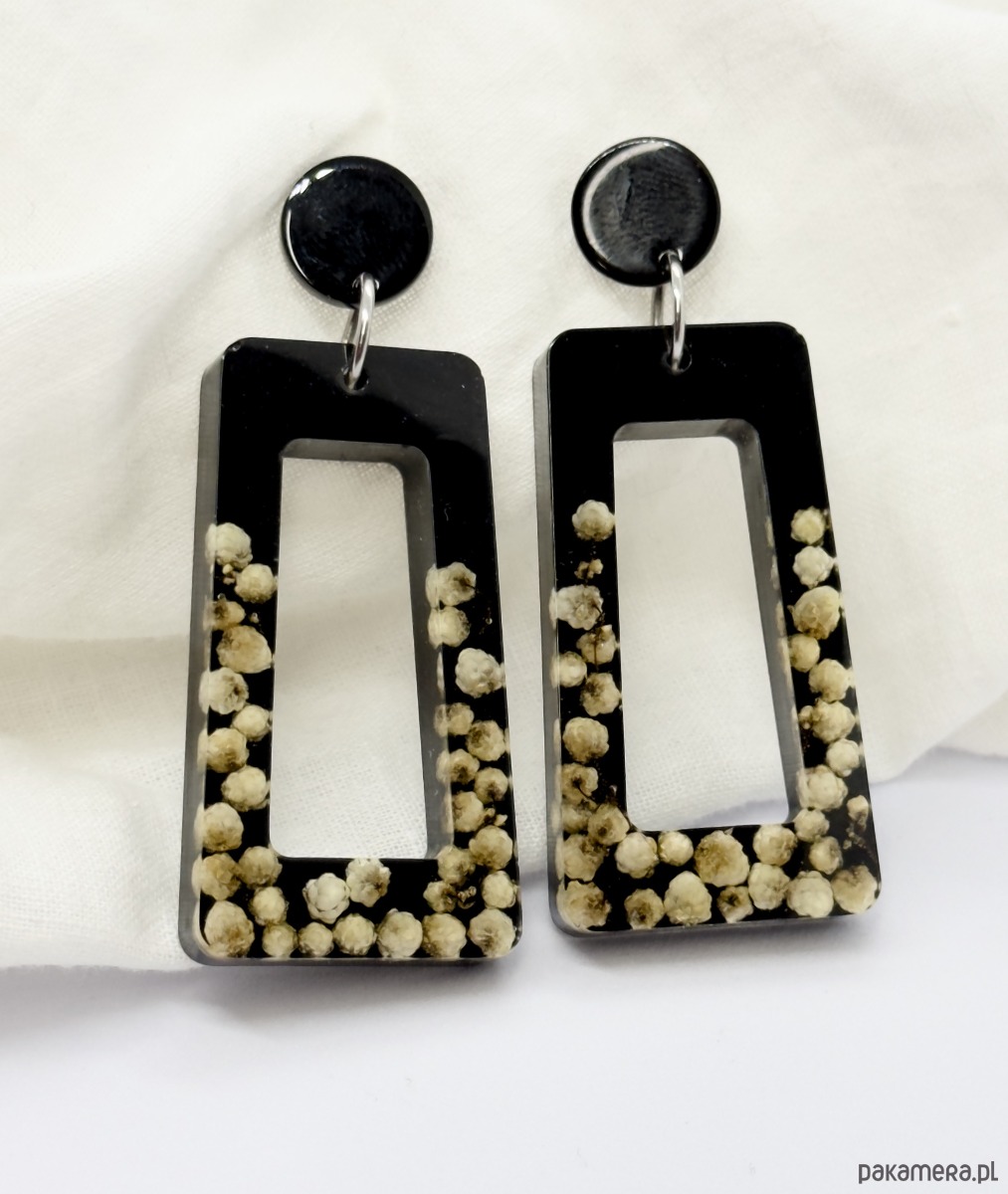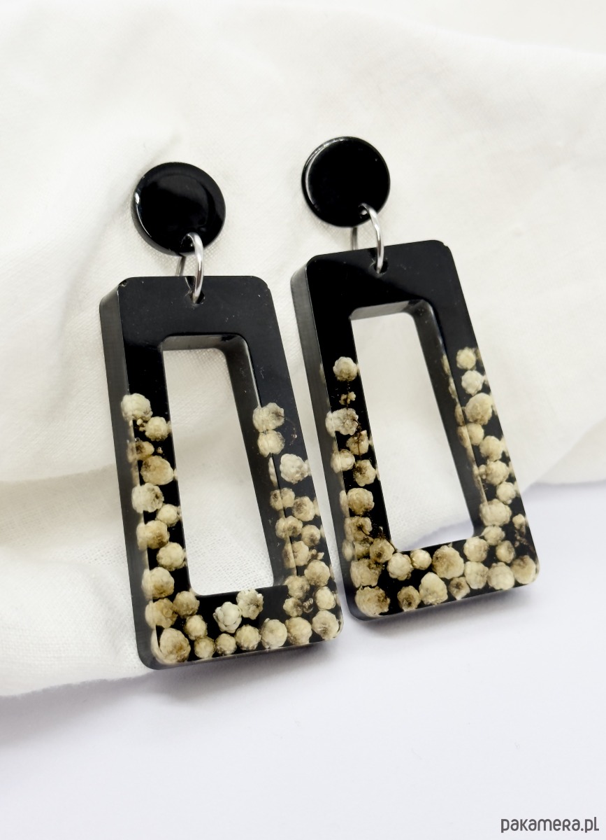 Kolczyki z kwiatami, duże czarne kolczyki, kolczyki z białymi kwiatami