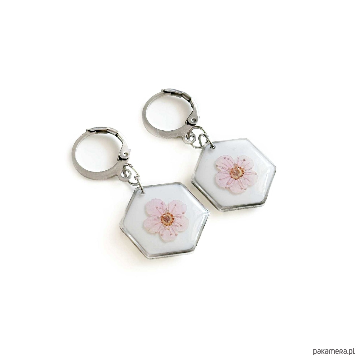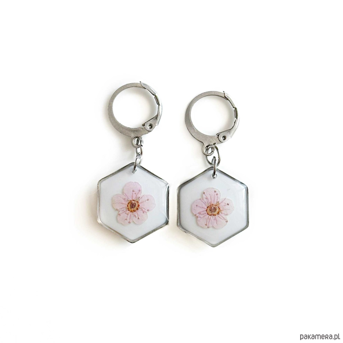 Kolczyki wiszące wykonane ze stali szlachetnej oraz żywicy epoksydowej.