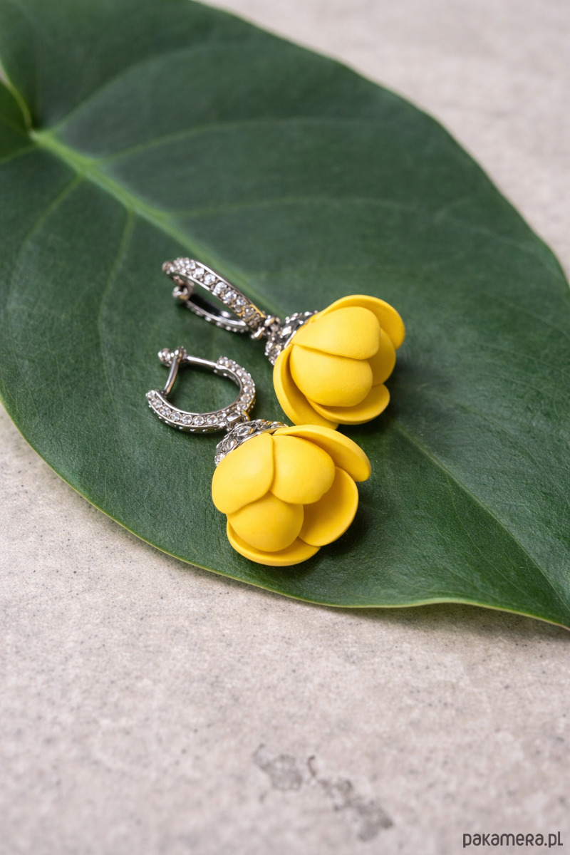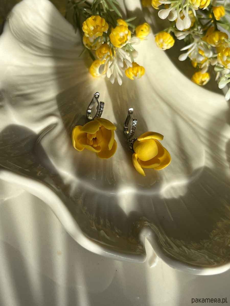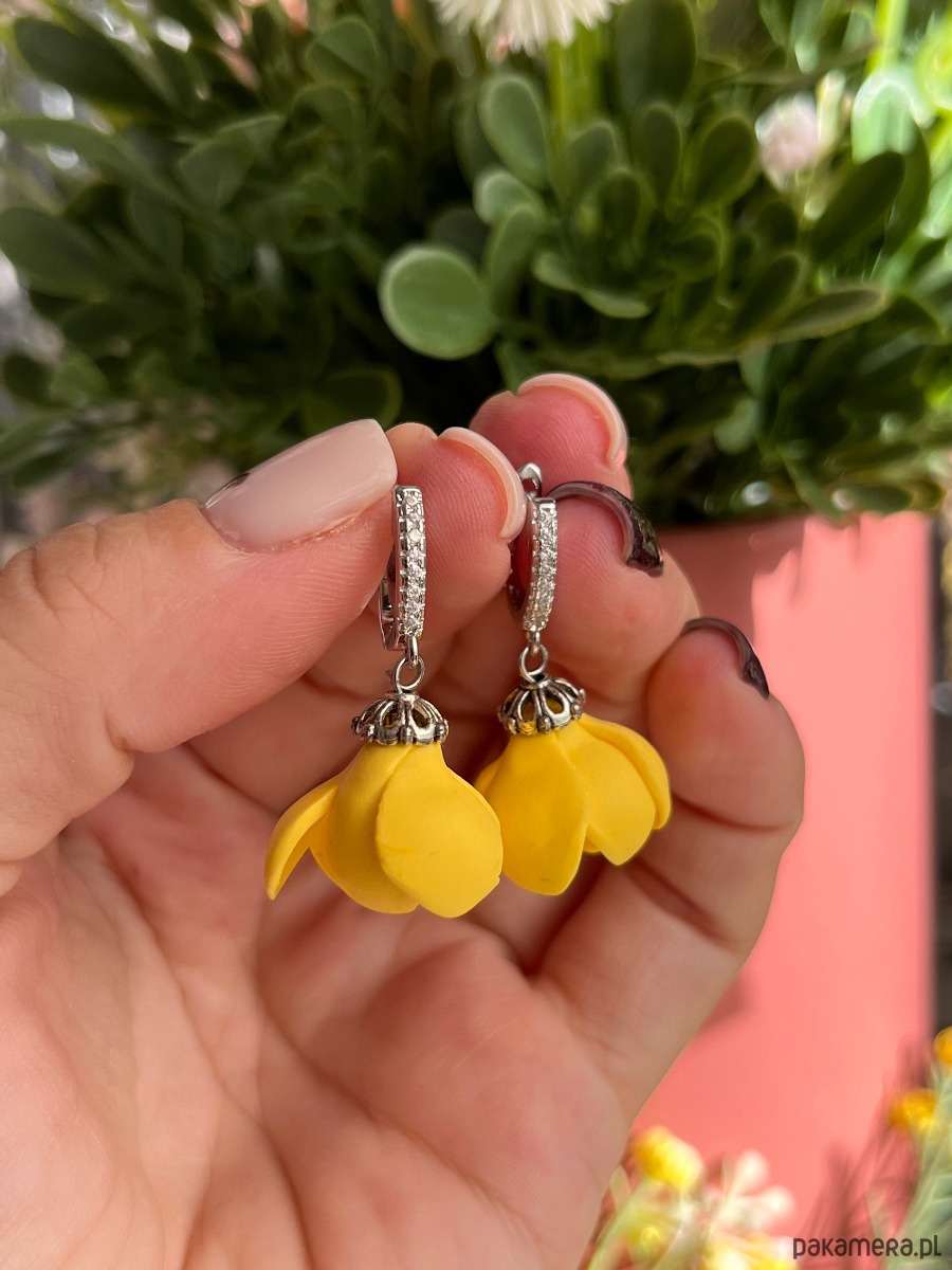 Kolczyki z krokusami w intensywnym żółtym kolorze, ręcznie wykonane z dbałością o każdy detal. Trójwymiarowe kwiaty krokusa o matowym wykończeniu pięknie kontrastują z eleganckimi, srebrzystymi zapięciami typu koła, ozdobionymi drobnymi cyrkoniami.