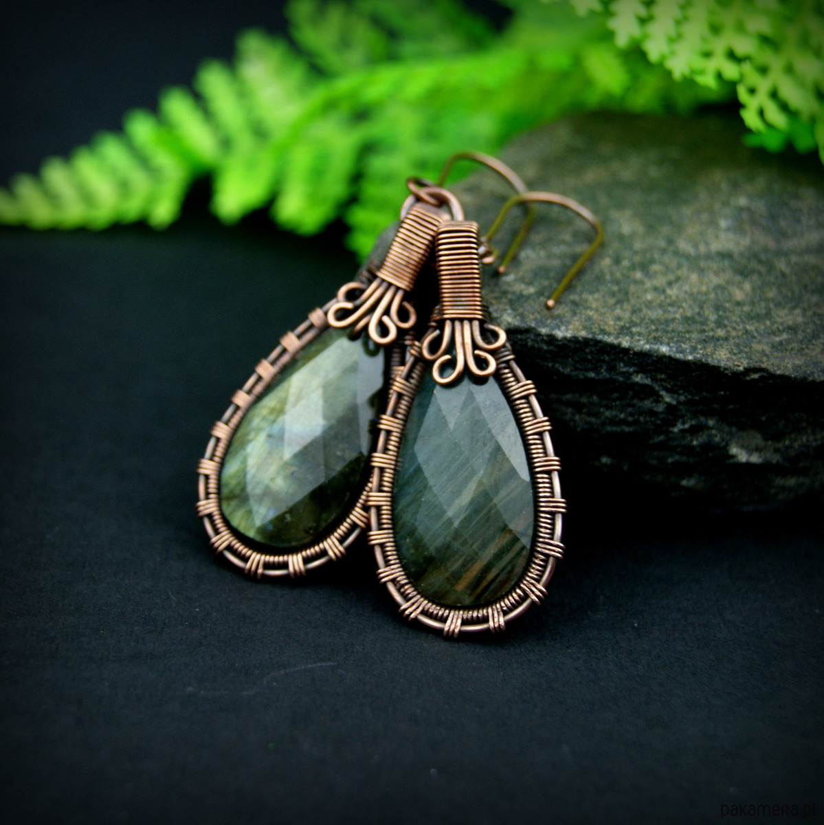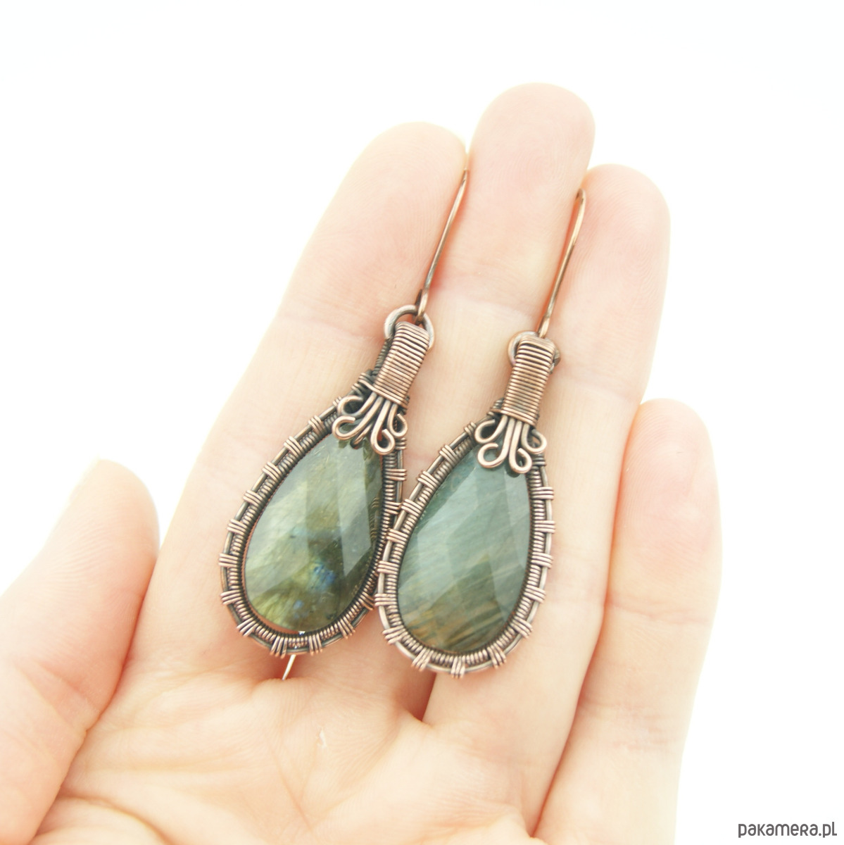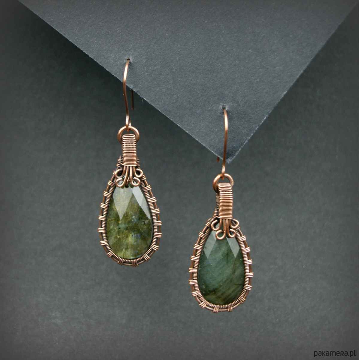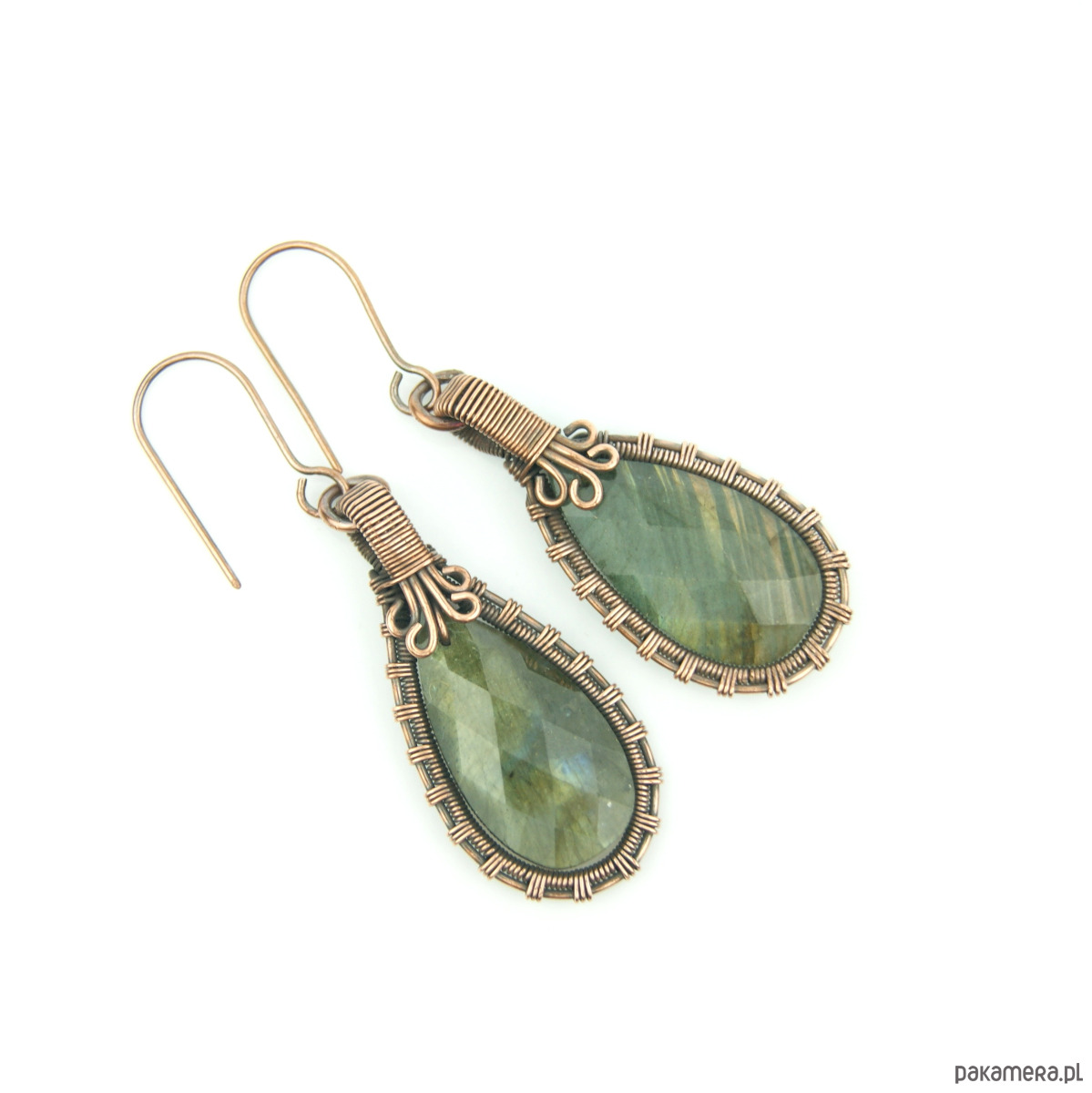 Wiszące kolczyki w całości wykonane z miedzi. Podstawę kolczyków są fasetowane kamienie labradorytu, całość misternie opleciona miedzią. Biżuteria oksydowana.