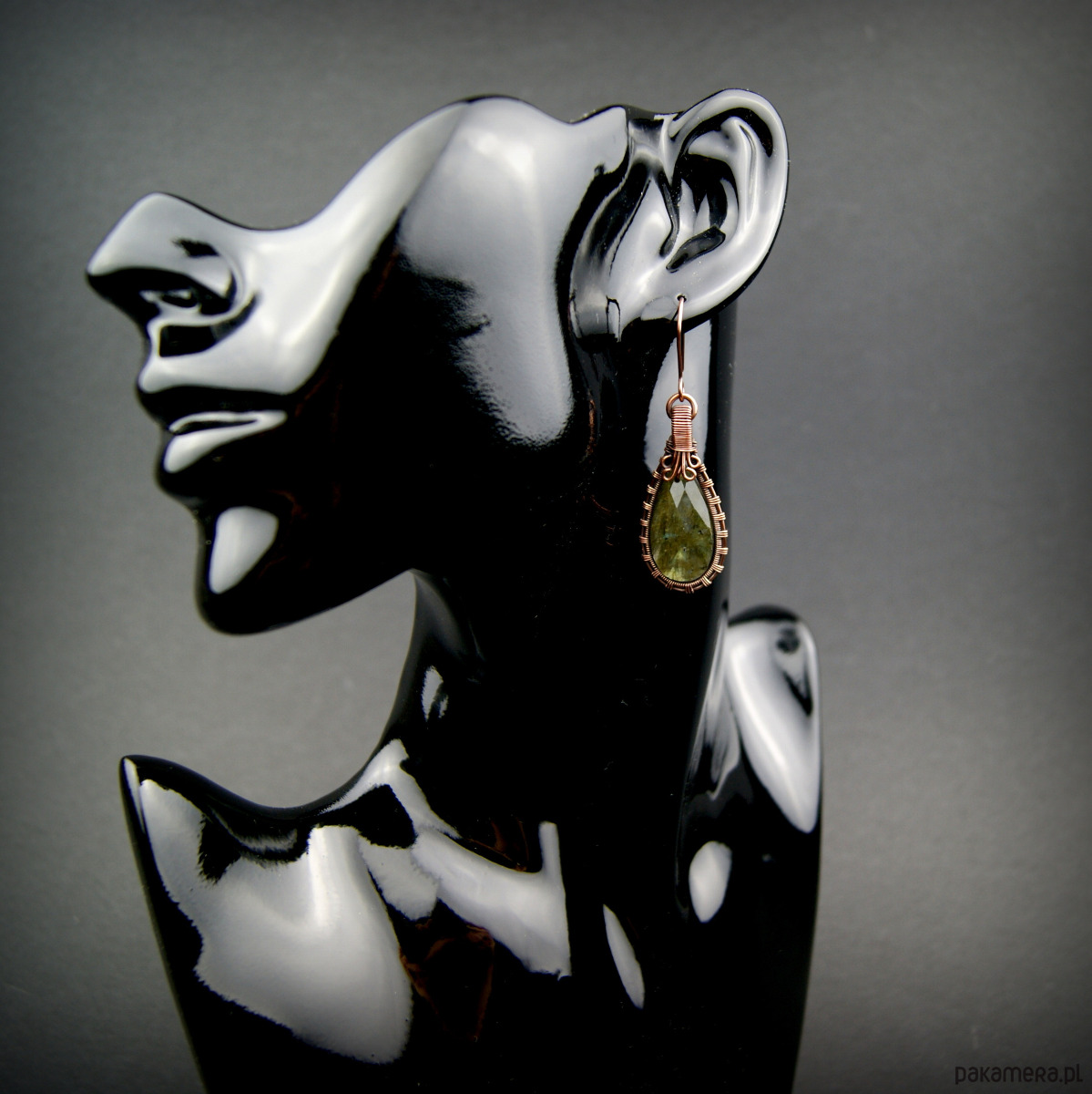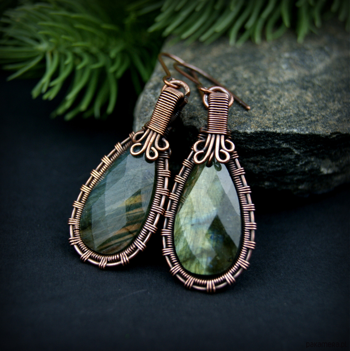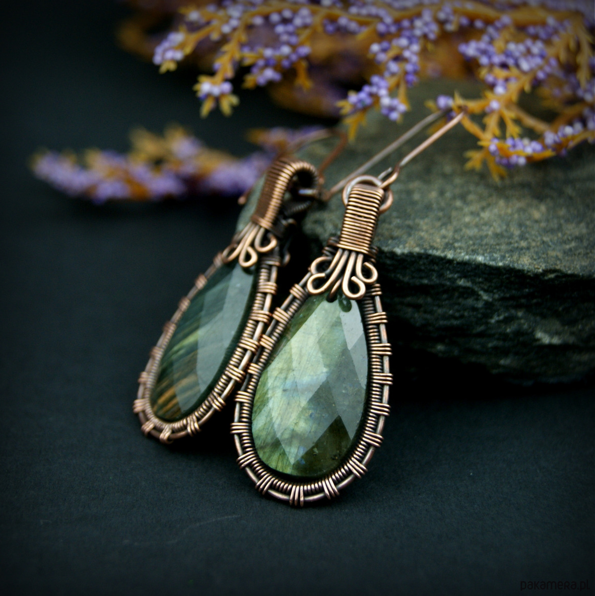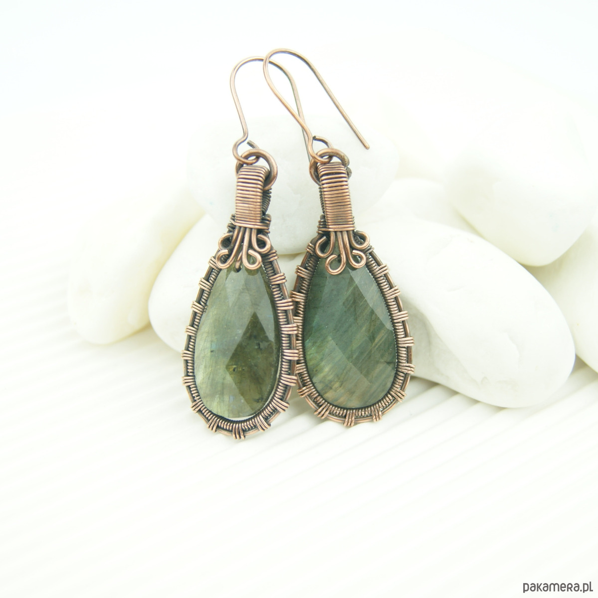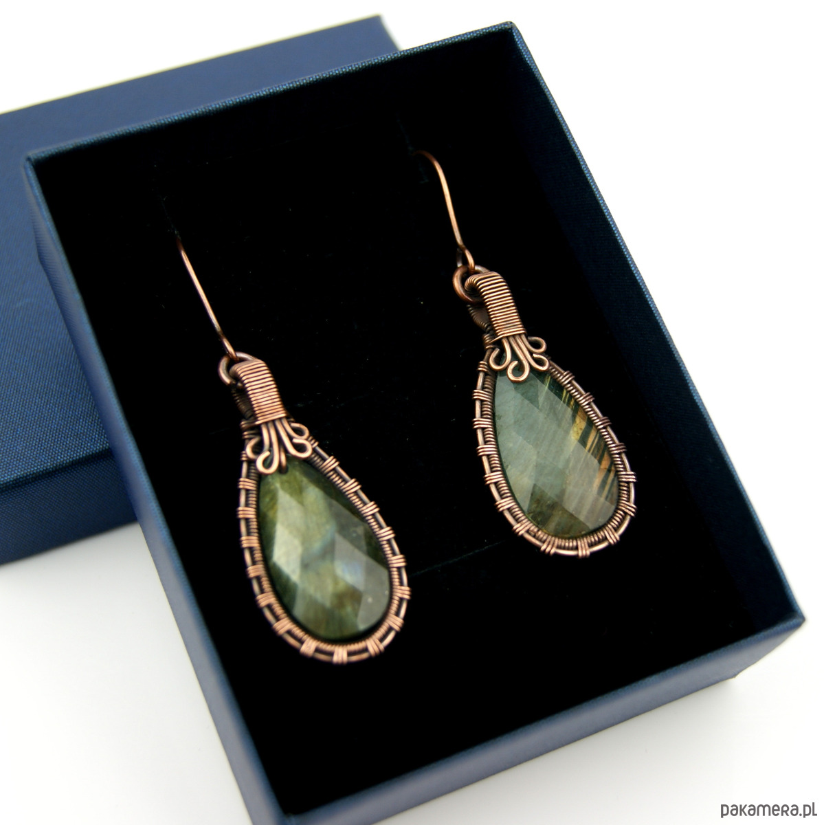 Wiszące kolczyki w całości wykonane z miedzi. Podstawę kolczyków są fasetowane kamienie labradorytu, całość misternie opleciona miedzią. Biżuteria oksydowana.