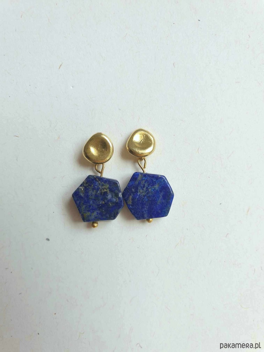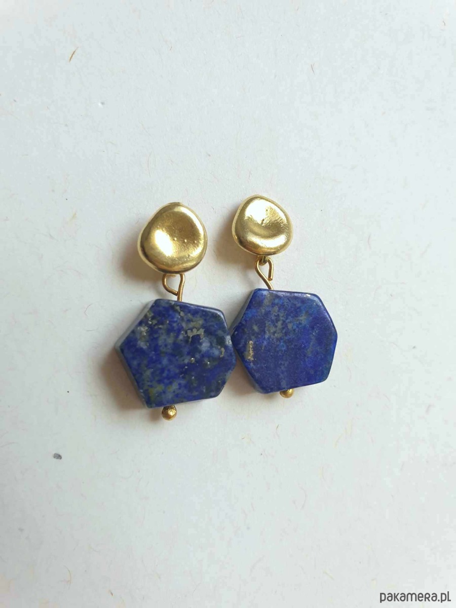 Minimalistyczne delikatne kolczyki wiszące z nieregularnym geometrycznym lapis lazuli, oraz sztyftem z surowego mosiądzu (z tyłu sztyft ze stali szlachetnej i zatyczka stal złocona). Na zdjęciu przykładowa para, kolczyki tworzę na zamówienie z tych samych kamyczków, zachowując tą samą tonacje kolorystyczną, ale mogą się minimalnie różnić.