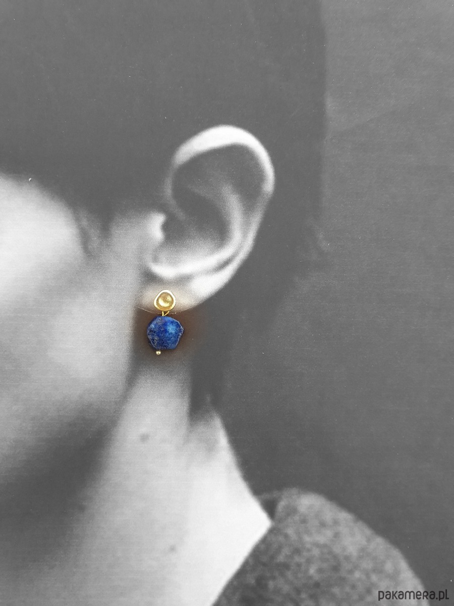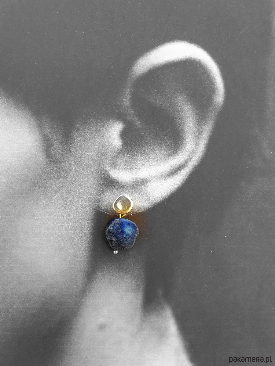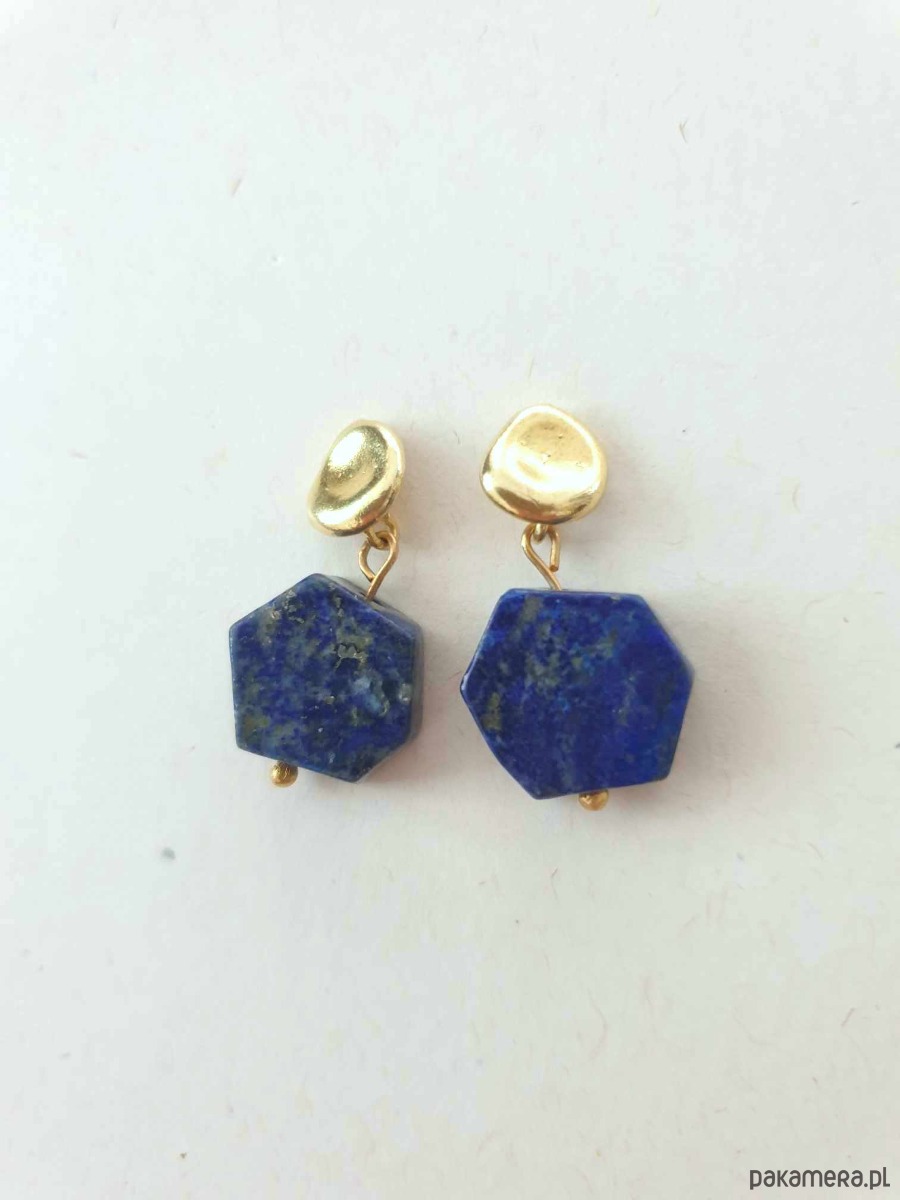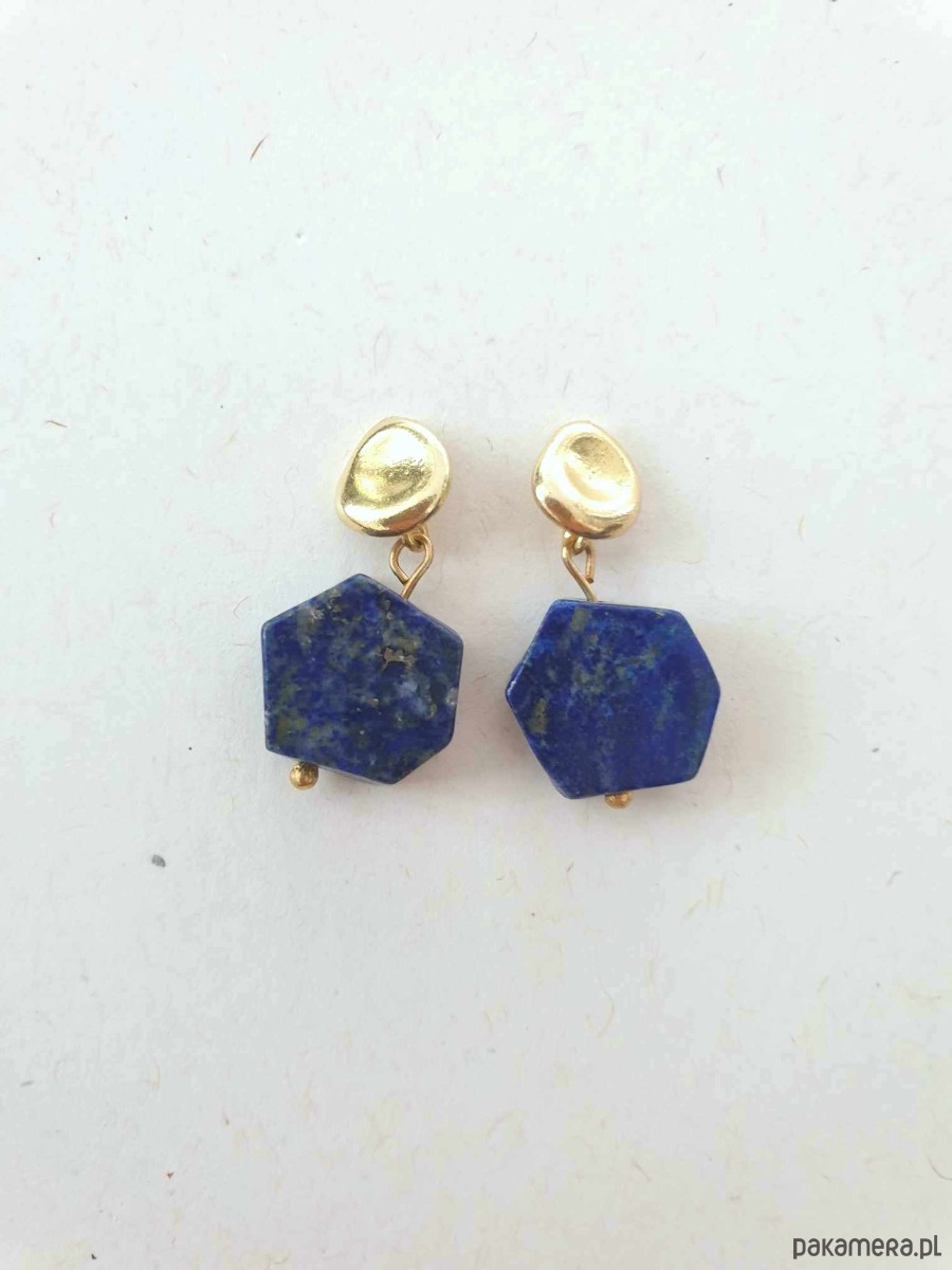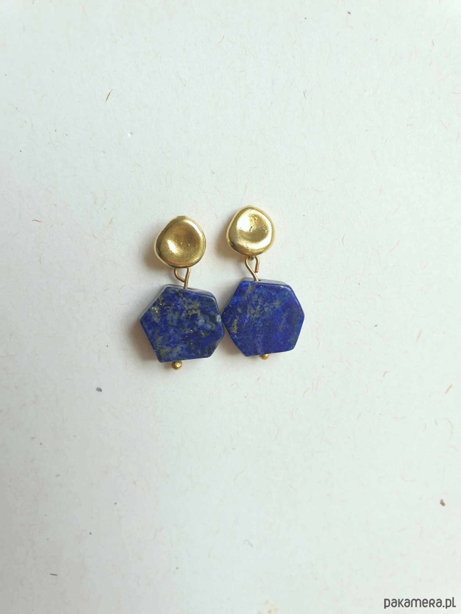 Minimalistyczne delikatne kolczyki wiszące z nieregularnym geometrycznym lapis lazuli, oraz sztyftem z surowego mosiądzu (z tyłu sztyft ze stali szlachetnej i zatyczka stal złocona). Na zdjęciu przykładowa para, kolczyki tworzę na zamówienie z tych samych kamyczków, zachowując tą samą tonacje kolorystyczną, ale mogą się minimalnie różnić.