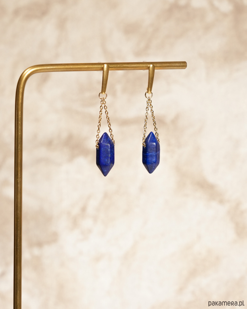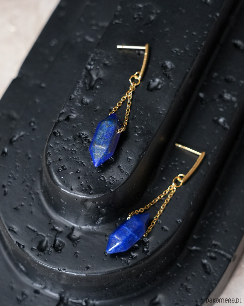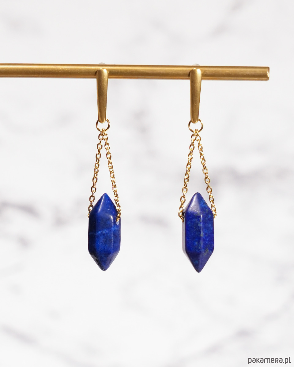 Delikatne i efektowne kolczyki z kamieniami LAPIS LAZULI w kształcie grota, zawieszonymi na delikatnym łańcuszku ze STALI SZLACHETNEJ. Ozdobne, podłużne sztyfty również wykonane są ze stali szlachetnej.