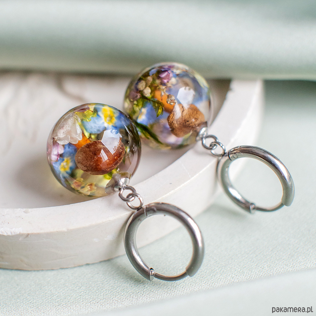 Kolczyki wykonany jest z żywicy epoksydowej z wykorzystaniem suszonych kwiatów. Metalowe elementy to stal nierdzewna szlachetna chirurgiczna.