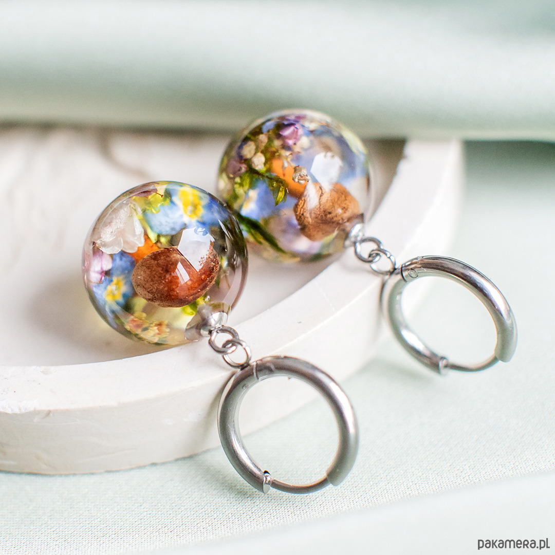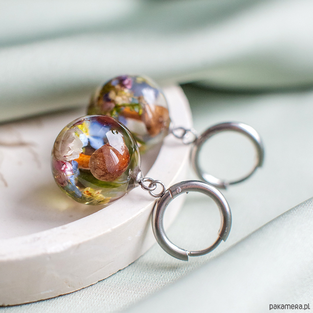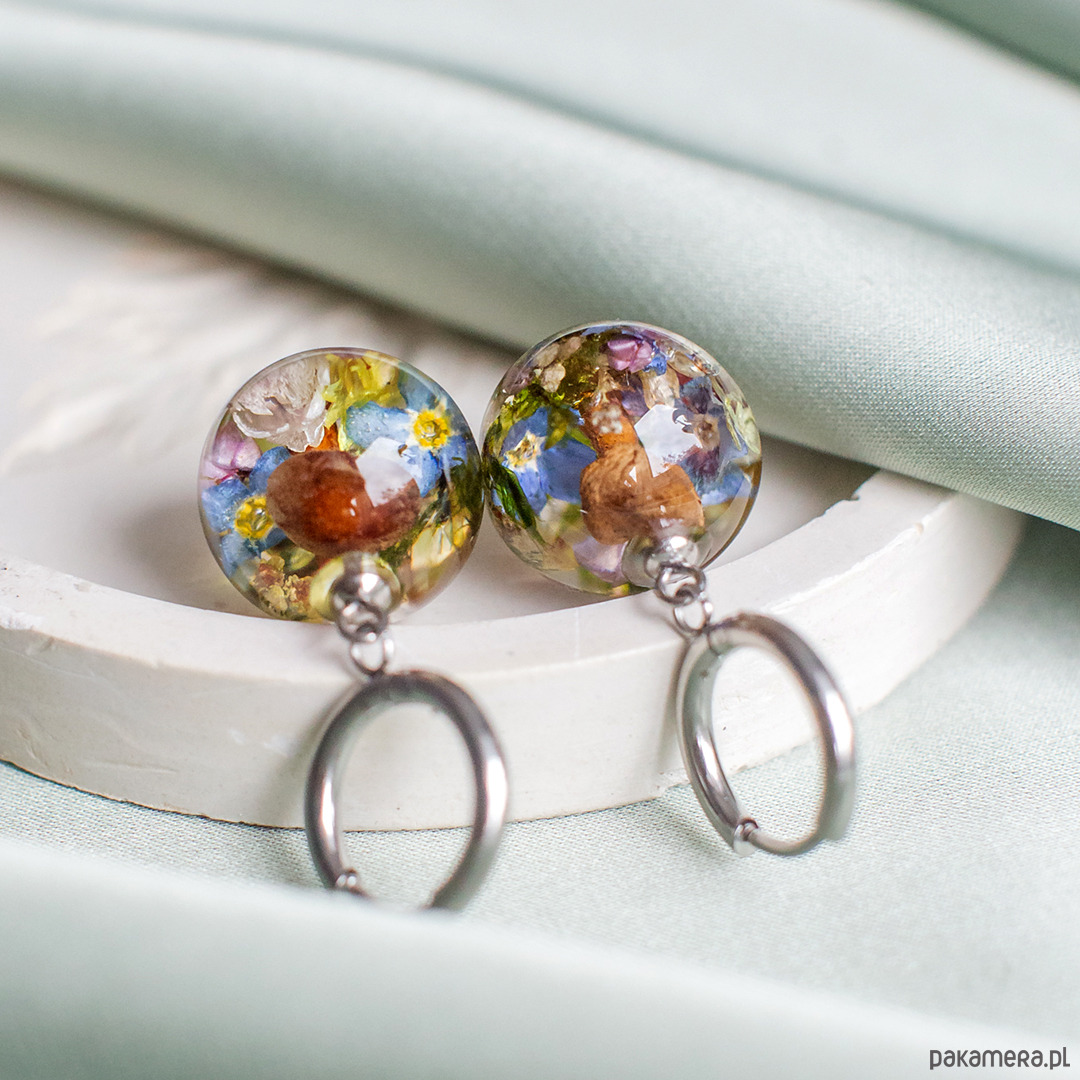 Kolczyki wykonany jest z żywicy epoksydowej z wykorzystaniem suszonych kwiatów. Metalowe elementy to stal nierdzewna szlachetna chirurgiczna.