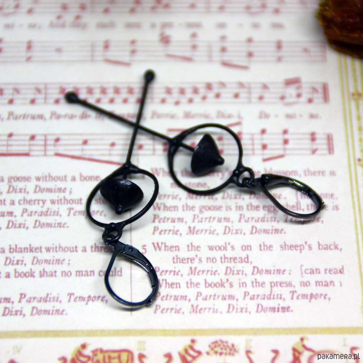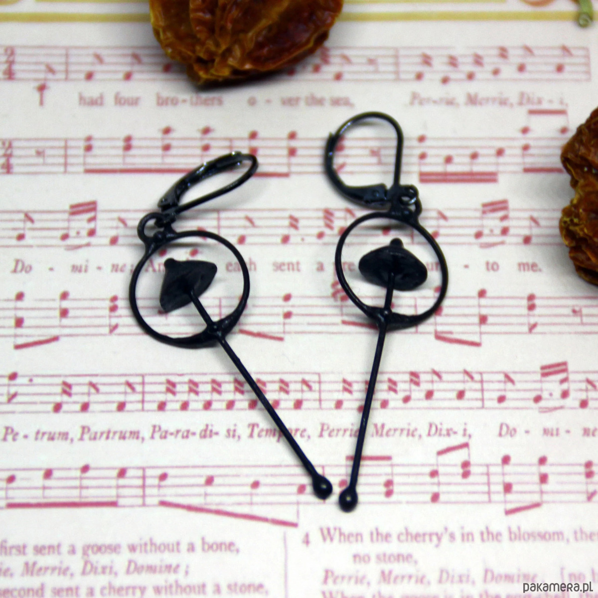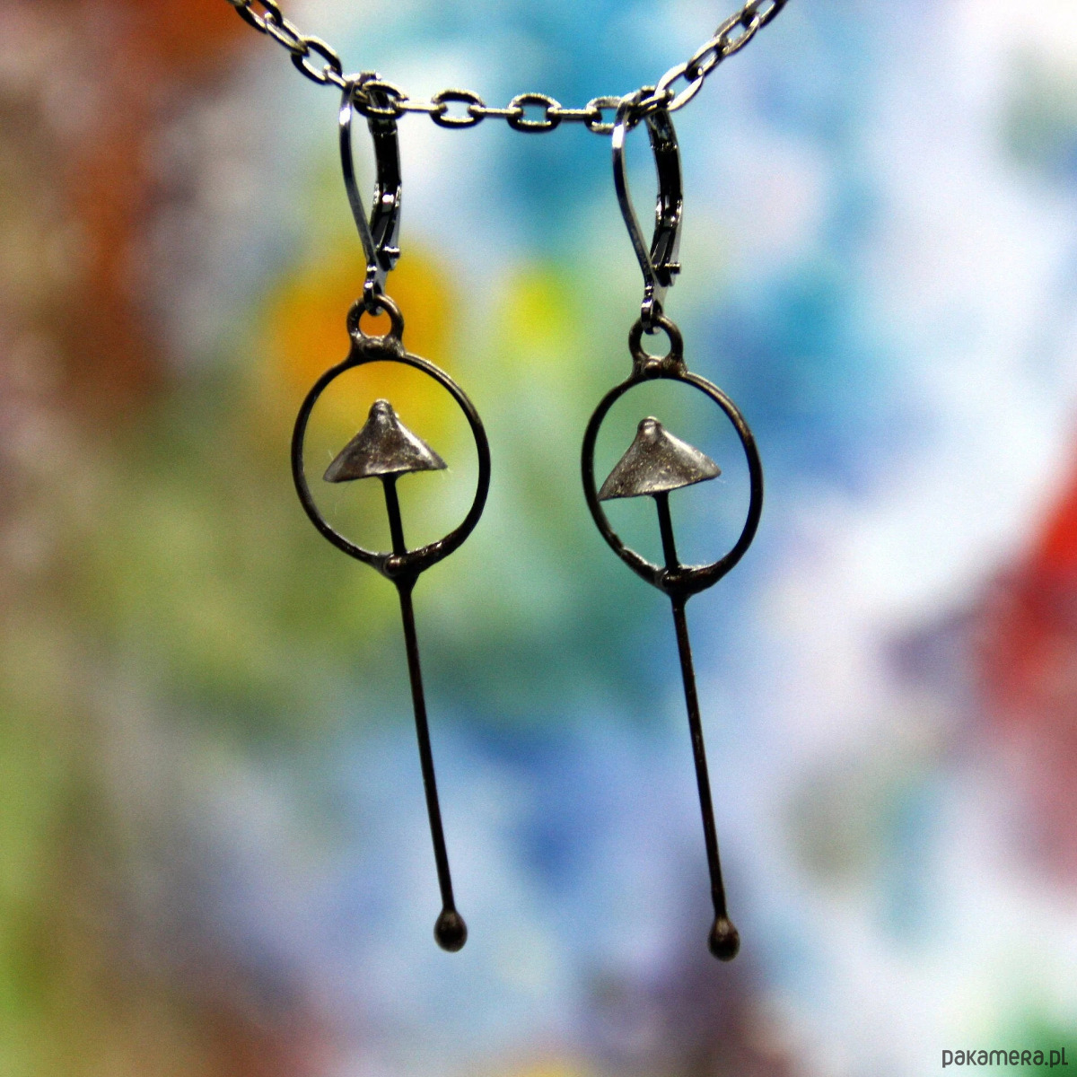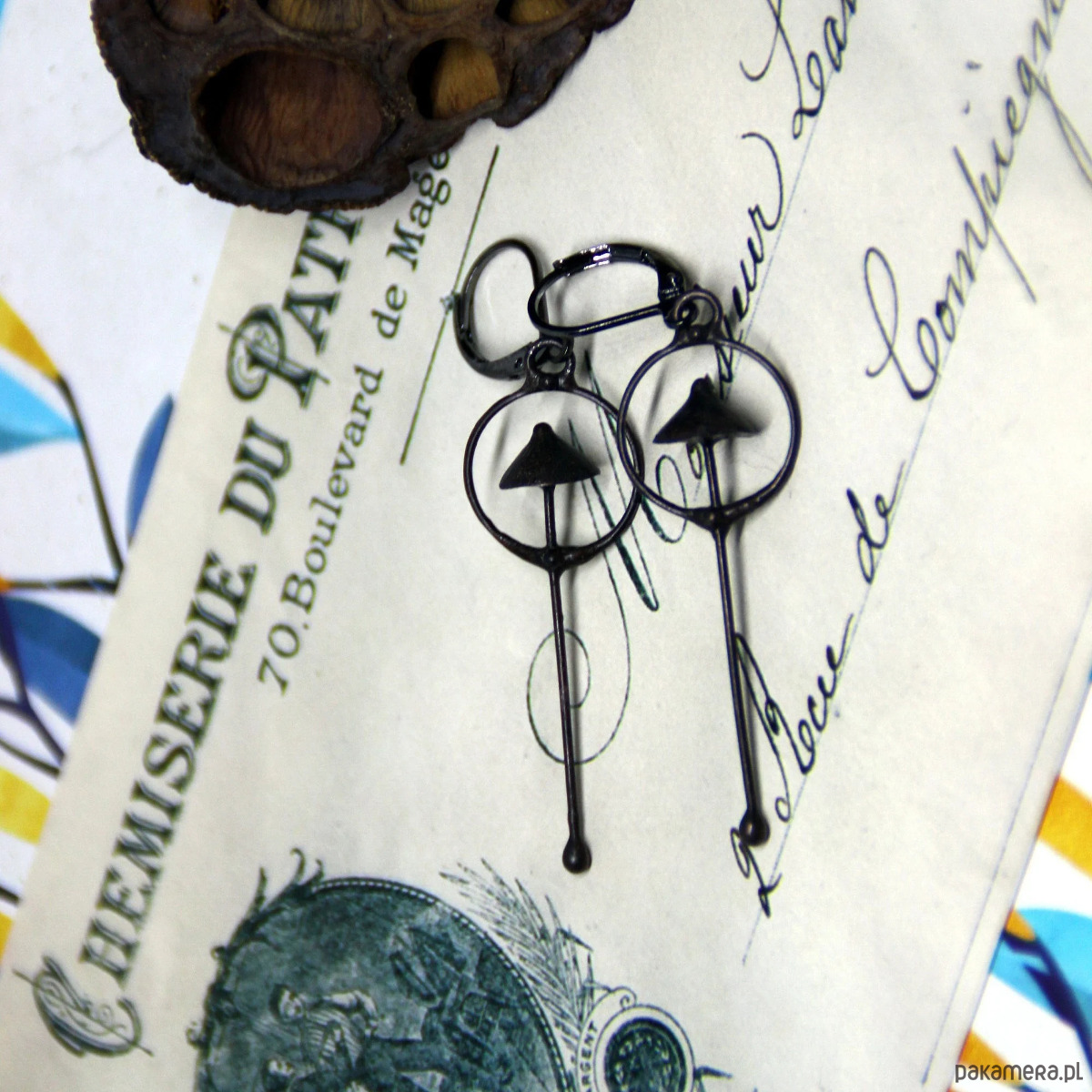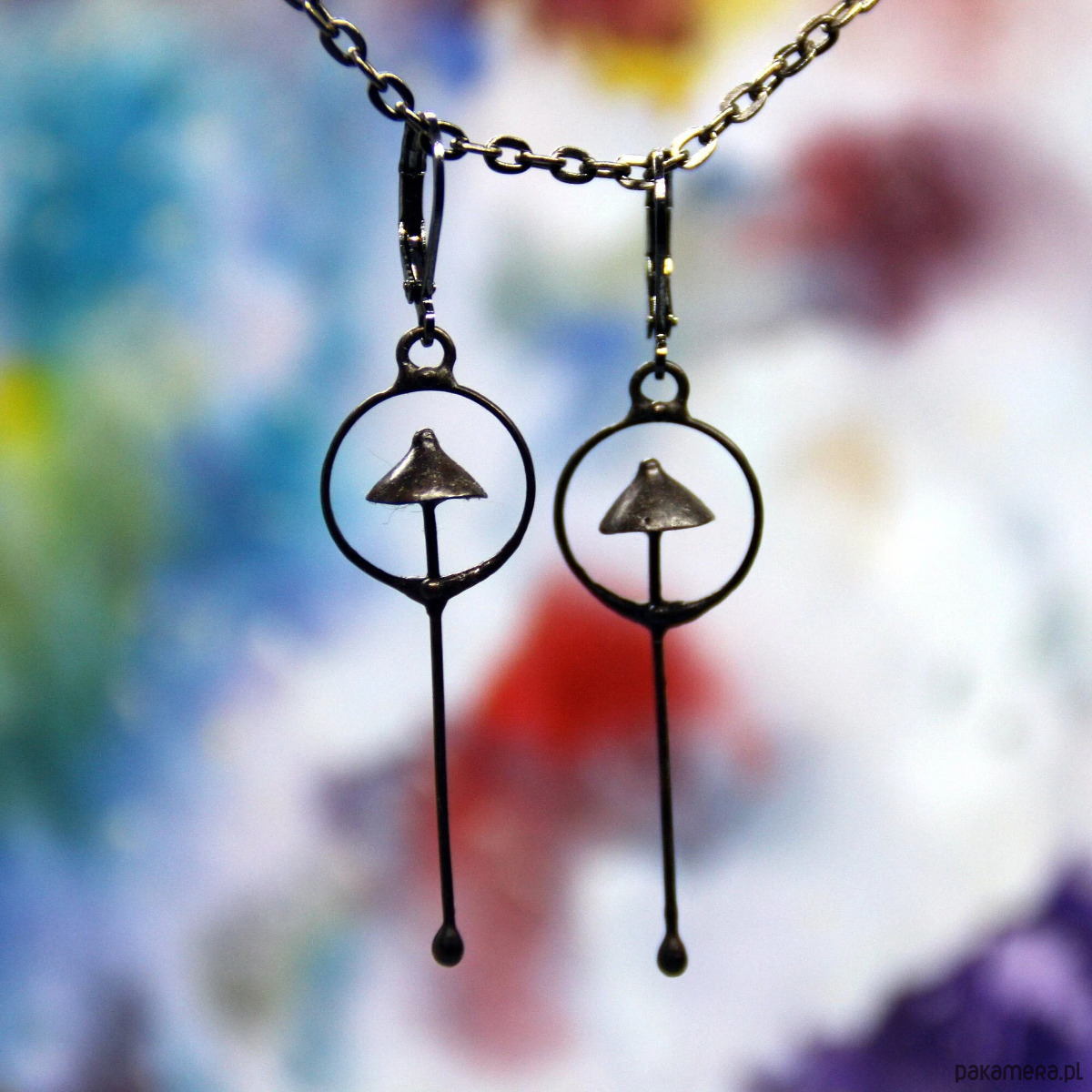 Kolczyki w kształcie grzybów wykonane z miedzi, cyny i stali. Pokryte czarną patyną i zabezpieczone środkiem przeciwutleniającym. Są lekkie i cienkie. Wszystkie elementy są wykonane ręcznie, co zapewnia indywidualność każdego produktu wytworzonego w warsztacie Yadovito. Stop cyny i miedzi pokryty jest czarną patyną, która nadaje metalowi czarny kolor, a następnie wypolerowany roztworem wykończeniowym, aby nadać biżuterii szlachetny wygląd i jednocześnie zapobiec utlenianiu się metalu. Rozmiar: około 4,5* 1 cm.