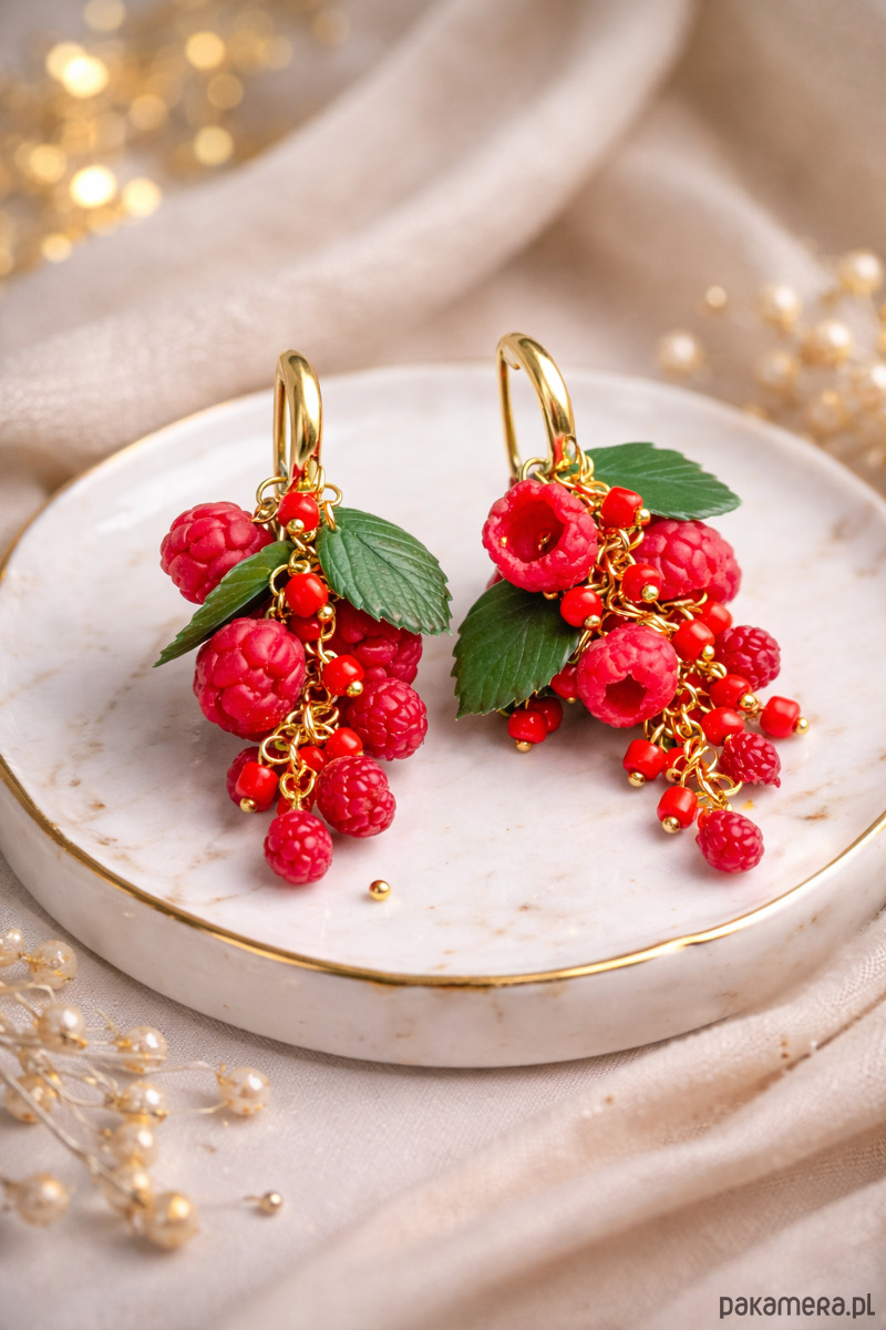 Wyjątkowe, ręcznie wykonane kolczyki inspirowane soczystymi malinami. Intensywnie czerwone owoce w połączeniu z zielonymi liśćmi i złotymi detalami tworzą bogatą, efektowną kompozycję pełną koloru i energii.