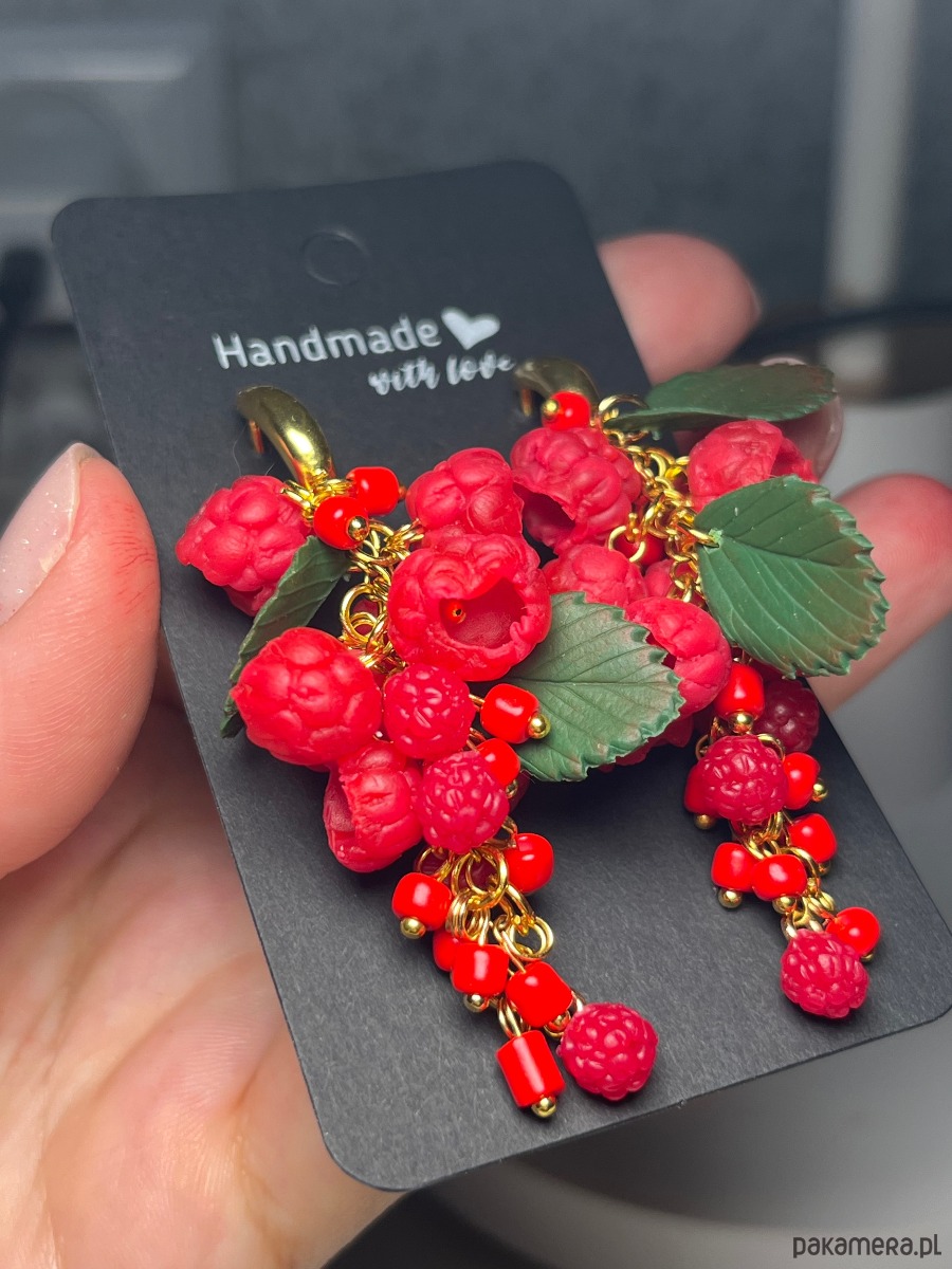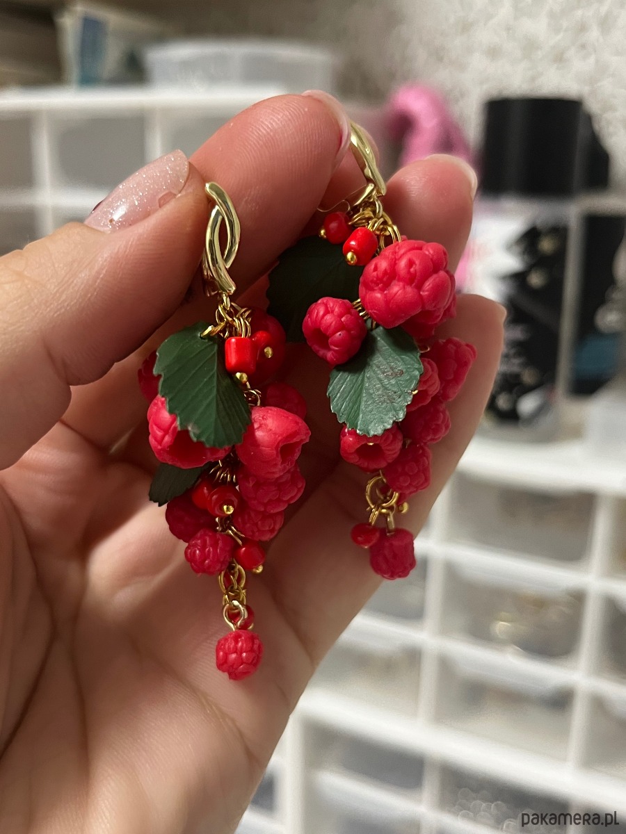 Wyjątkowe, ręcznie wykonane kolczyki inspirowane soczystymi malinami. Intensywnie czerwone owoce w połączeniu z zielonymi liśćmi i złotymi detalami tworzą bogatą, efektowną kompozycję pełną koloru i energii.