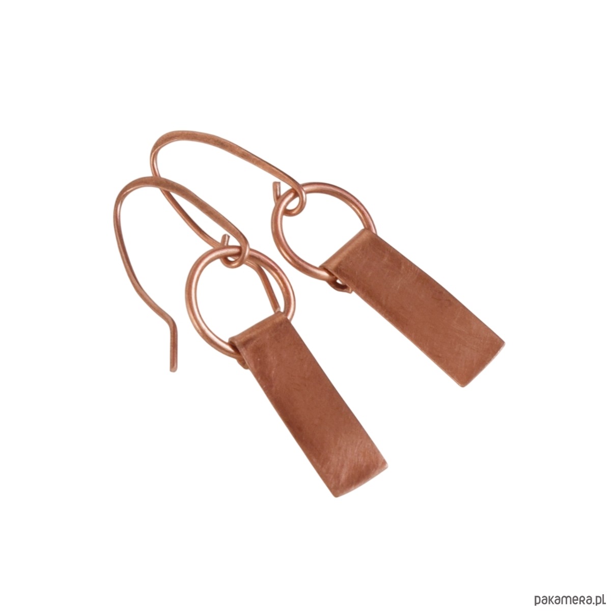 Kolczyki wykonane z całości z miedzi, częściowo zmatowione papierem ściernym.