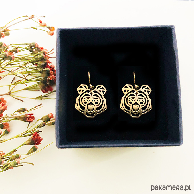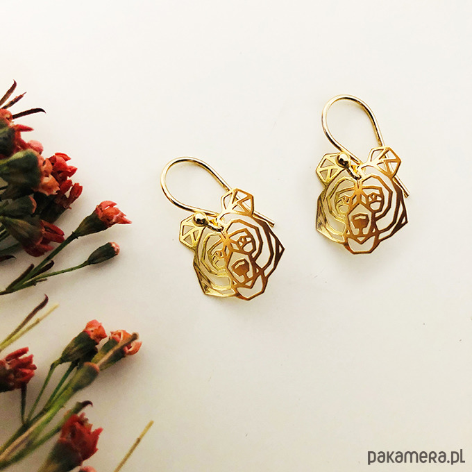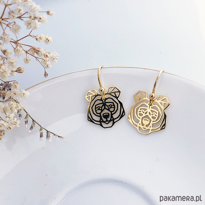 Oryginalne kolczyki z zawieszką w kształcie głowy misia, inspirowane sztuką origami . Wykonane ze srebra próby 925 złocone 24 k złotem.