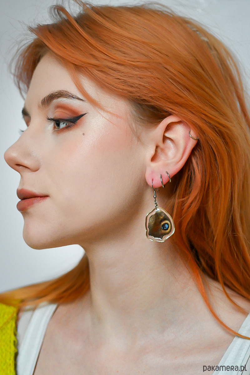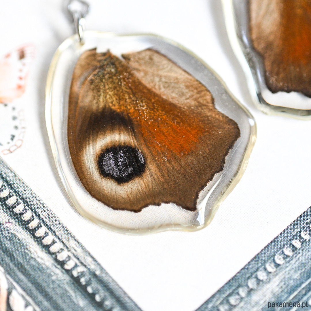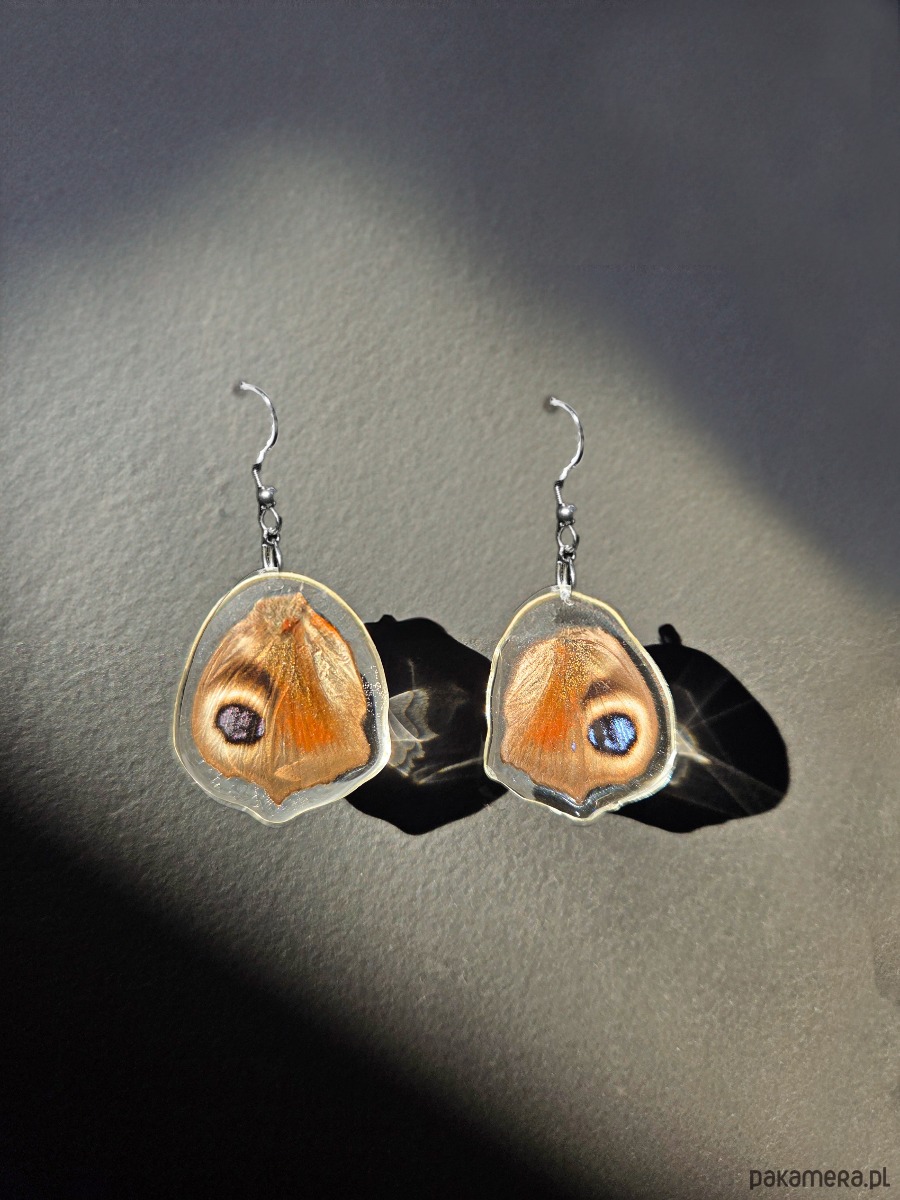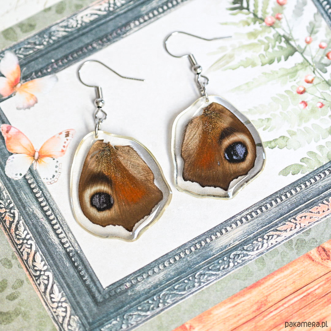 Przedstawiamy wyjątkowe, lekkie kolczyki wykonane ręcznie z wysokiej jakości żywicy jubilerskiej, w której zamknięte zostały skrzydła motyla rusałka pawik. Skomplikowane detale i tekstury skrzydeł są perfekcyjnie uchwycone w krystalicznie czystej, twardej jak szkło żywicy, tworząc oszałamiający efekt.