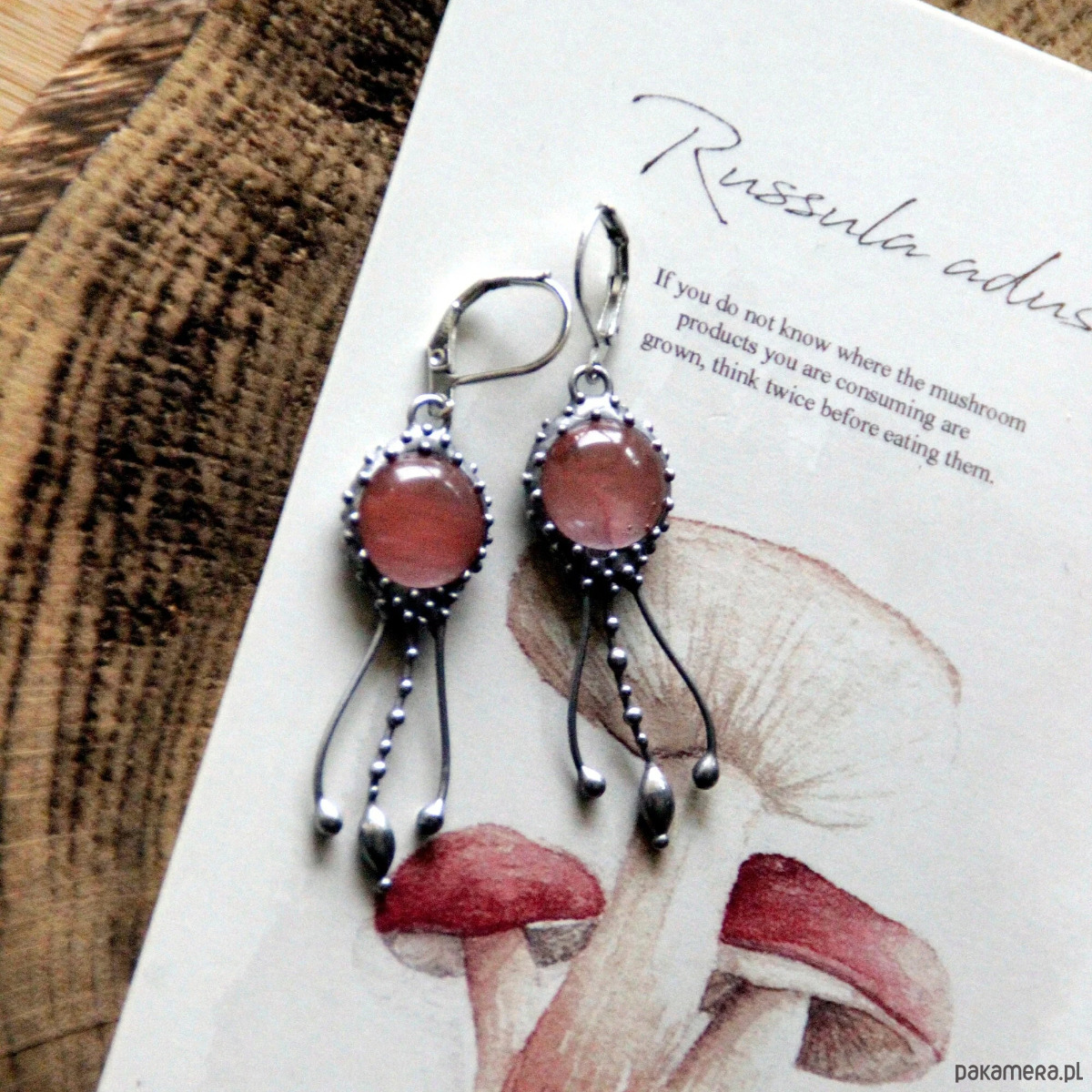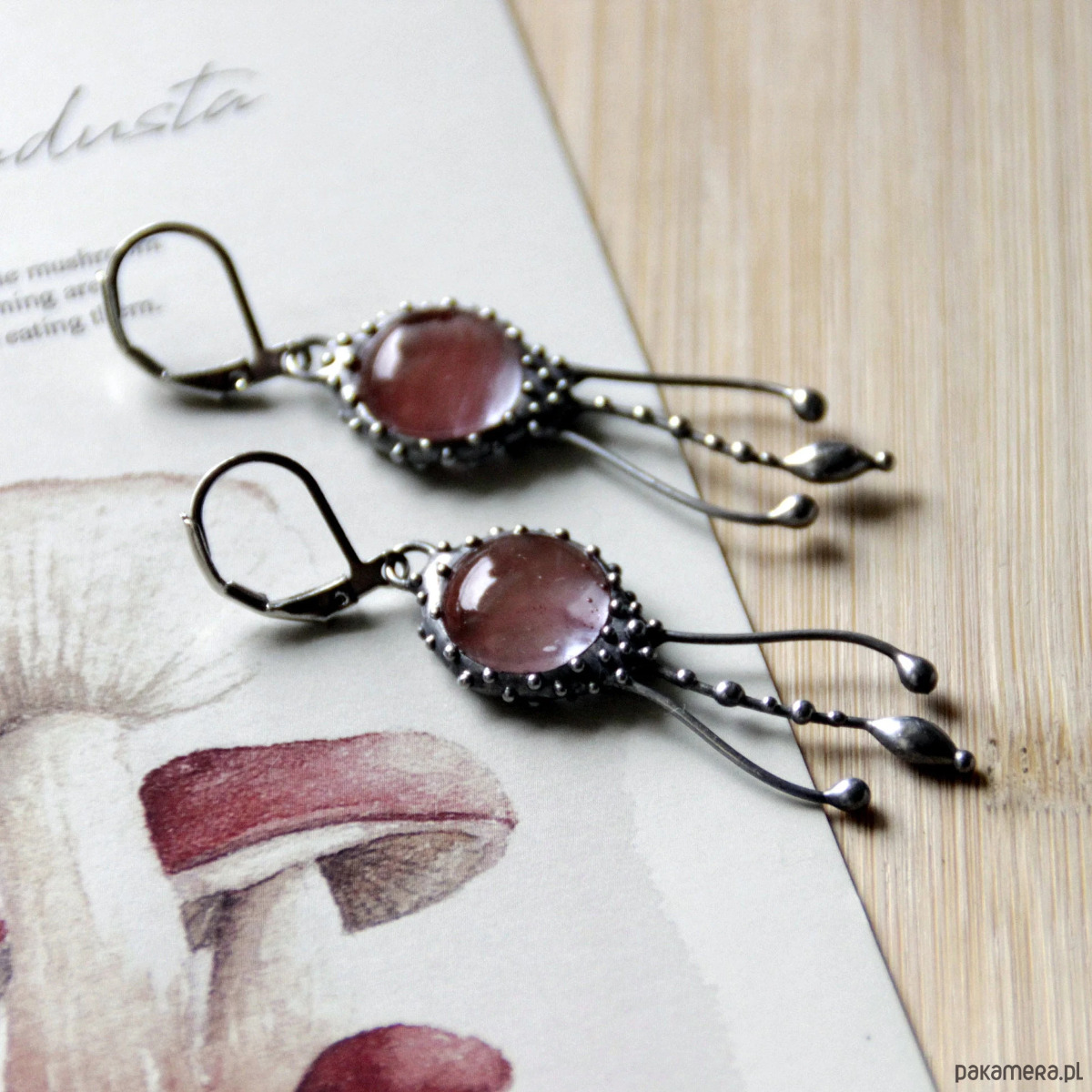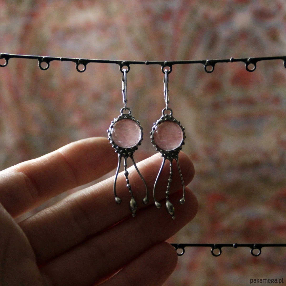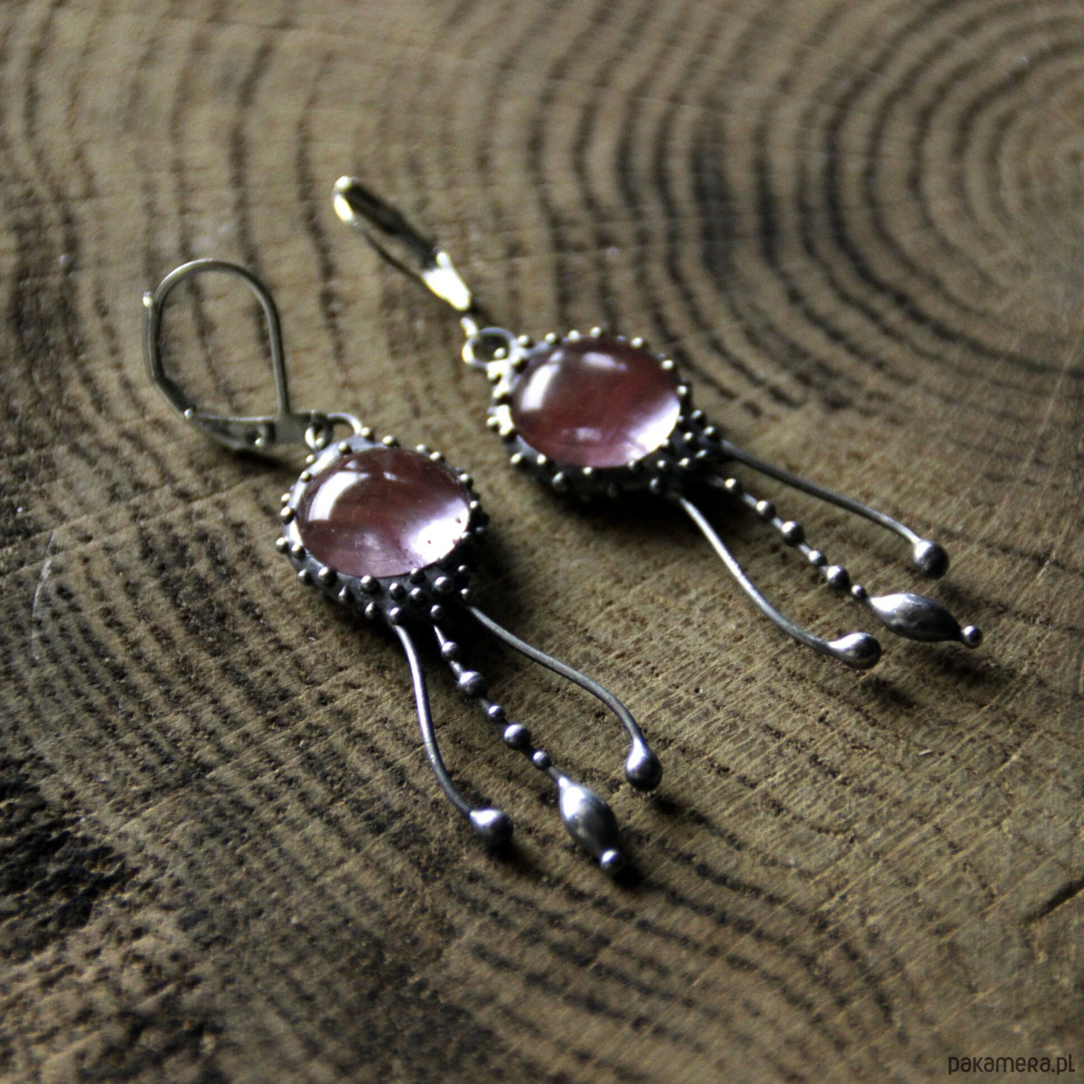 Kolczyki z motywem meduz, wykonane ręcznie z miedzi, cyny, stali i kwarcu arbuzowego. Kolczyki są lekkie i wytrzymałe. Wszystkie elementy są ręcznie wykonane, co gwarantuje indywidualność każdego produktu wykonanego w pracowni Yadovito. Stop cyny i miedzi jest polerowany roztworem wykończeniowym, aby nadać biżuterii szlachetny wygląd i jednocześnie zapobiec utlenianiu się metalu. Rozmiar około 4/1 cm. Kolor srebrny/różowy.