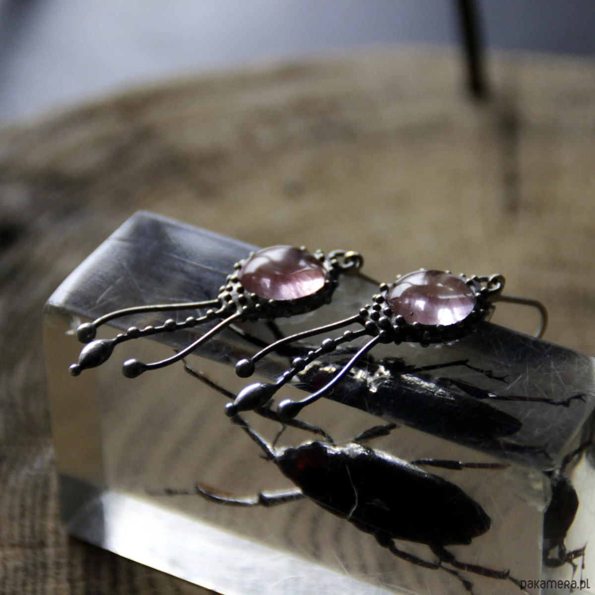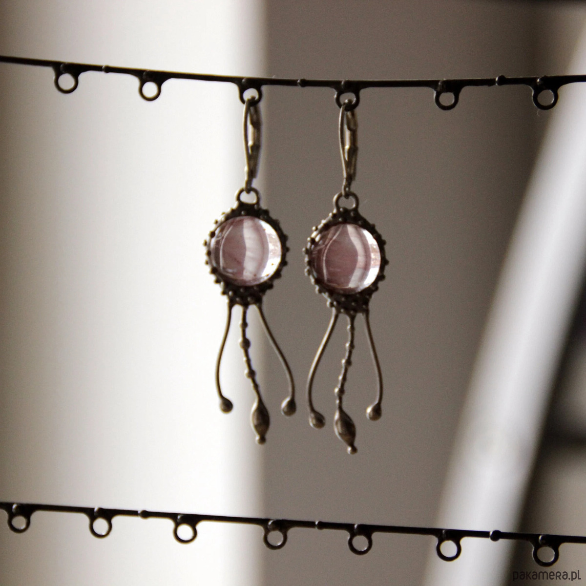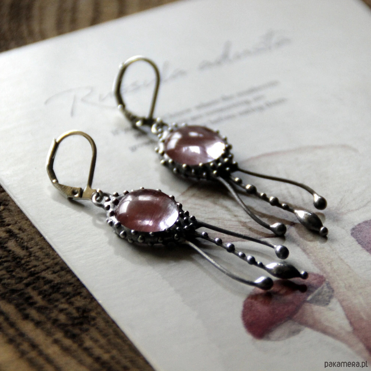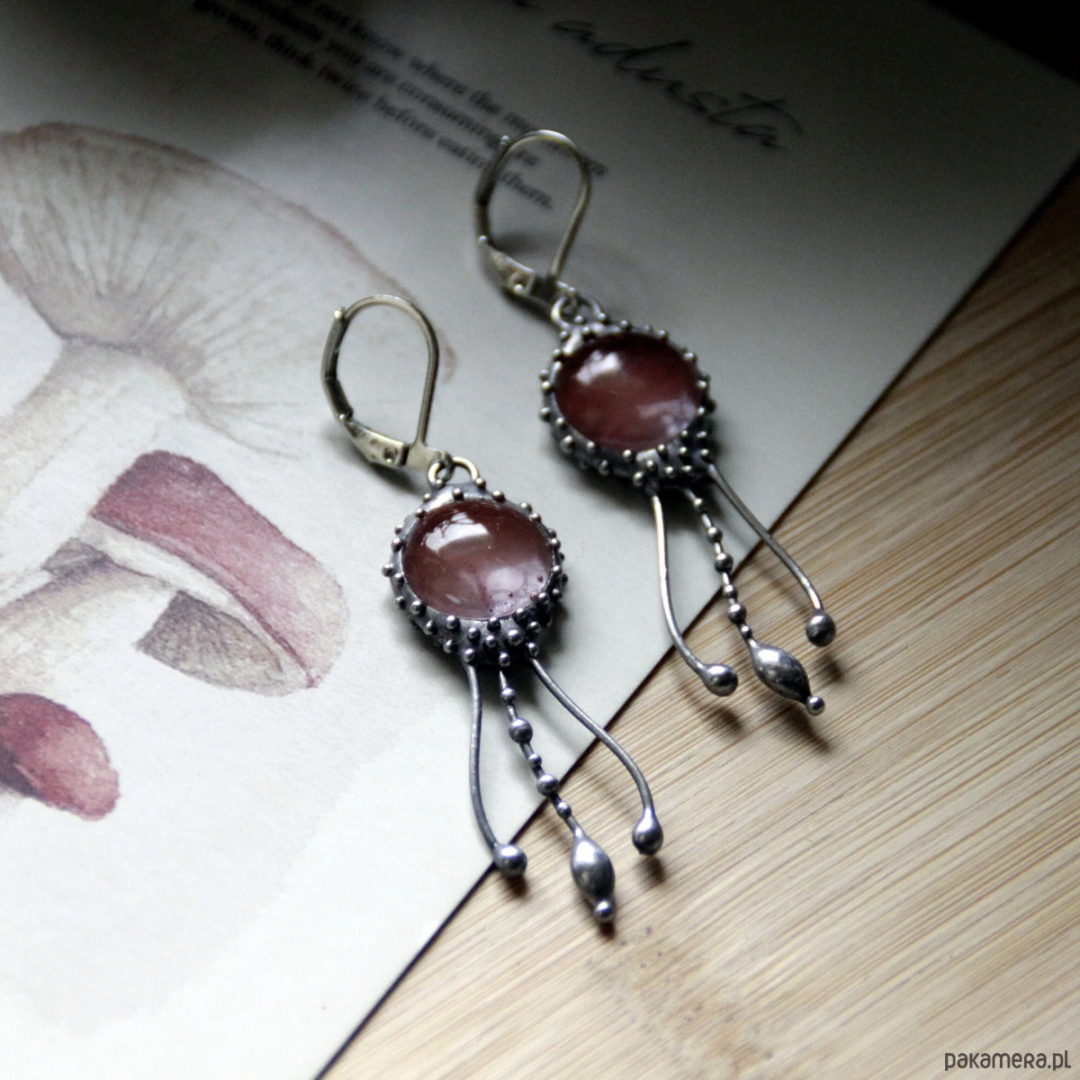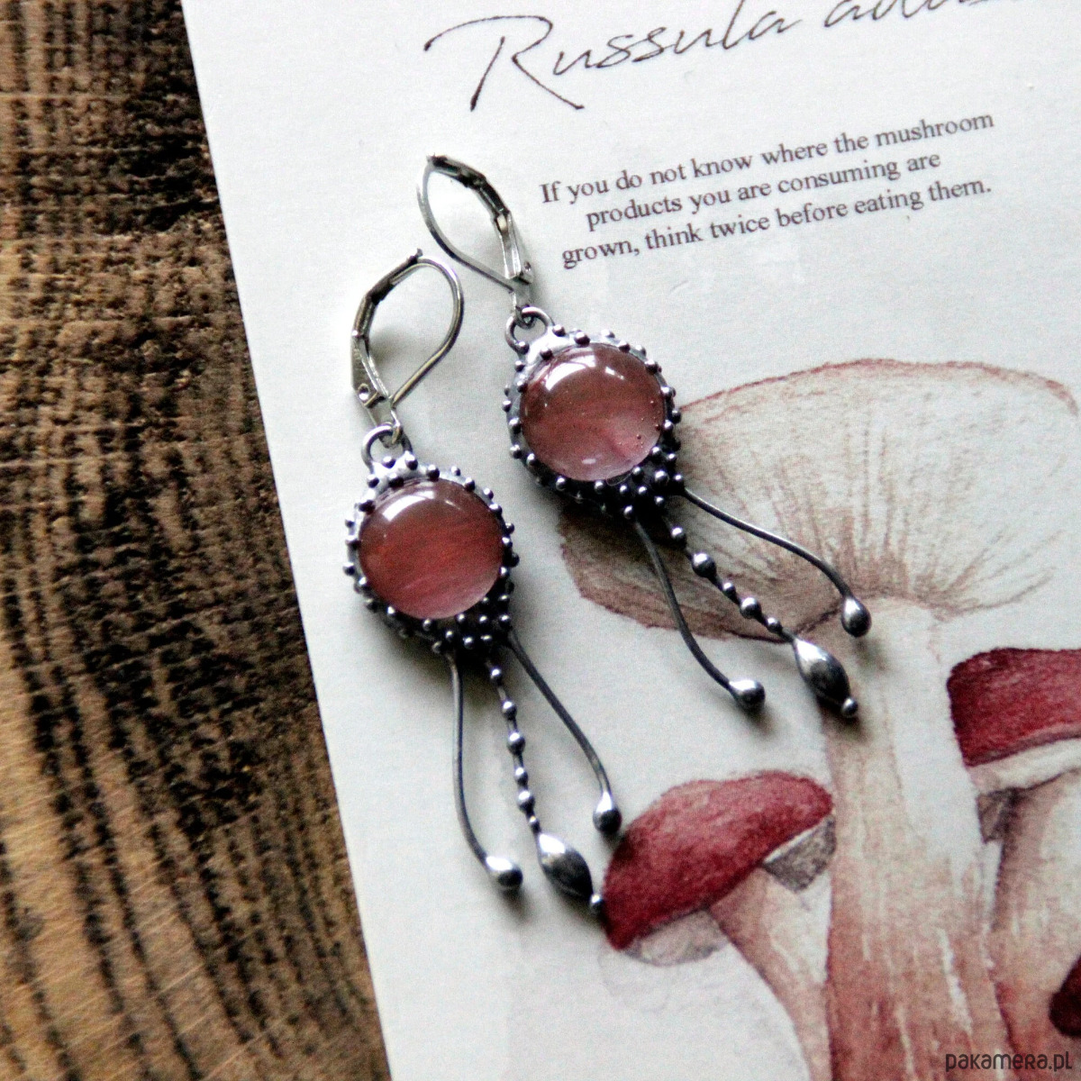 Kolczyki z motywem meduz, wykonane ręcznie z miedzi, cyny, stali i kwarcu arbuzowego. Kolczyki są lekkie i wytrzymałe. Wszystkie elementy są ręcznie wykonane, co gwarantuje indywidualność każdego produktu wykonanego w pracowni Yadovito. Stop cyny i miedzi jest polerowany roztworem wykończeniowym, aby nadać biżuterii szlachetny wygląd i jednocześnie zapobiec utlenianiu się metalu. Rozmiar około 4/1 cm. Kolor srebrny/różowy.