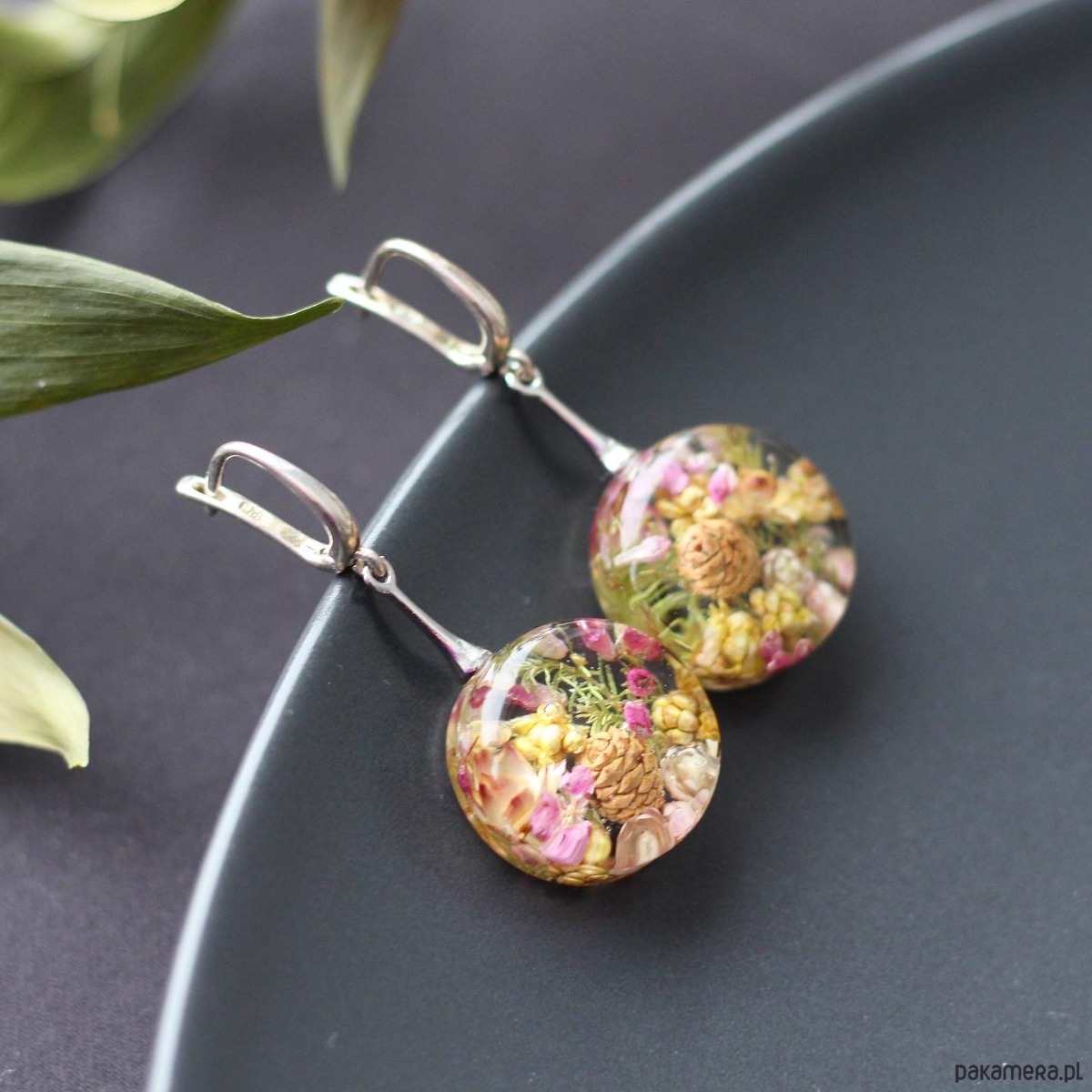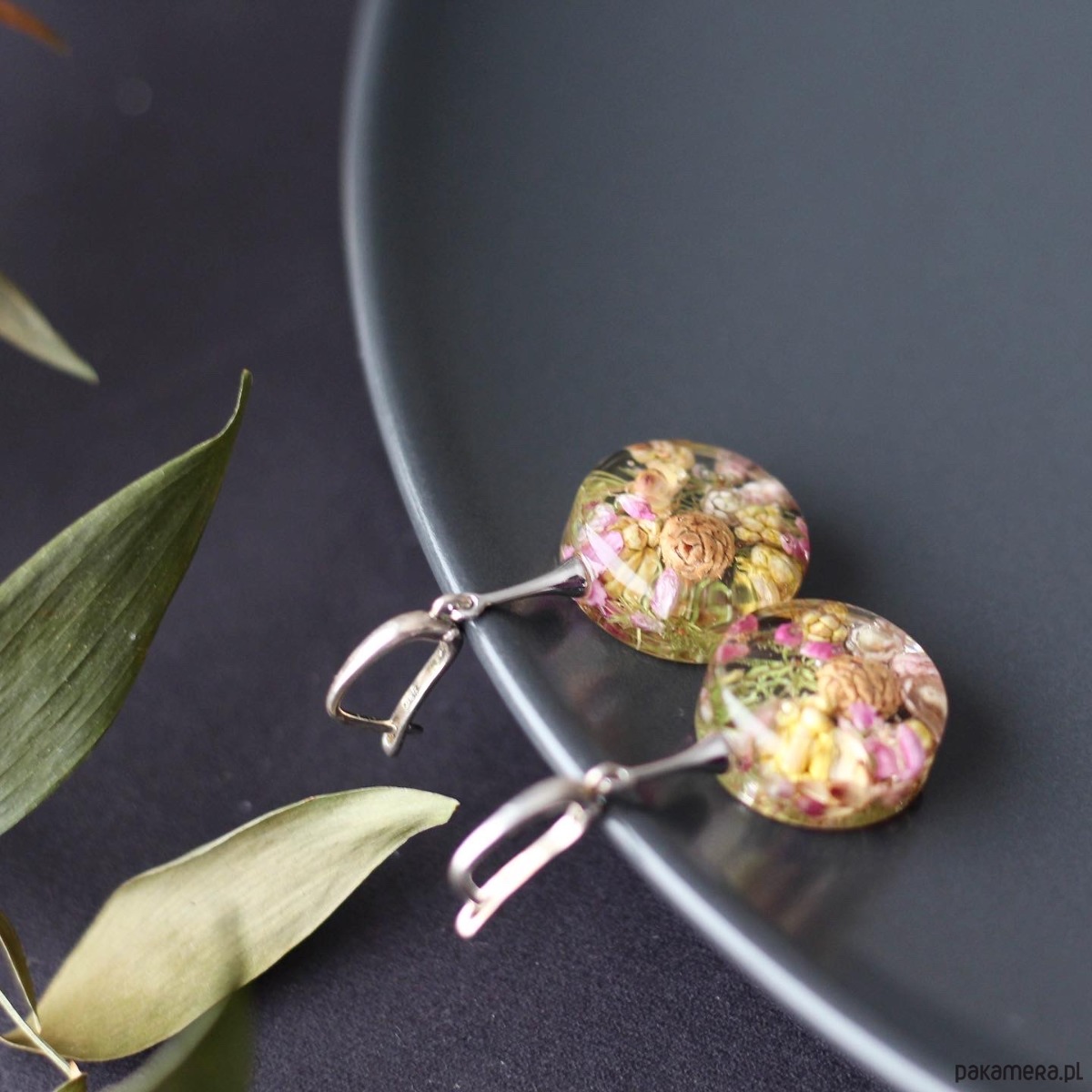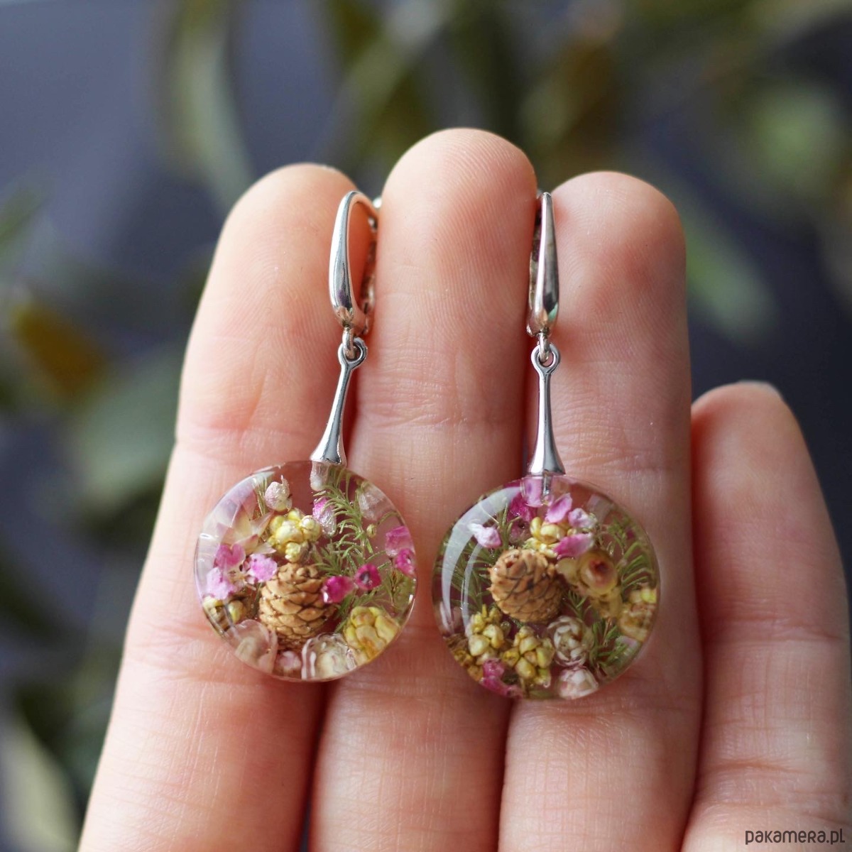 Kolczyki z naturalną kompozycją kwiatową w żywicy.