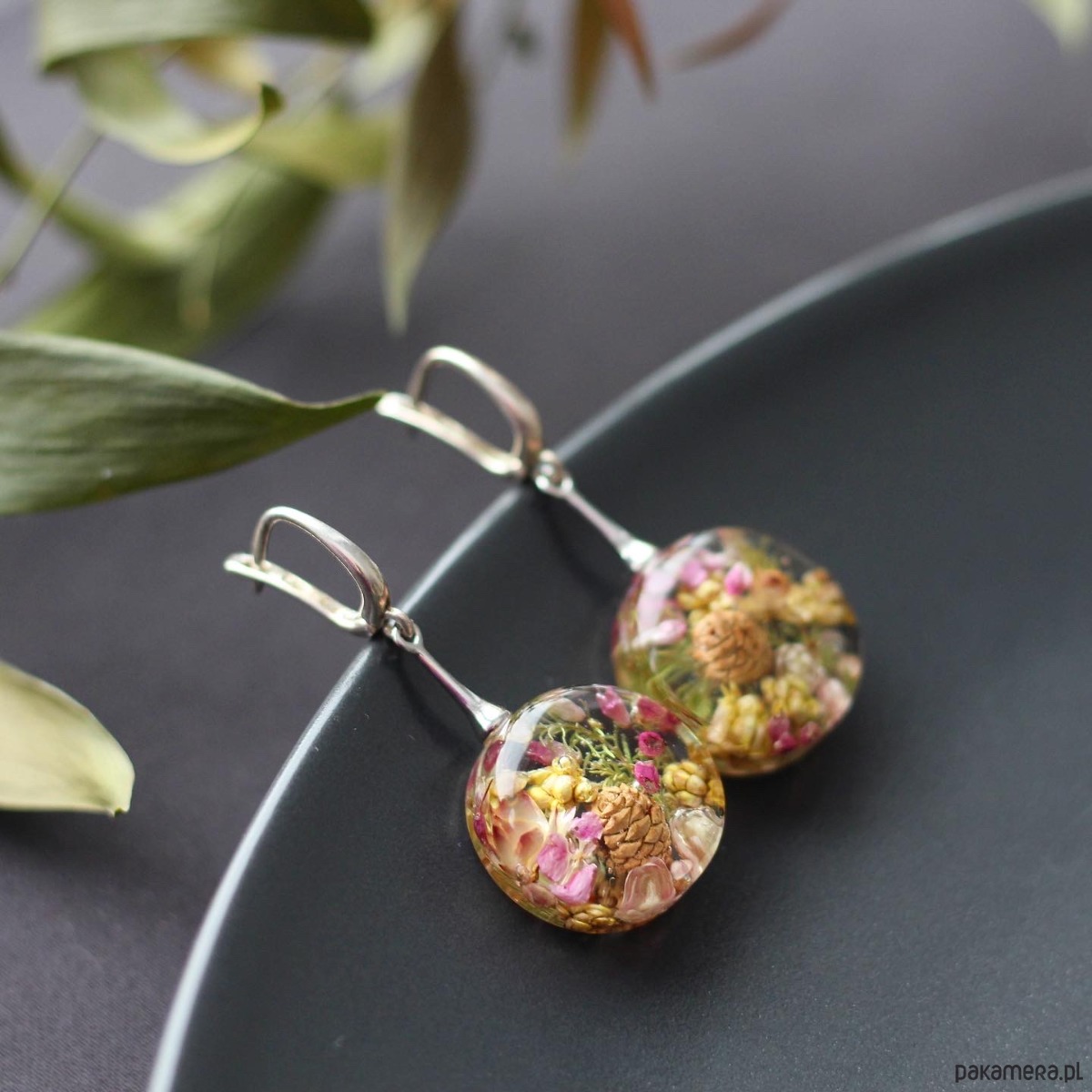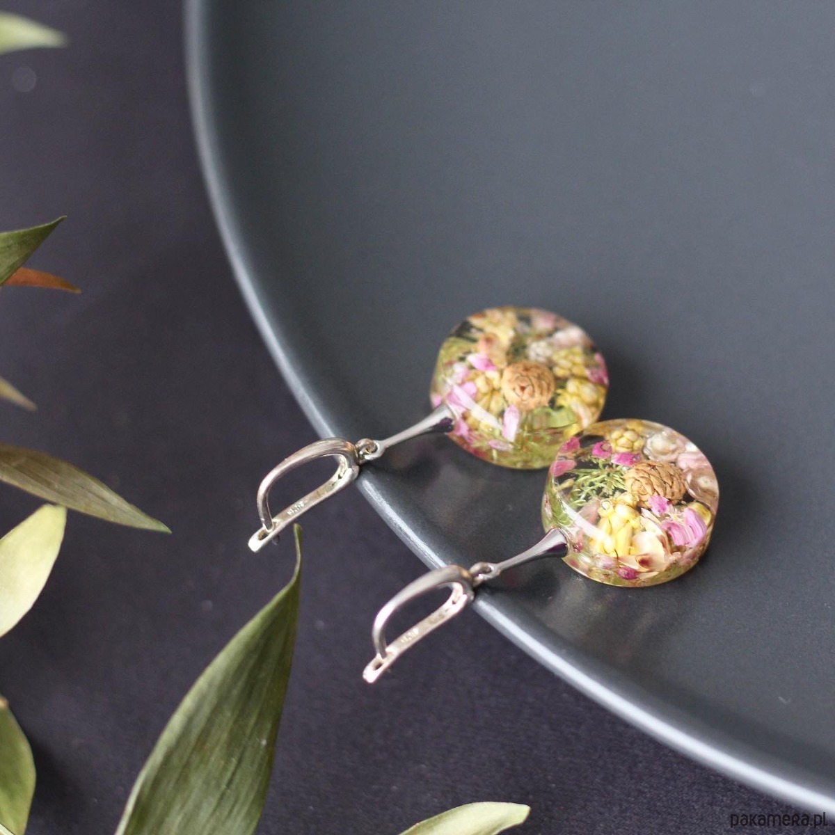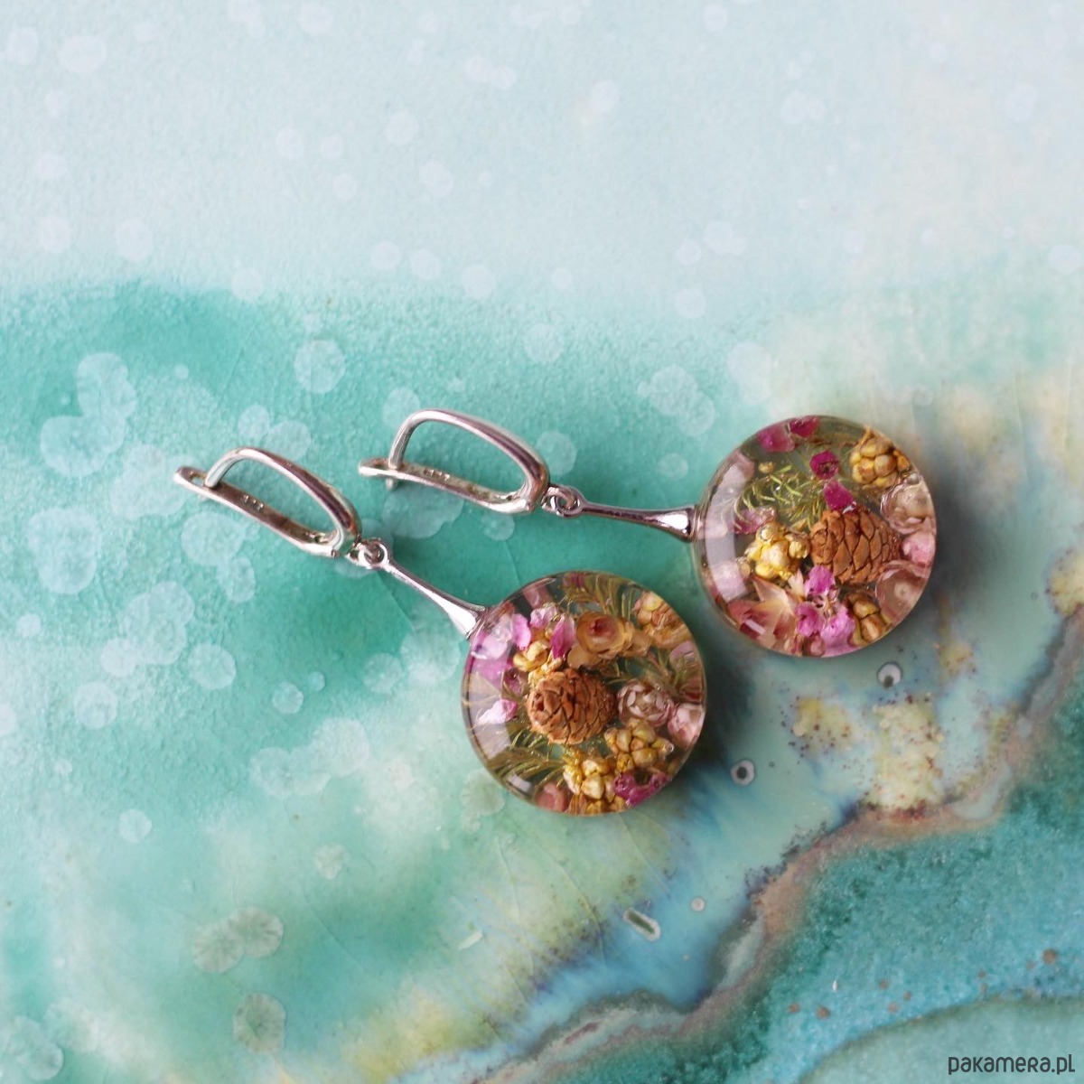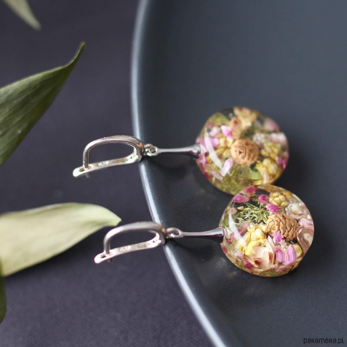 Kolczyki z naturalną kompozycją kwiatową w żywicy.