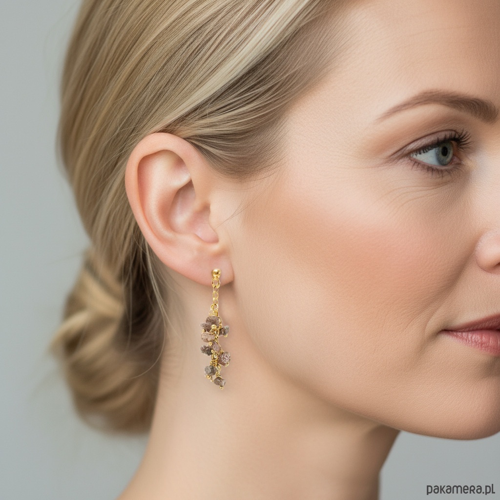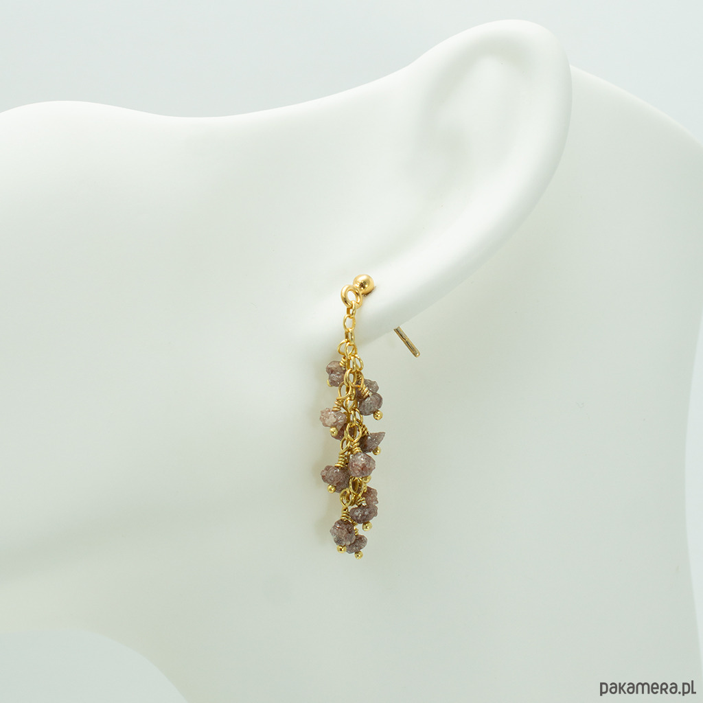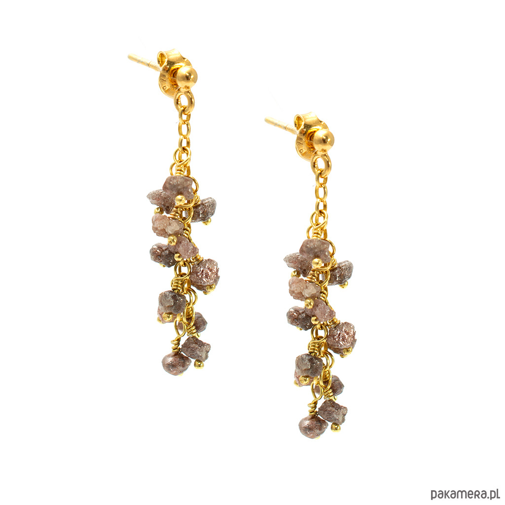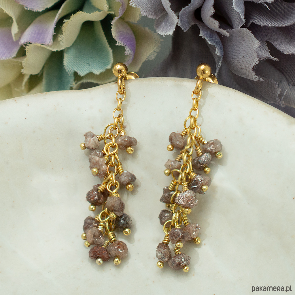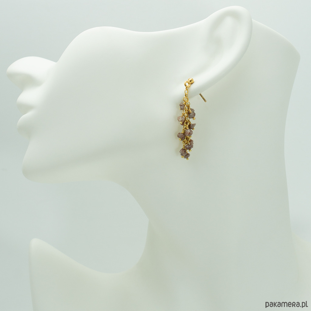 Długie, efektowne kolczyki gronka z naturalnymi, surowymi diamentami w kolorze ciemnym różowym. Na wygodnych biglach sztyftach, dobrze trzymają się na uszach.