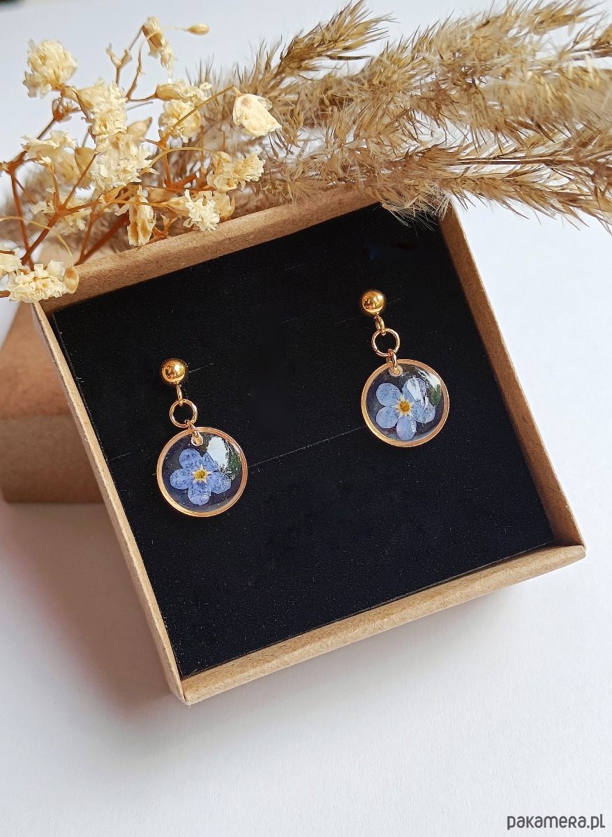 Urocze kolczyki z zatopionym kwiatem niezapominajki. Wykonane z wysokiej klasy żywicy, która nie zmienia koloru pod wpływem promieniowania UV oraz wysokiej jakości stali chirurgicznej.