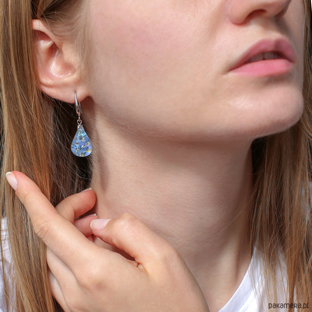 Kolczyki wykonany jest z żywicy epoksydowej z wykorzystaniem suszonych kwiatów. Metalowe elementy to stal nierdzewna szlachetna chirurgiczna.