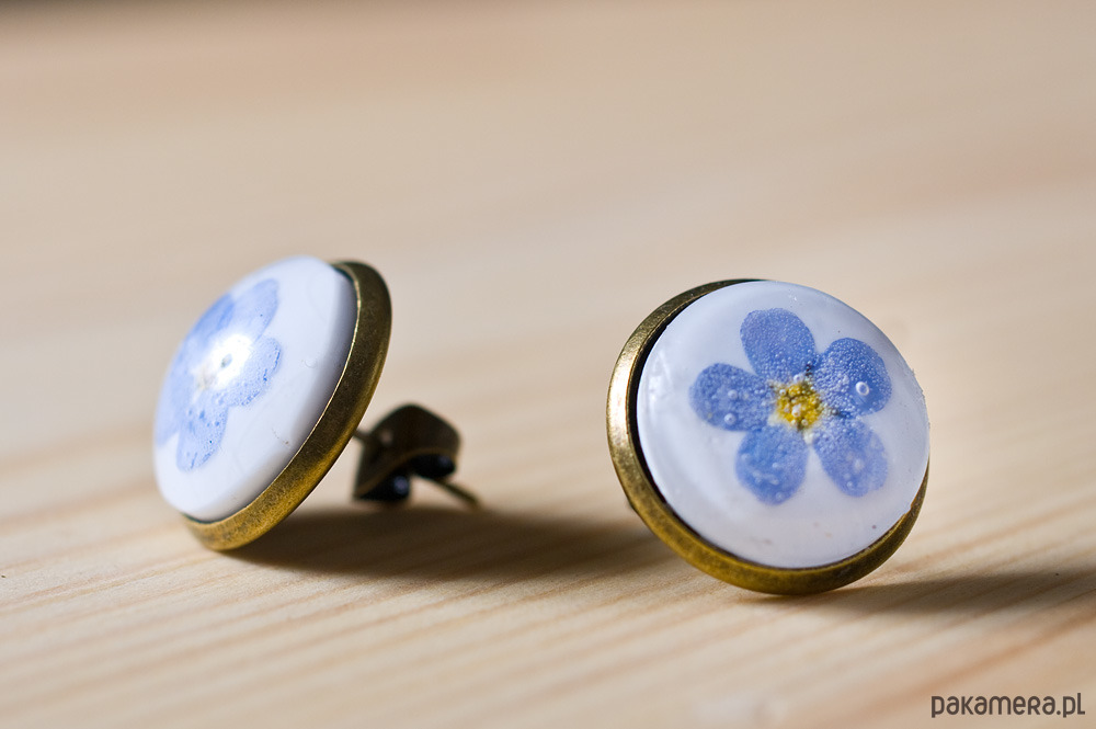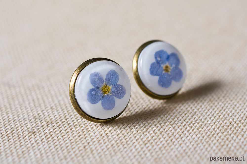 Kolczyki - sztyfty z niezapominajkami w żywicy. W tle kwiatków - żywica biała. Sztyfty i oprawa wykonane są ze stopu metali jubilerskich w kolorze starego złota ( bez niklu i ołowiu ). Produkt jest lekki i elegancki. Nasza biżuteria oparta jest na autorskich projektach. Wymiary: średnica kaboszonów: 14 mm