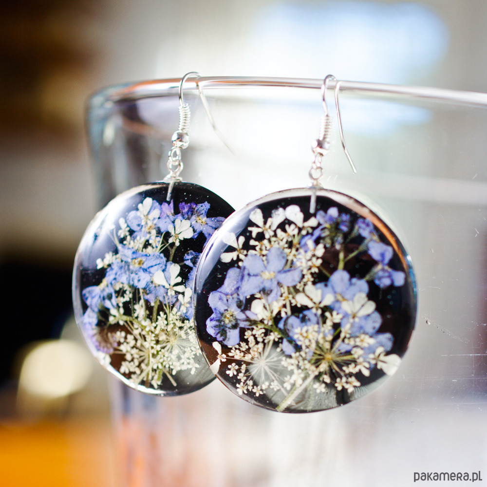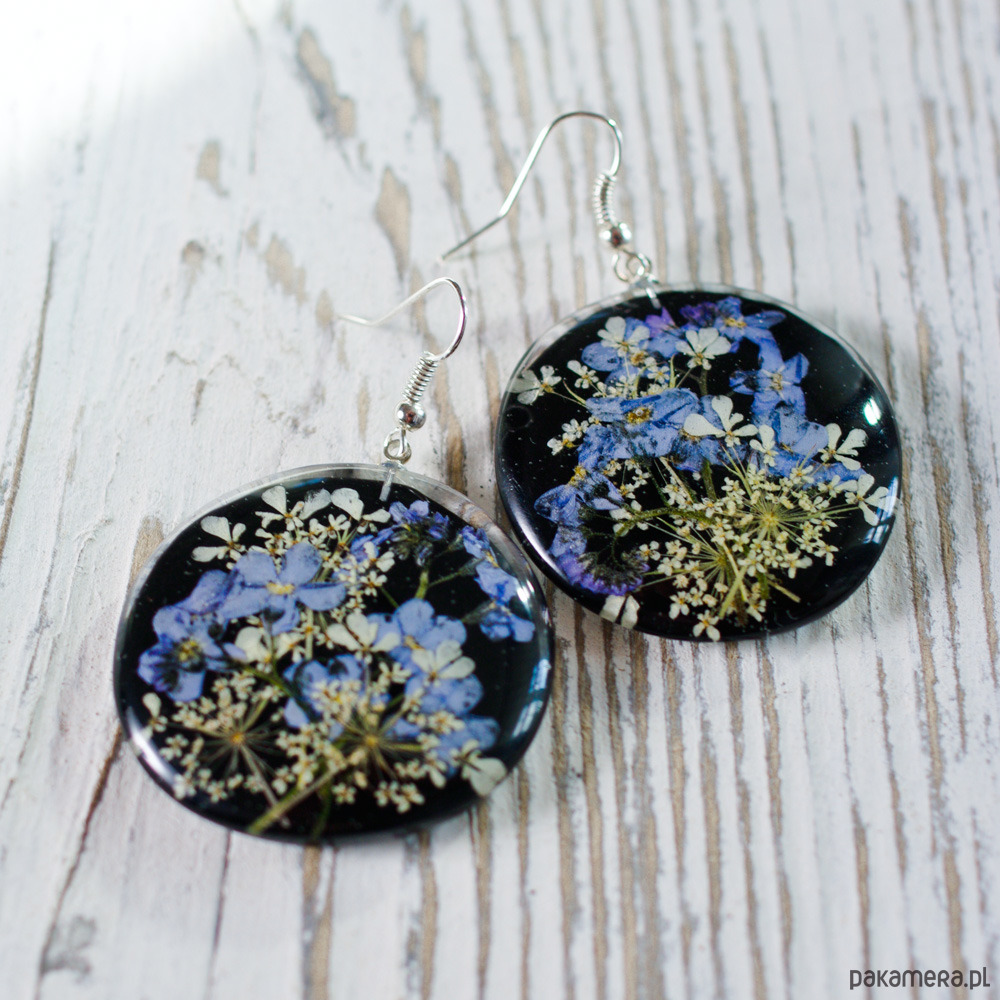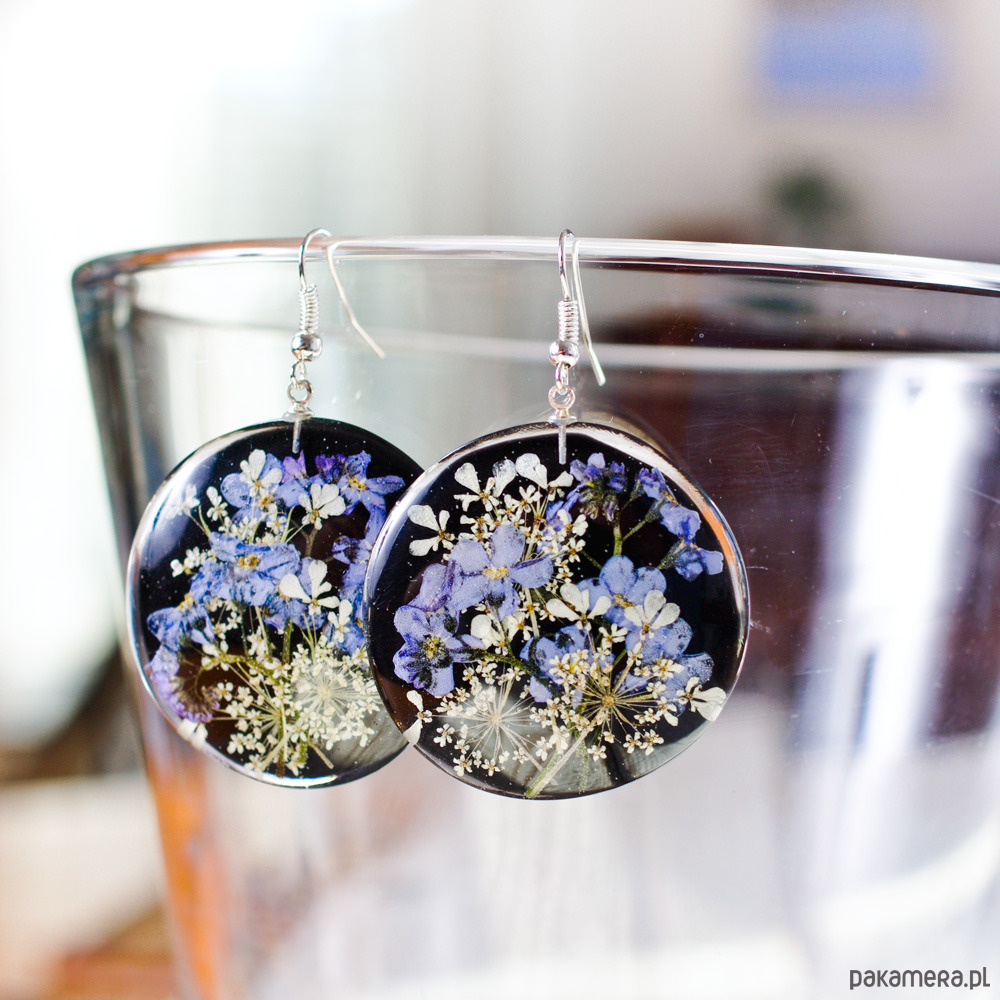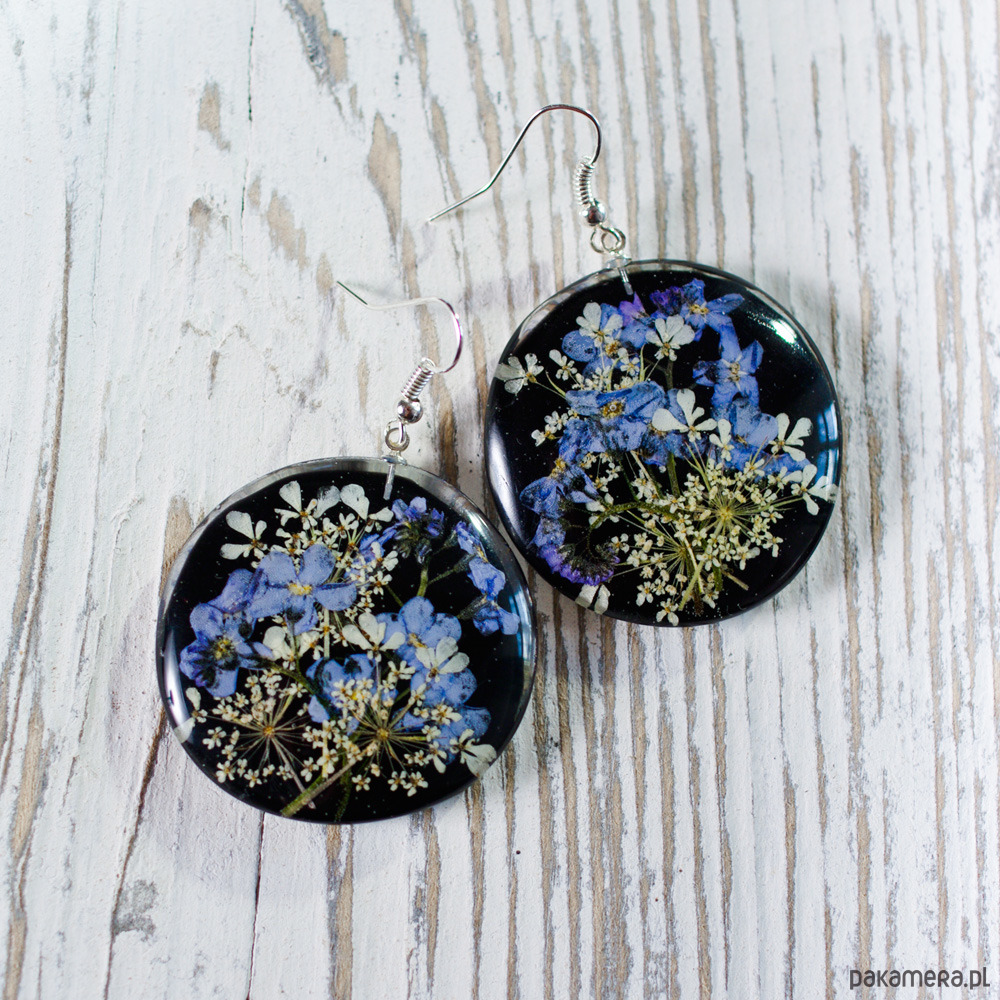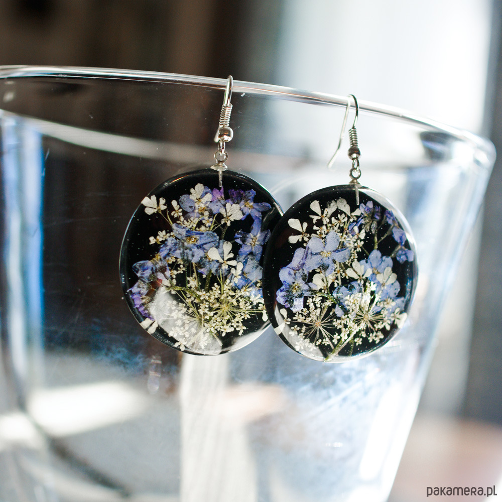 Piękne kwiaty niezapominajek i białe rozetki zatopione w krystalicznej żywicy na czarnym tle. Bigle - srebro 925. Kolczyki są duże, lekkie i eleganckie. Nasza biżuteria oparta jest na autorskich projektach i formach. Kolczyki wykonane w całości ręcznie, szlifowane i polerowane indywidualnie. Zdjęcie przedstawia oferowany produkt. Wymiary: 38 mm (bez bigli). Wykorzystane materiały: żywica, srebro, kwiaty.