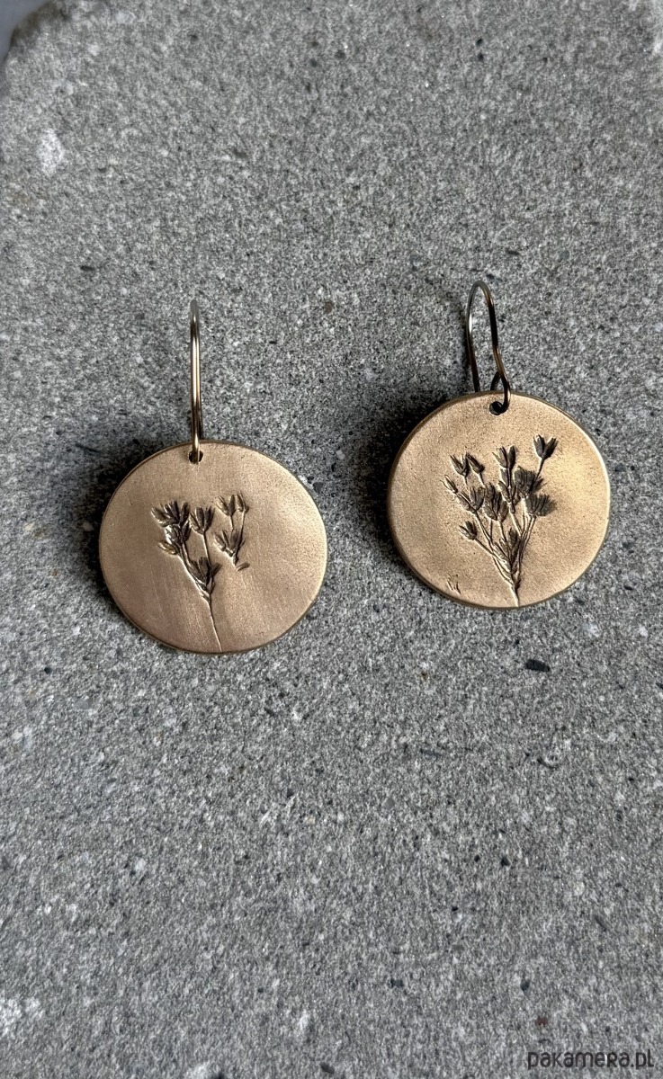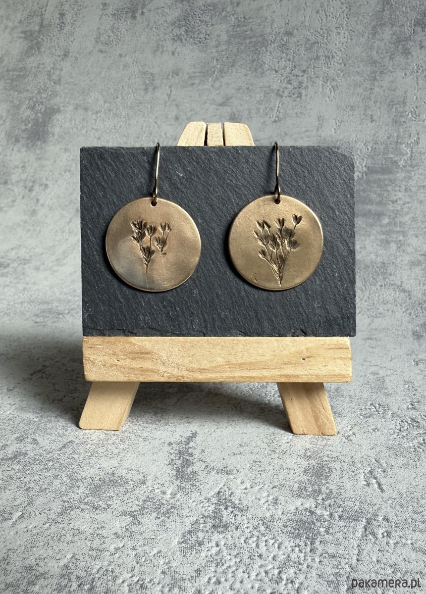 Unikatowe kolczyki z brązu z odciskiem prawdziwej rośliny.