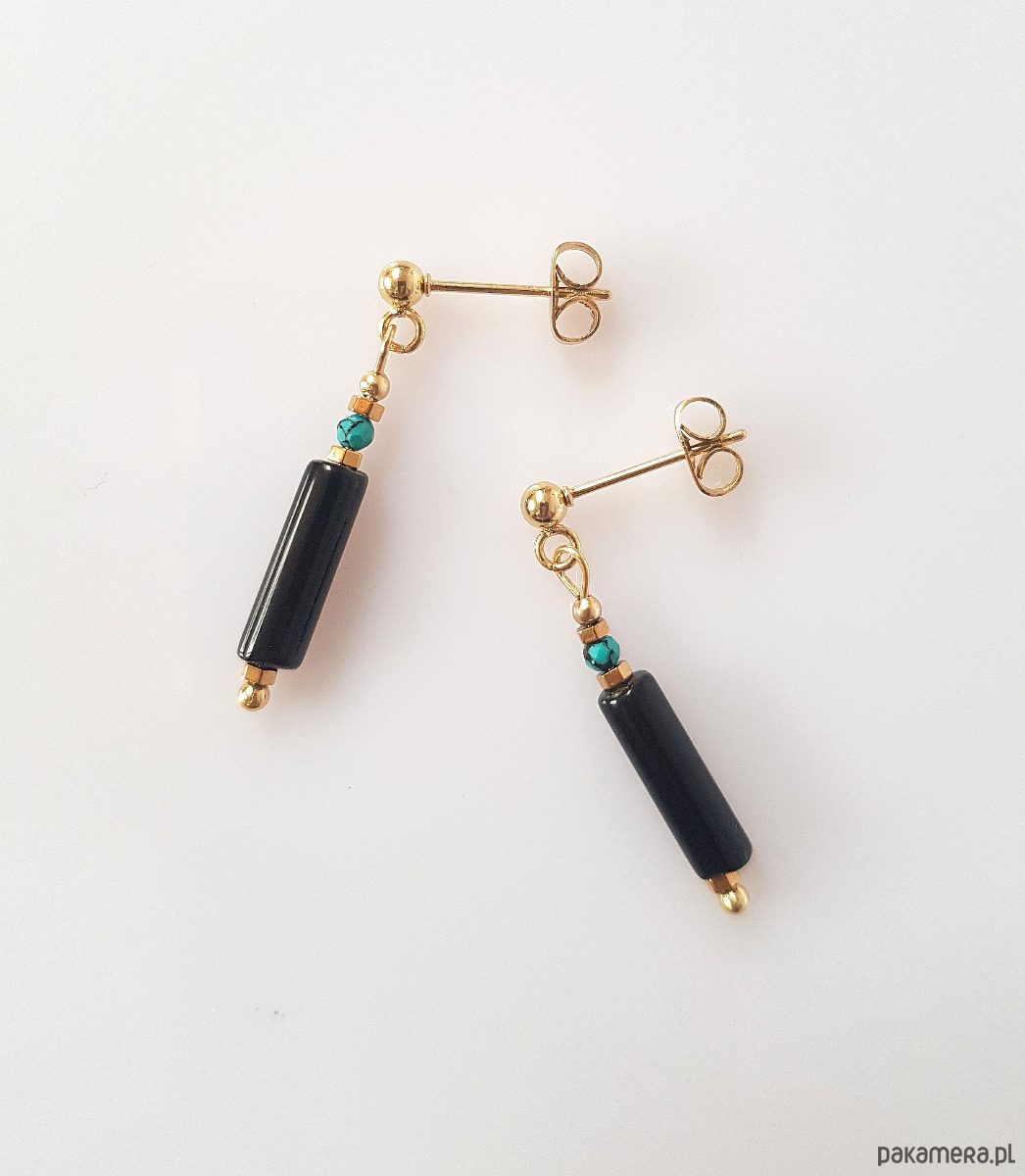 Patyczki onyksu pasiastego i drobne fasetowane kuleczki turkusowego magnezytu.