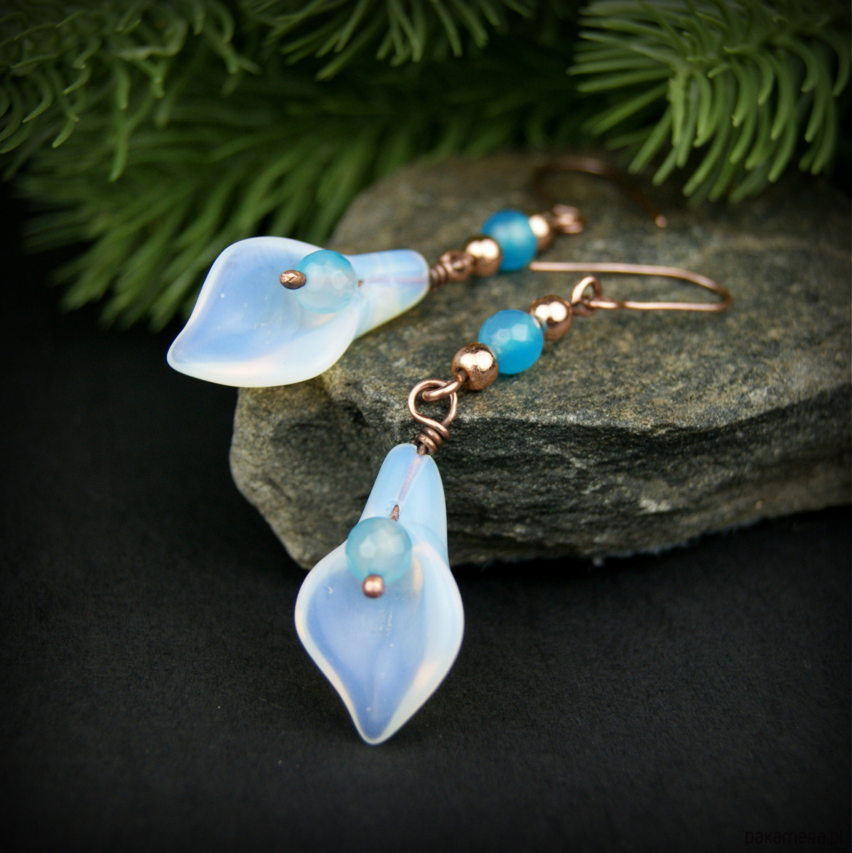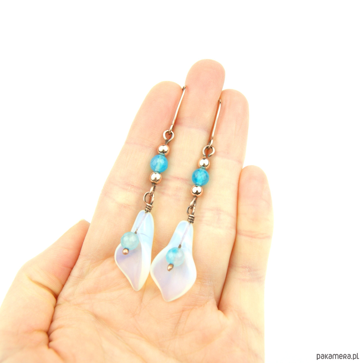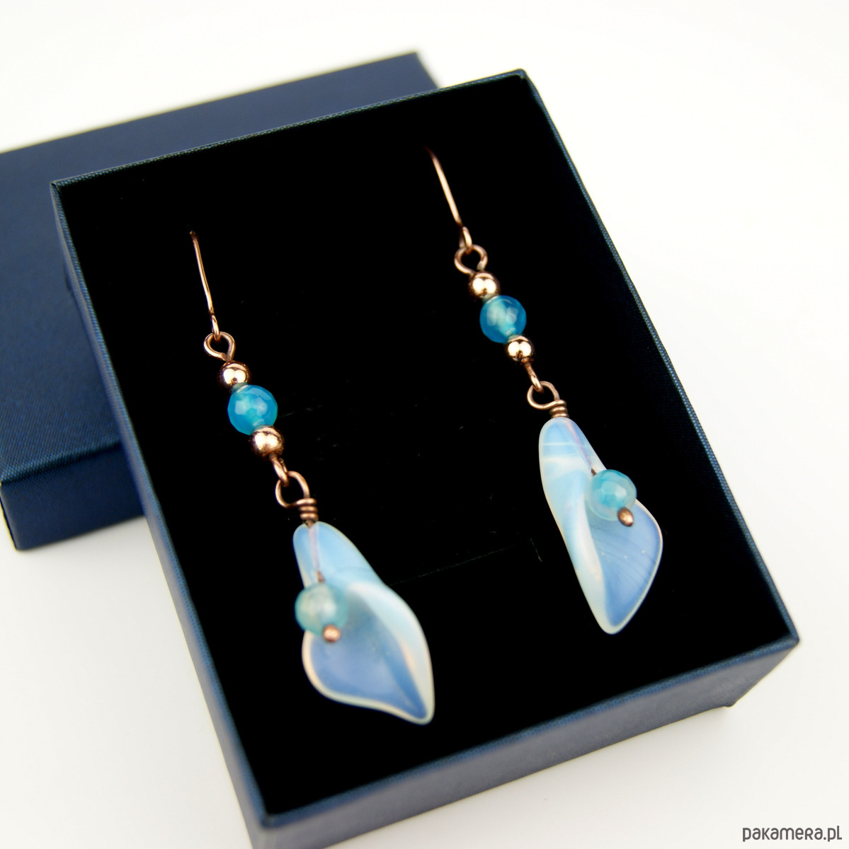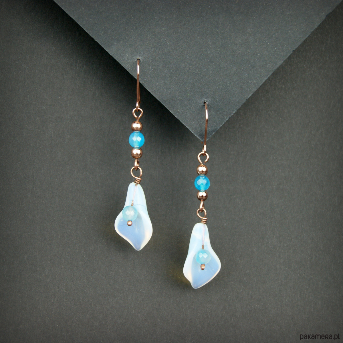 Kolczyki w całości wykonane ręcznie. Do stworzenia kolczyków użyto kamieni opalitu w kształcie kwiatu kalii, błękitnych agatów, złotych hematytów oraz drutu miedzianego, całość oksydowano. Całkowita długość kolczyków to ok 7 cm.