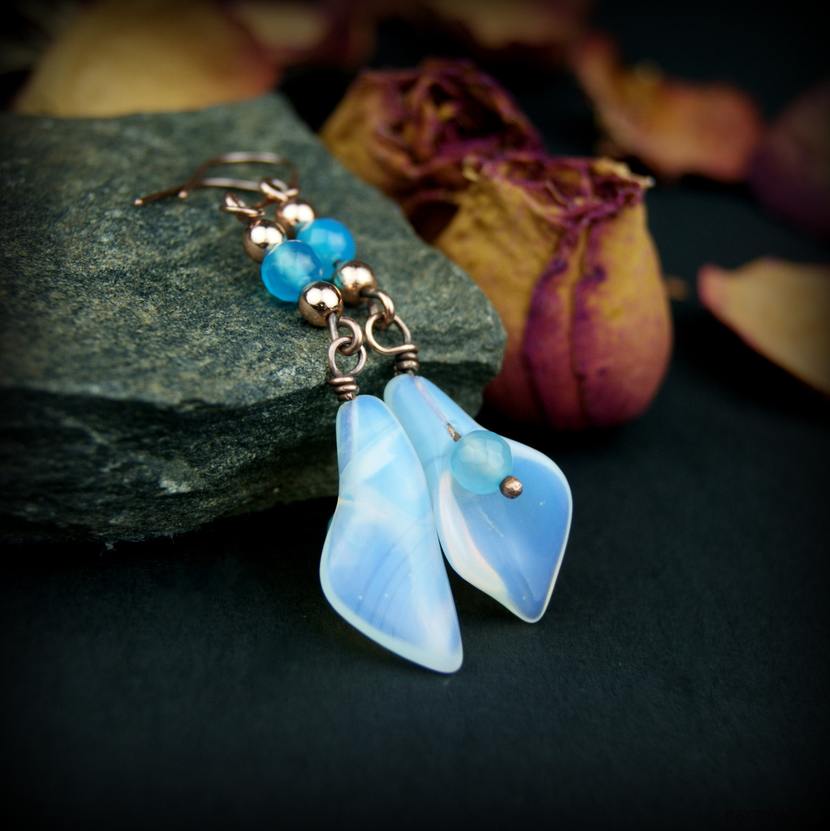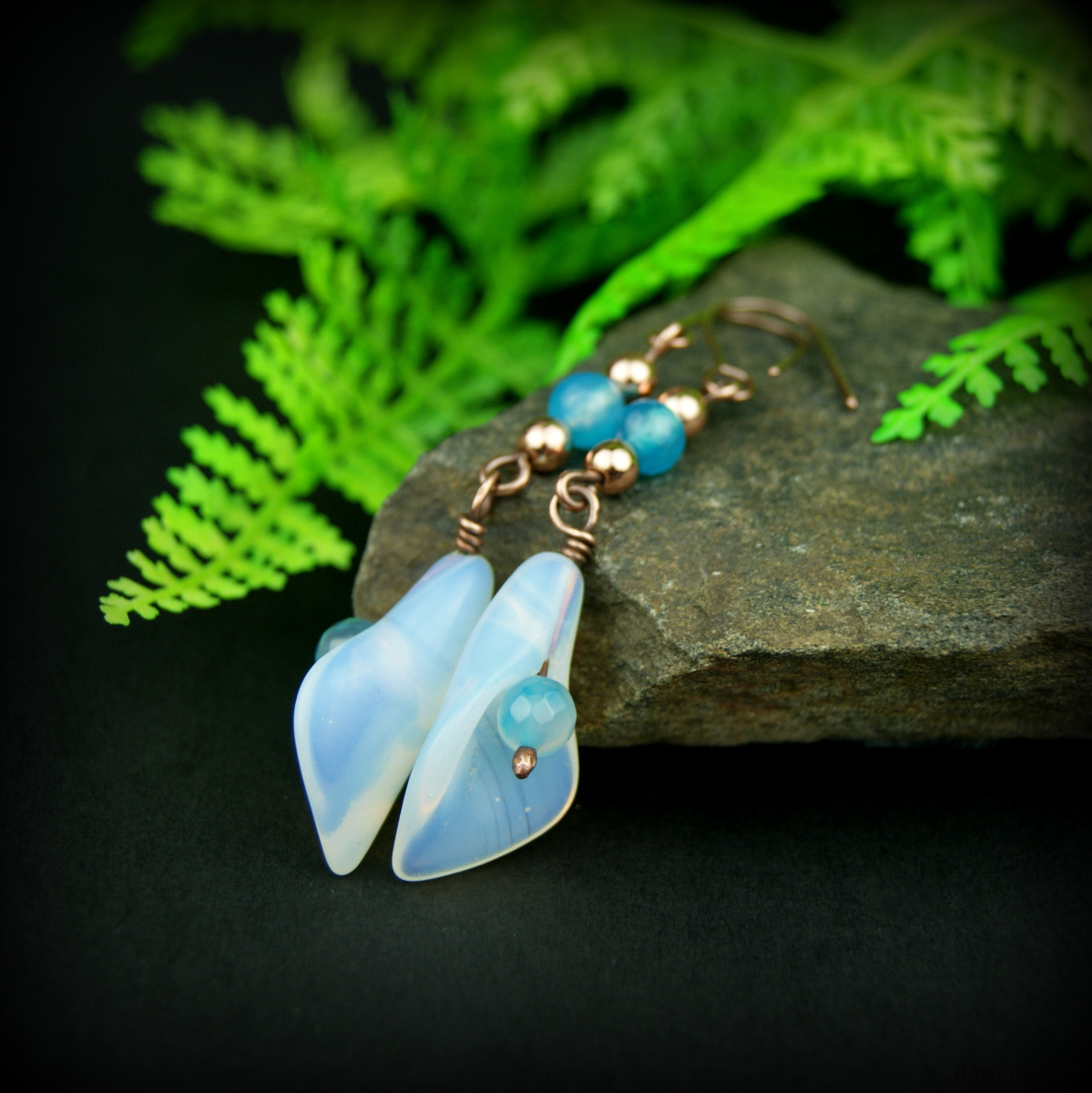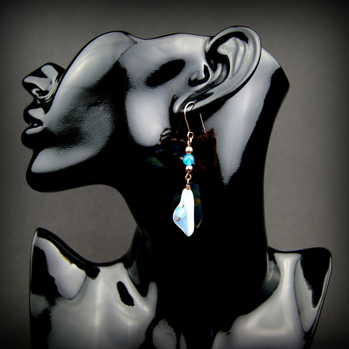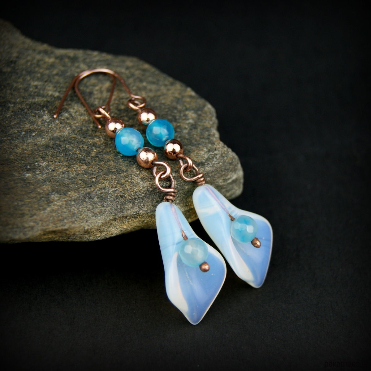 Kolczyki w całości wykonane ręcznie. Do stworzenia kolczyków użyto kamieni opalitu w kształcie kwiatu kalii, błękitnych agatów, złotych hematytów oraz drutu miedzianego, całość oksydowano. Całkowita długość kolczyków to ok 7 cm.