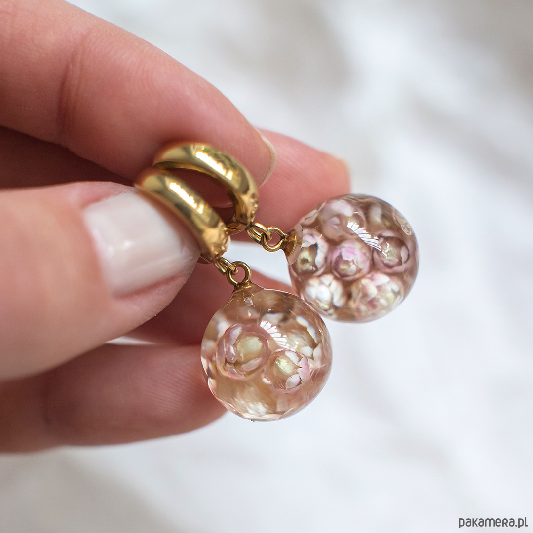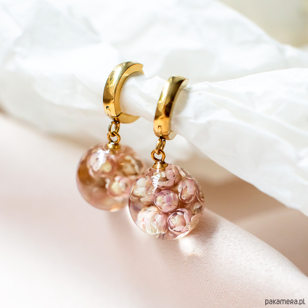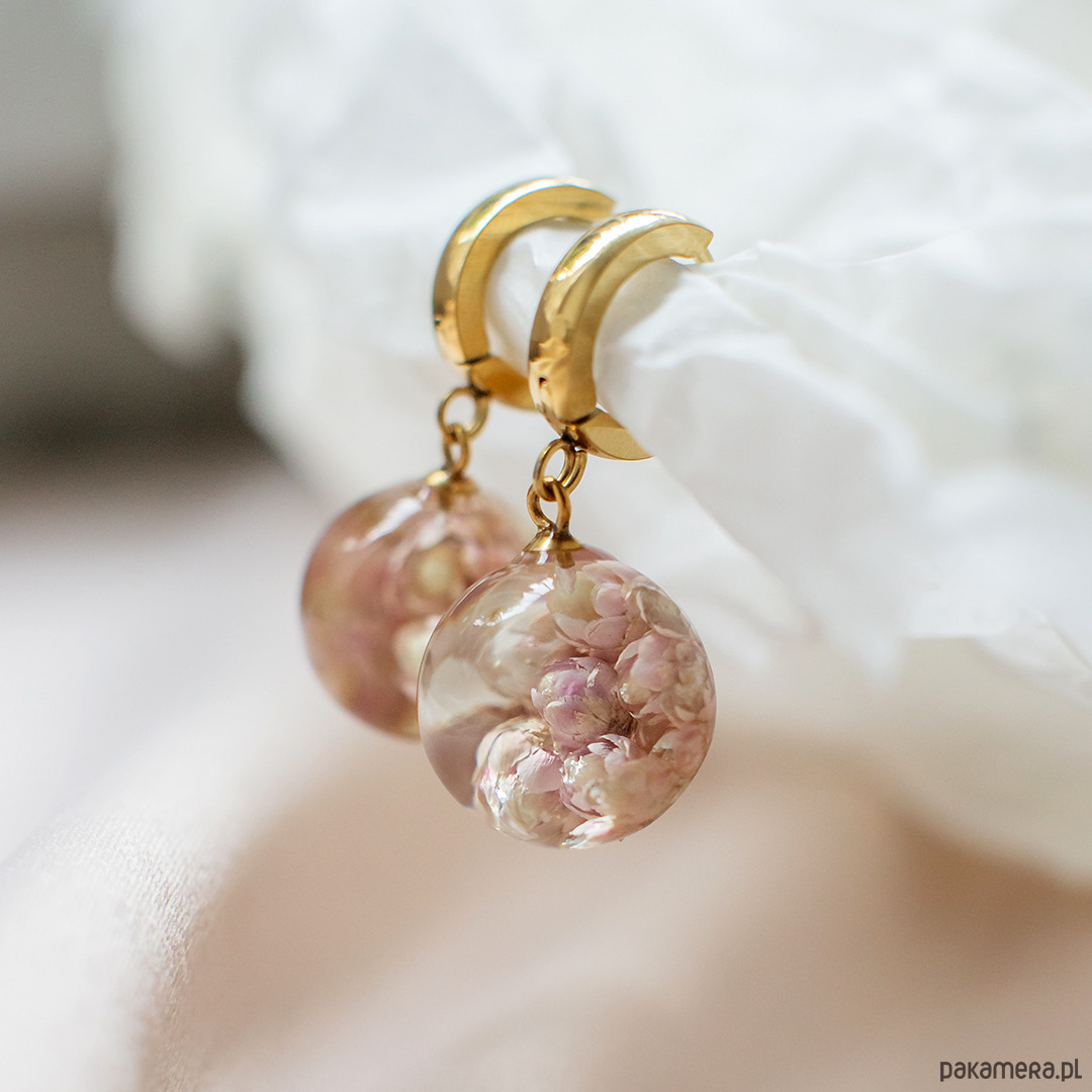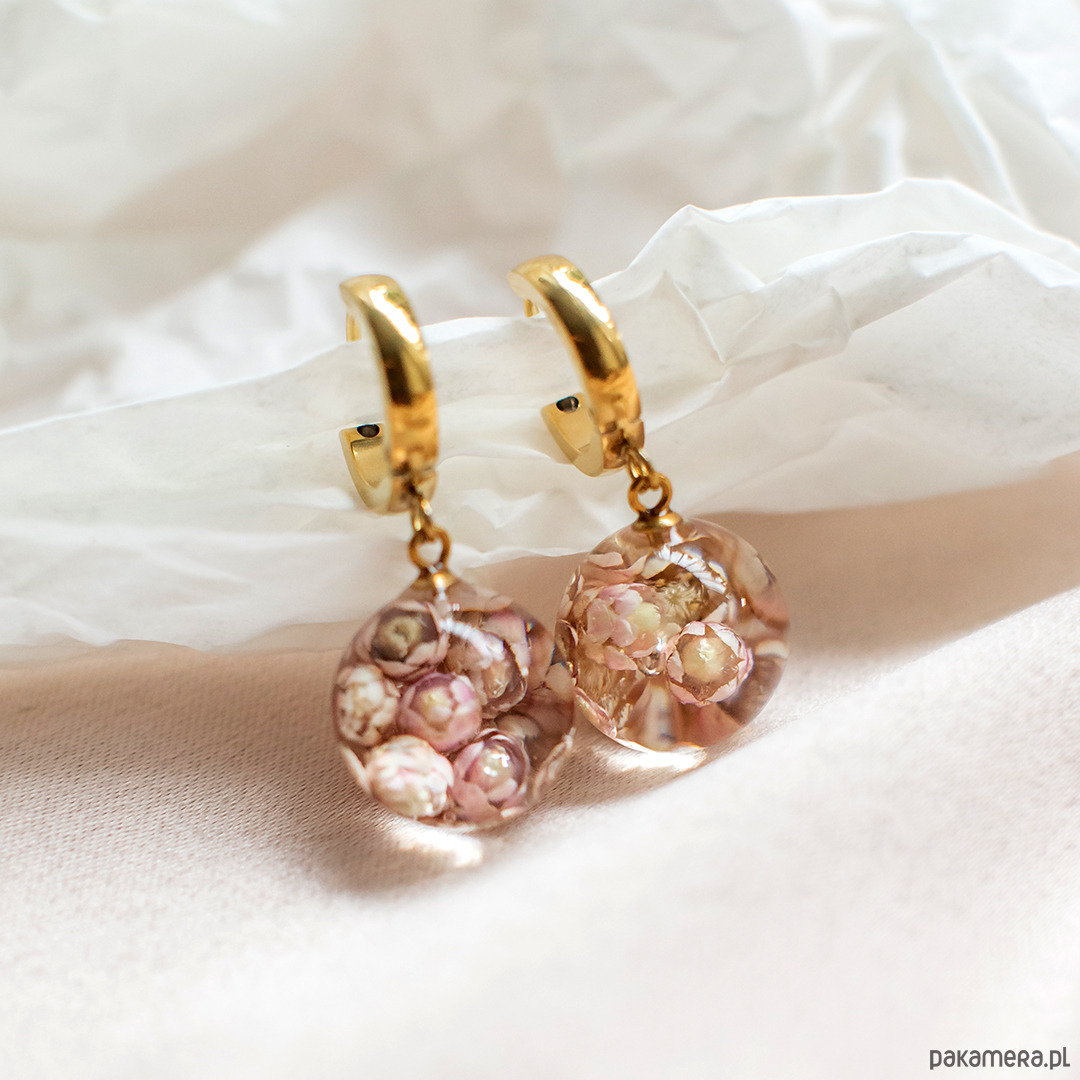 Kolczyki wykonany jest z żywicy epoksydowej z wykorzystaniem suszonych kwiatów. Metalowe elementy to stal nierdzewna szlachetna chirurgiczna.