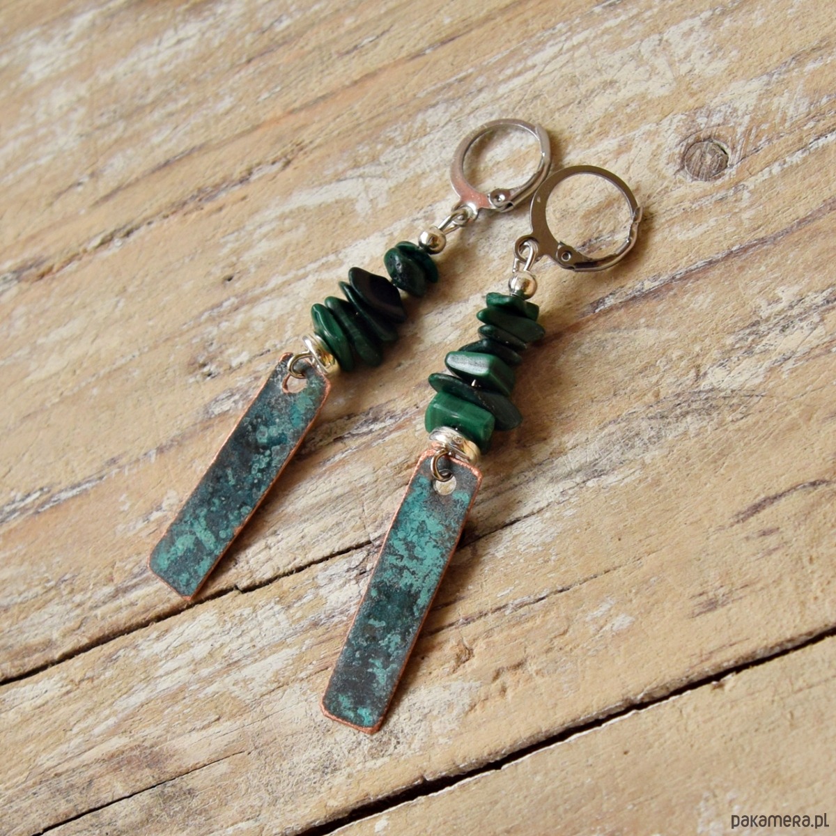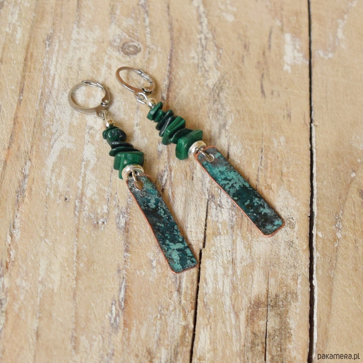 Kolczyki wykonane z patynowanej miedzi (naturalna zielona patyna) oraz malachitu, na biglach angielskich ze stali chirurgicznej.