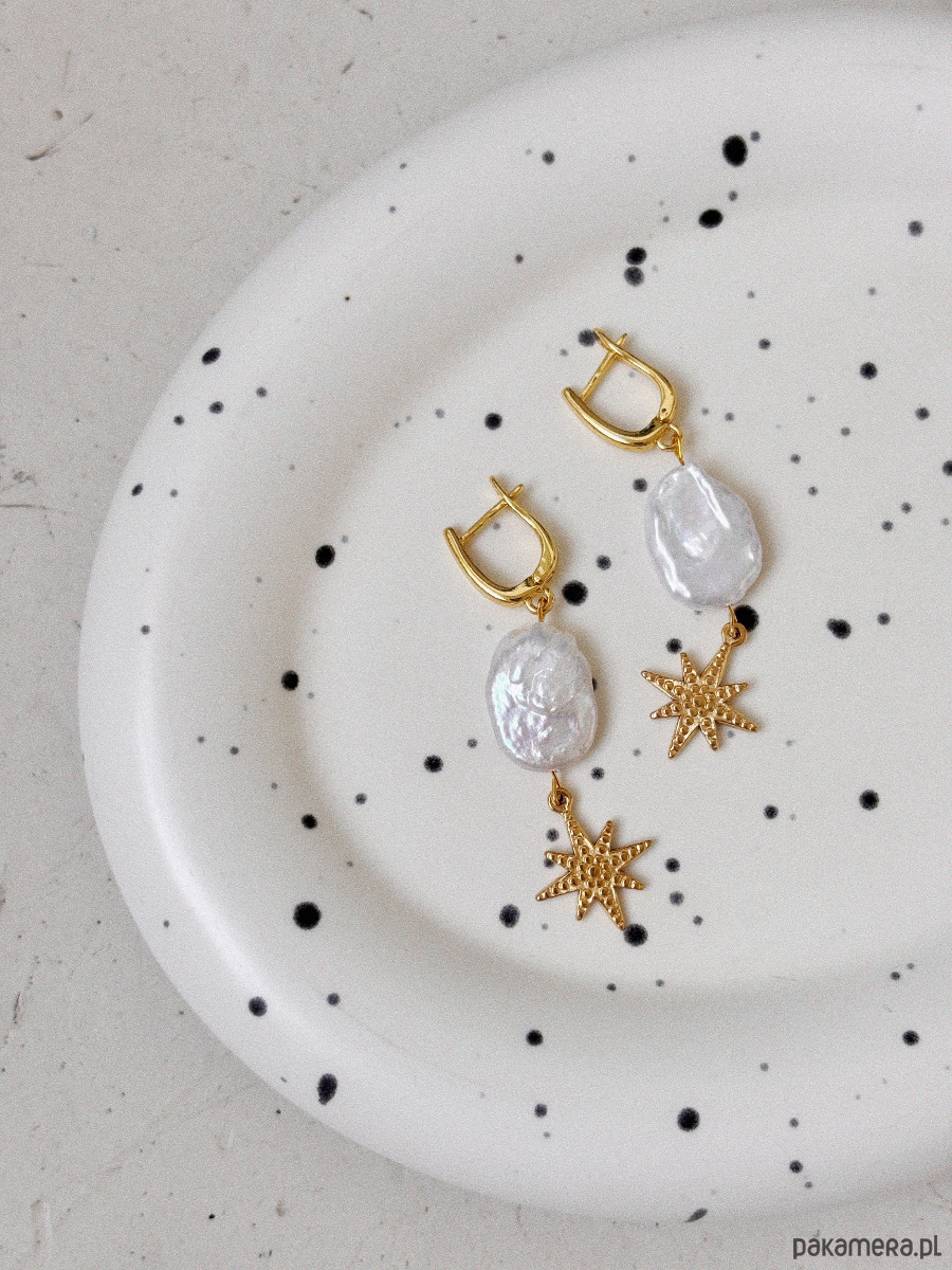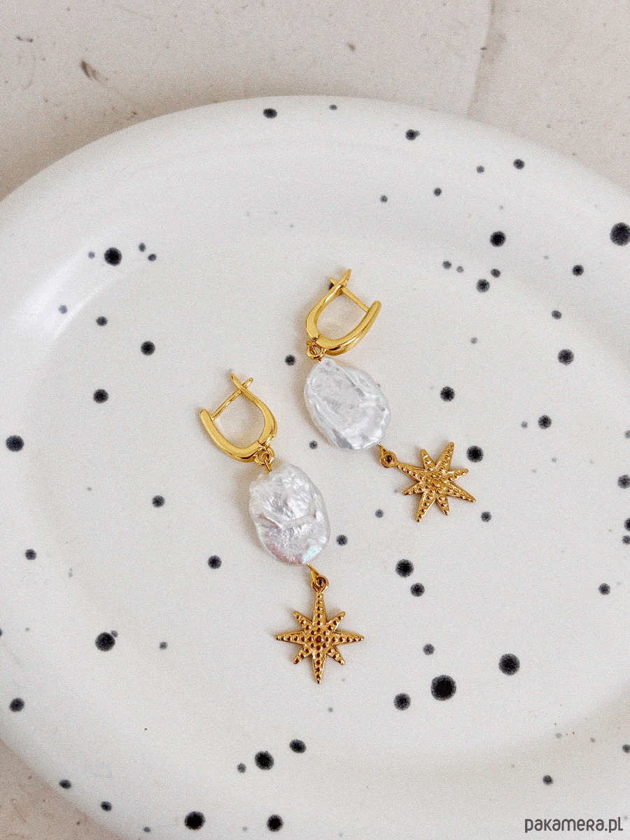 Kolczyki są wykonane ze sztyftu z mosiądzu pozłacanego i perły, a także zawieszki gwiazdki.
