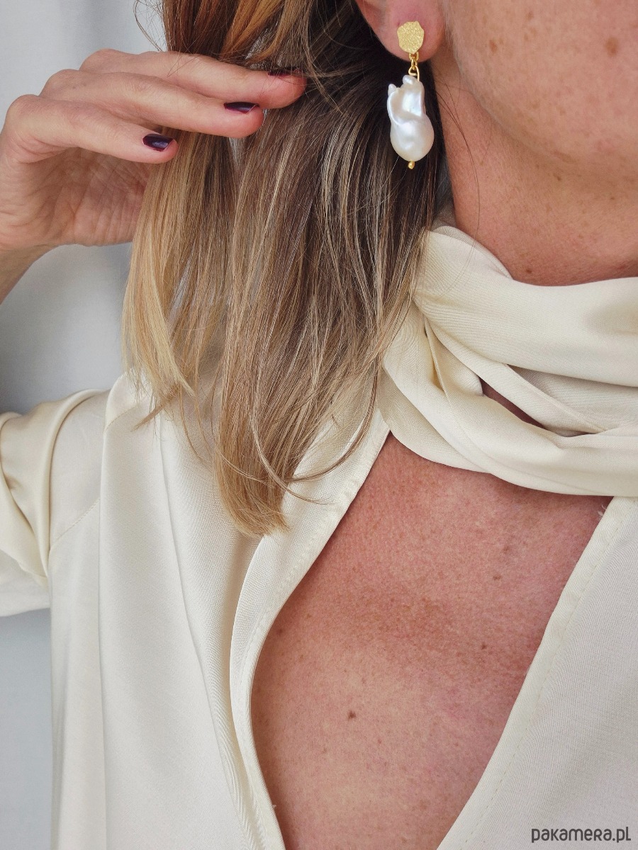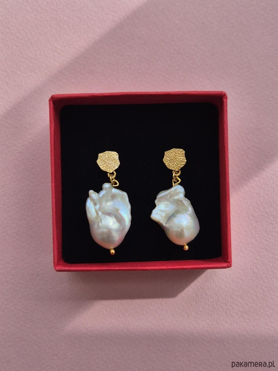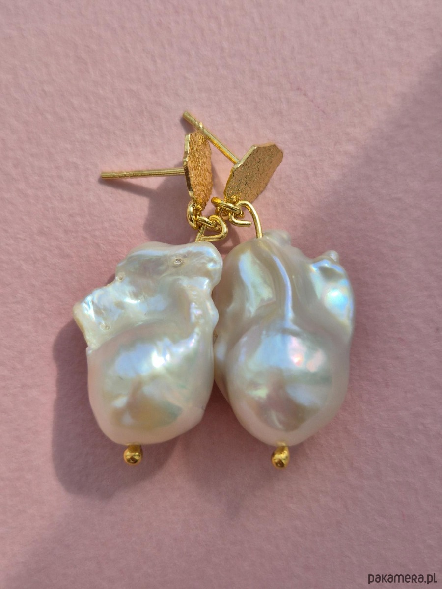 Wyjątkowo piękne kolczyki wykonane ręcznie z dużymi, barokowymi, naturalnymi perłami w kształcie welonu. Perły zostały zawieszone na ozdobnym, nieregularnym sztyfcie z gniecionego, pozłacanego srebra. Perły barokowe to wyjątkowe perły - dzikie, nieokiełznane o rozmaitych kształtach. Każda jest niepoetarzalna - nie ma dwóch takich samych. Zachwycające.