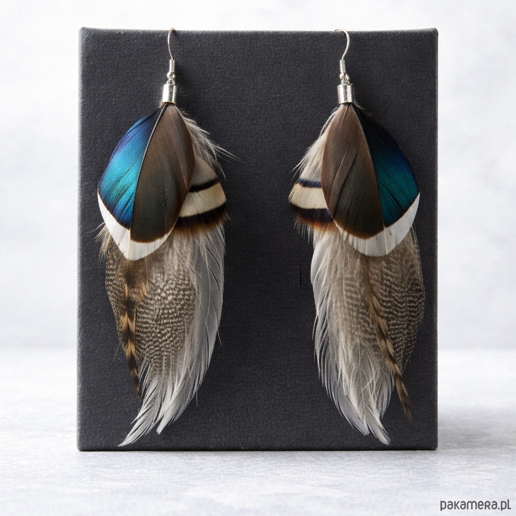Kolczyki Aura zostały wykonane z wyselekcjonowanych, rzadkich i niezwykle pięknych naturalnych piór: piór bażanta, bocznych piór kaczki o zachwycającym połysku oraz delikatnych piór w subtelne linie. Ich wielowymiarowa faktura i szlachetna kolorystyka tworzą wyjątkowo lekką, a zarazem wyrazistą kompozycję. Kolczyki doskonale uzupełniają zarówno codzienne, jak i wieczorowe zestawy.