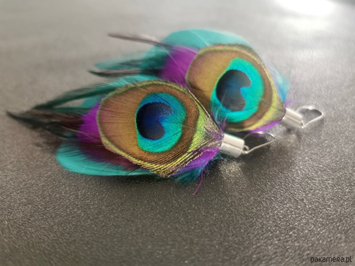 Kolczyki Iris zostały wykonane ręcznie z wyselekcjonowanych, niezwykle pięknych naturalnych piór. Wykorzystują kontrast pawiego pióra opalizującego na niebiesko, zielono i granatowo z kolorowymi piórami w kolorze morskim i fioletowym.