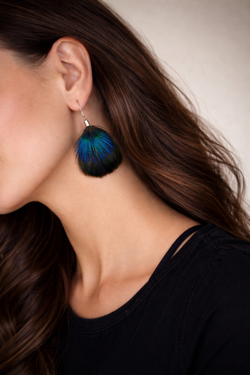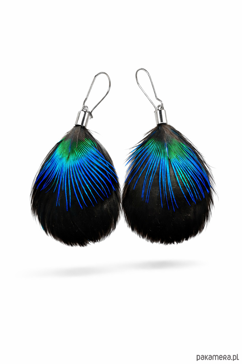Kolczyki Lumen (łac. lumen – światło, blask) wykonane są z naturalnych piór, w tym niezwykle efektownych szyjnych piór pawia, które zachwycają delikatnym, zmiennym połyskiem.